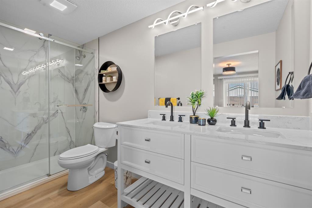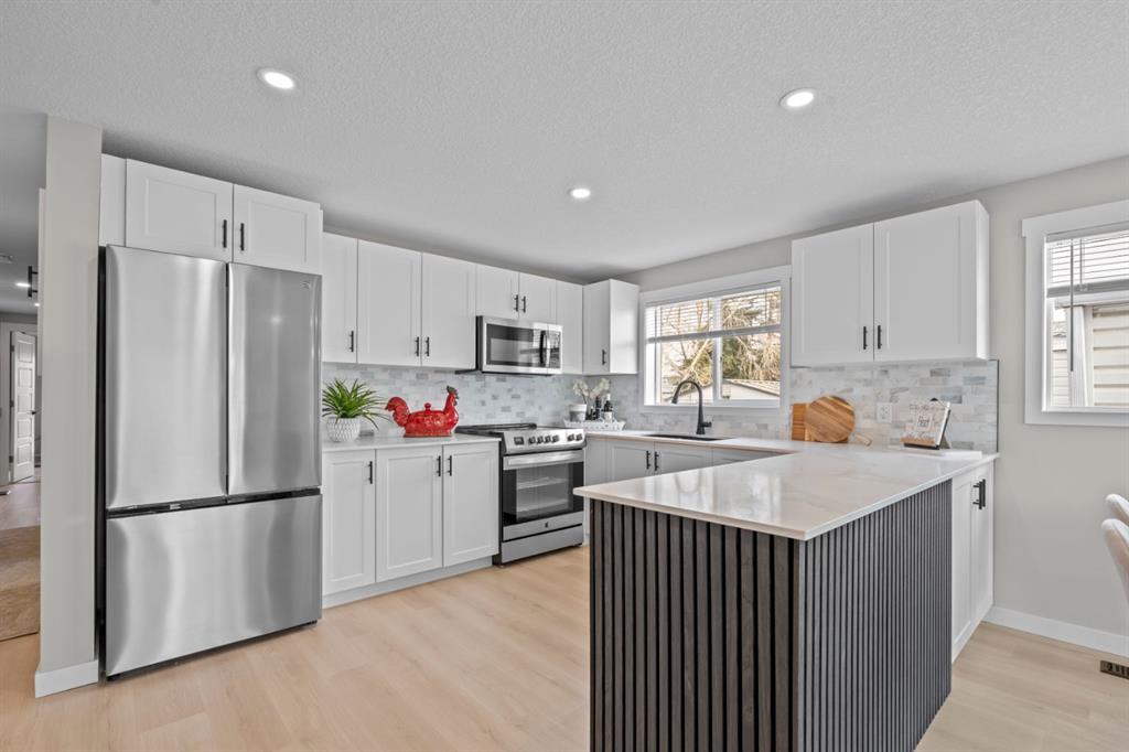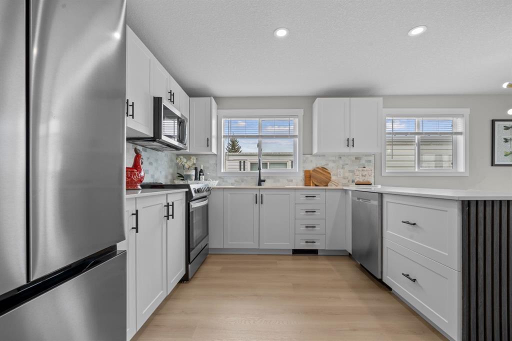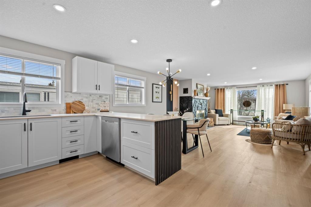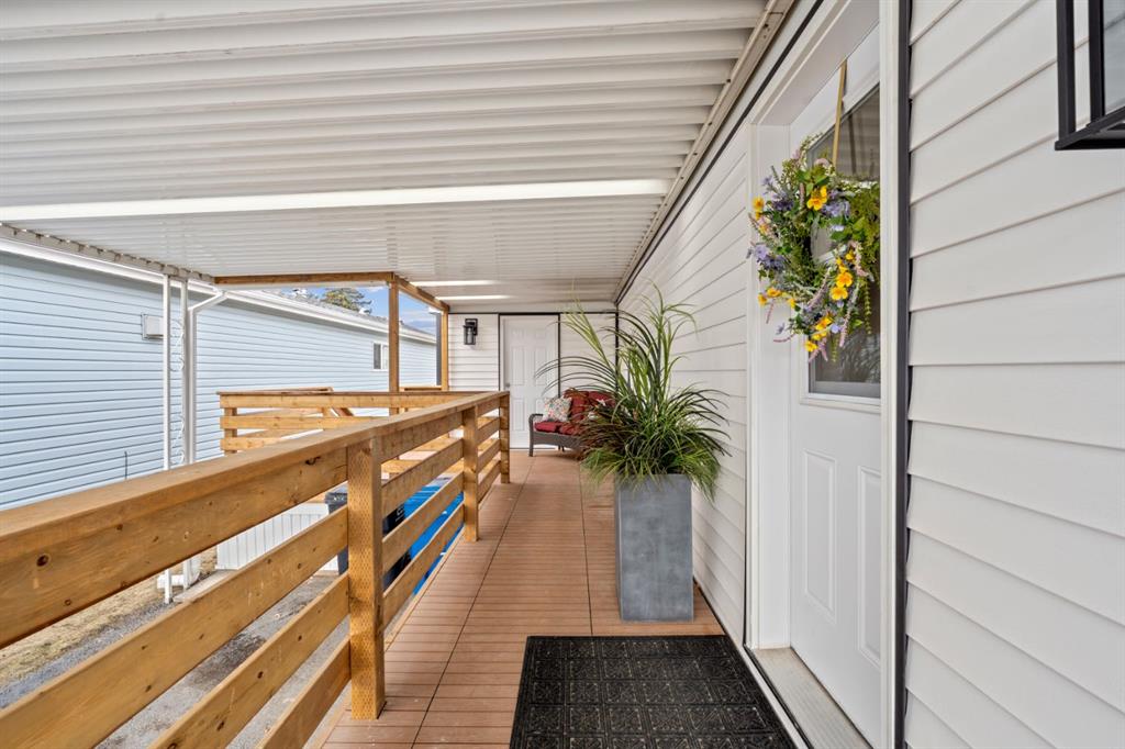 Welcome to this fully renovated mobile home in Watergrove the premiere 45+ Park in NW Calgary, offering a beautifully landscaped environment, green spaces and walking paths, and a well maintained community. This home is in a quiet cul de sac, steps to a walking path, has a large carport, and has been completely renovated with an open concept, redesigned floor plan, two bedrooms, two bathrooms, walk-in closet, and separate laundry and mudroom, living room, dining area and large kitchen. Inside is bright and spacious, has a modern aesthetic with laminate flooring throughout, fully drywalled interior, knockdown ceiling, pot lights, new interior and exterior doors, new baseboard and casing, and two new bathrooms were constructed from one, providing new tub, shower, toilets, vanities and fixtures. The big ticket items have been done, which includes a new furnace, new plumbing with PEX waterlines, new windows and doors, exterior siding, front deck with Acacia tile decking, and new back deck off the primary bedroom. The all new kitchen has shaker style cabinets, quartz countertop, separate coffee bar, new stainless steel appliances including a slide-in induction stove, tile backsplash, black granite composite sink, and a large island offering extra workspace and storage. The ample dining area and spacious living room (with a wood-burning fireplace), provides space for comfortable daily living, with large windows bringing in lots of light. The primary bedroom has new patio doors leading out to the deck, 4 pce ensuite with walk-in shower and double sink vanity, and a large walk-in closet with built-in shelving. The second bedroom is a good size and could be used as an office/flex room. The laundry room is conveniently situated in the mud room with double doors to close it off when not in use. The mudroom also has an entry from the front deck. The fabulous clubhouse at Watergrove offers an outdoor pool, dry sauna, indoor hot tub, recreation room/party room, exercise room, games room with billiard tables , lending library, and enough activities to keep you busy every day. Watergrove has many walking paths throughout the Park, and the community of Arbour Lake has almost every amenity imaginable. Lot rent of $895 includes water, sewer, garbage pick up and snow removal. Lease approval is required, and pets are welcome with approval.