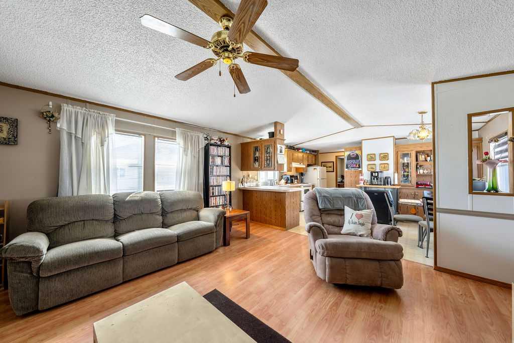 Unique opportunity to own a well-maintained 1108 square foot single-wide mobile home set on a generously sized pie-shaped lot. Built in 1992, this home offers functionality along with an additional 8 x 12 ft attached storage space that is perfect for seasonal items, tools, or extra storage needs. The cozy interior features an open-concept layout with vaulted ceilings that create a bright, spacious and welcoming atmosphere throughout the main living area. You'll also appreciate the abundance of cabinetry and generous counter space, ideal fo everyday living and entertaining. The thoughtful layout includes three bedrooms and two full bathrooms, both generously sized to accommodate families, guests, or a home office setup. Additional value is found in key updates, including a roof approximately 8 years old and a furnace approximately 9 years, both offering peace of mind for years to come. This home also comes with several added inclusions such as a deck box, entertainment center, and a window A/C unit, making it move-in ready with added convenience. Enjoy living right in the heart of Okotoks, just steps from parks, pathways, historic downtown, the recreation centre, and shopping. Lot fees of $1,277/month include water, sewer, garbage, compost, recycling, and snow removal. Buyer approval is required by Cove Communities (see member remarks for additional details). Don’t miss this rare opportunity to enjoy open concept living, tons of storage, and the quaint lifestyle of Okotoks.