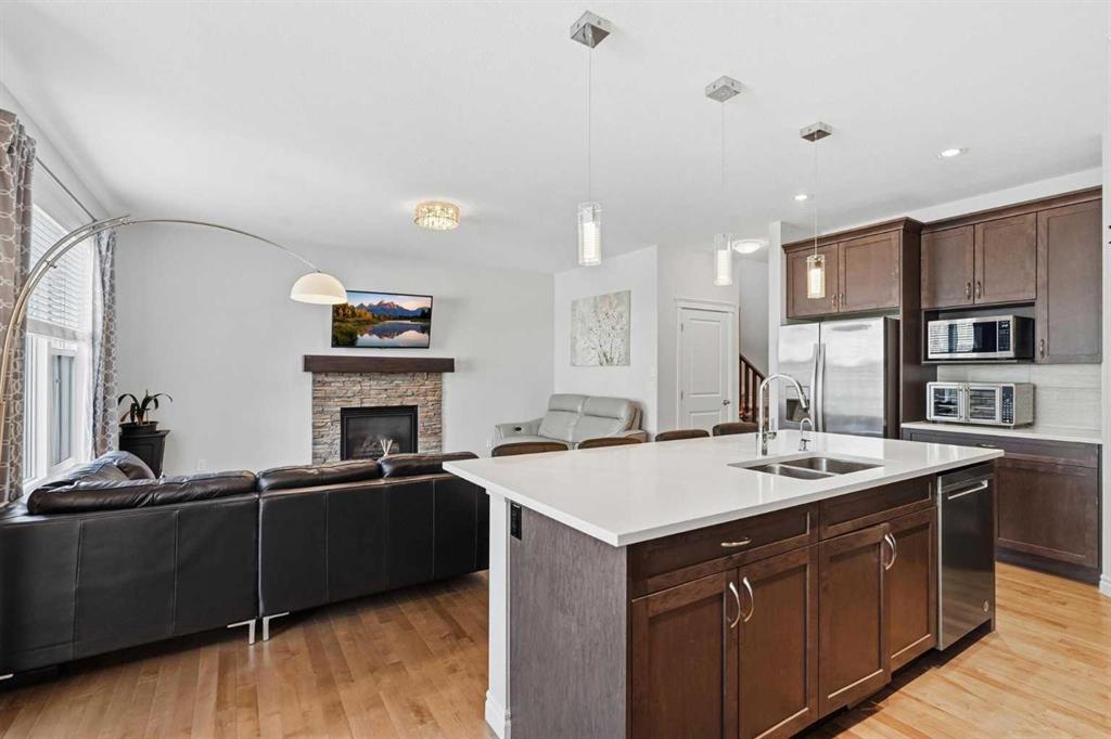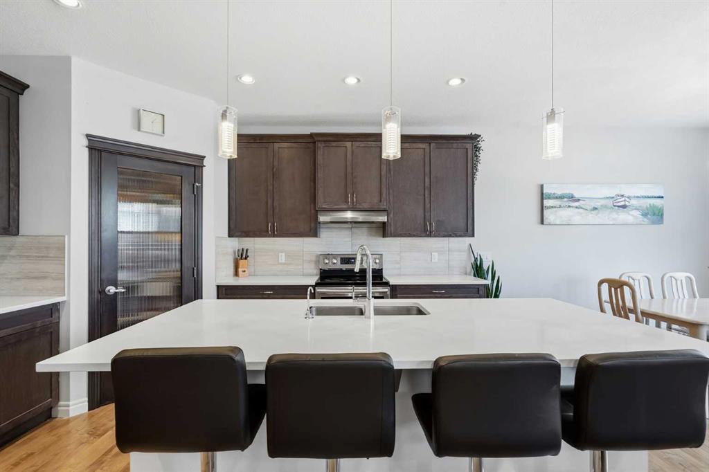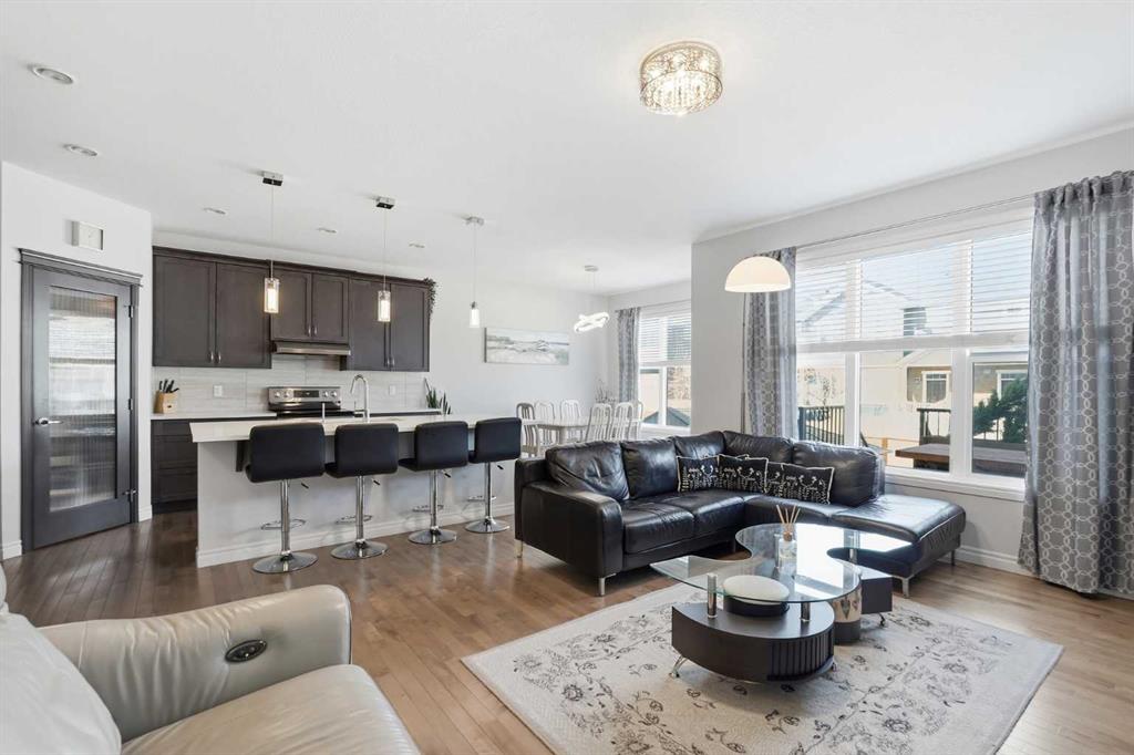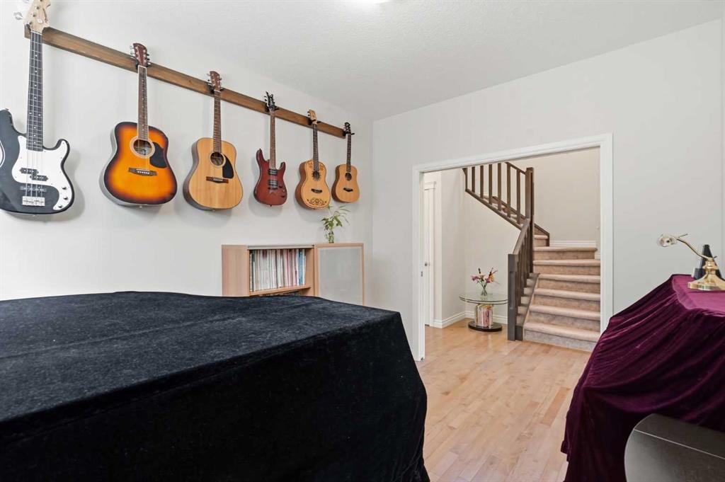 Welcome to this beautifully maintained, original-owner home, ideally located on a quiet street in a highly desirable family-oriented community. Lovingly cared for over the years, this property offers a perfect blend of comfort, functionality, and flexibility for modern family living. The main floor features a bright and airy open-concept layout with 9-foot ceilings and large windows that fill the space with abundant natural light. Elegant hardwood flooring runs throughout, complemented by upgraded light fixtures for a clean and contemporary feel. A versatile front den/office provides the perfect space for working from home, studying, hobbies, or a children’s play area. The main level also includes a spacious living room, a well-appointed kitchen, and a convenient powder room. Upstairs, you’ll find FOUR well-designed rooms offering incredible flexibility for growing families or multi-purpose living. The spacious primary bedroom includes a private ensuite, while two additional bedrooms and a fourth bonus room - ideal as a recreation room, office, or fourth bedroom - complete the level. A full guest bathroom and a convenient second-floor laundry room with ample shelving and storage space add to the home’s practicality. All bathrooms are upgraded with quartz countertops and under-mount sinks, combining style with ease of maintenance. The fully finished basement expands your living space with a large recreation area, an additional bedroom with large windows, a full bathroom, and a separate side entrance. Step outside to enjoy the recently upgraded backyard, featuring fresh landscaping, a beautiful deck, and a lush lawn - perfect for relaxing or entertaining. A back lane provides added convenience and the potential for parking an RV, boat, or additional vehicles right in your own backyard. Recent upgrades: Roof, siding, and gutters (2025). Located within walking distance to schools, grocery stores, restaurants, and everyday amenities, with quick and easy access to Stoney Trail, this home offers both comfort and convenience in one exceptional package. Don’t miss this fantastic opportunity - book your showing today!