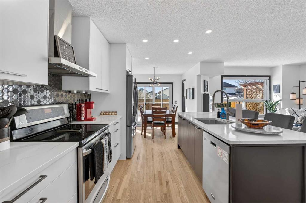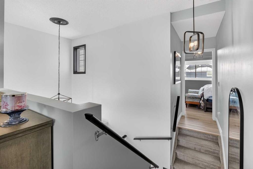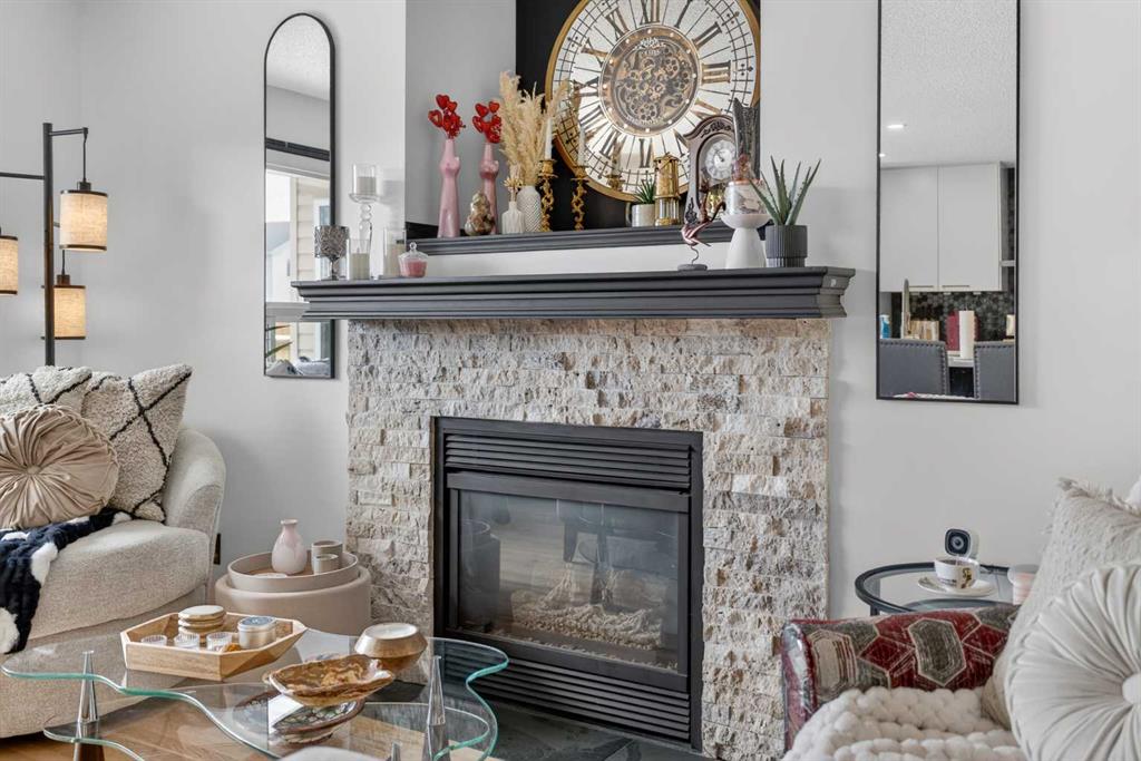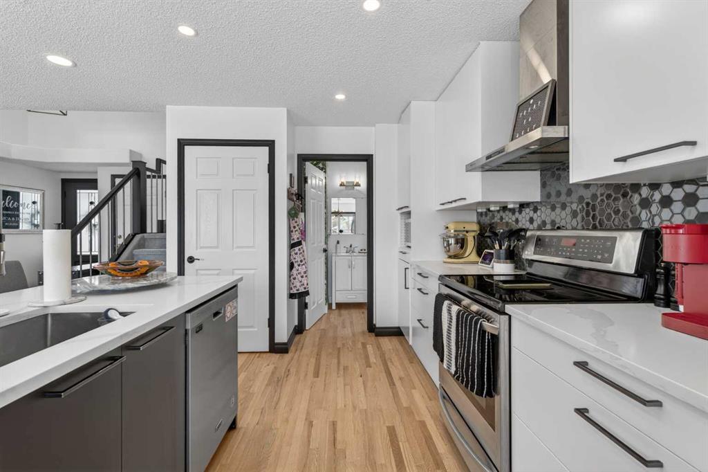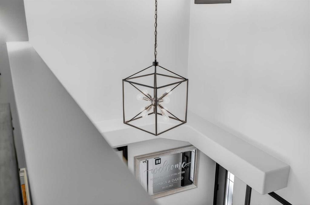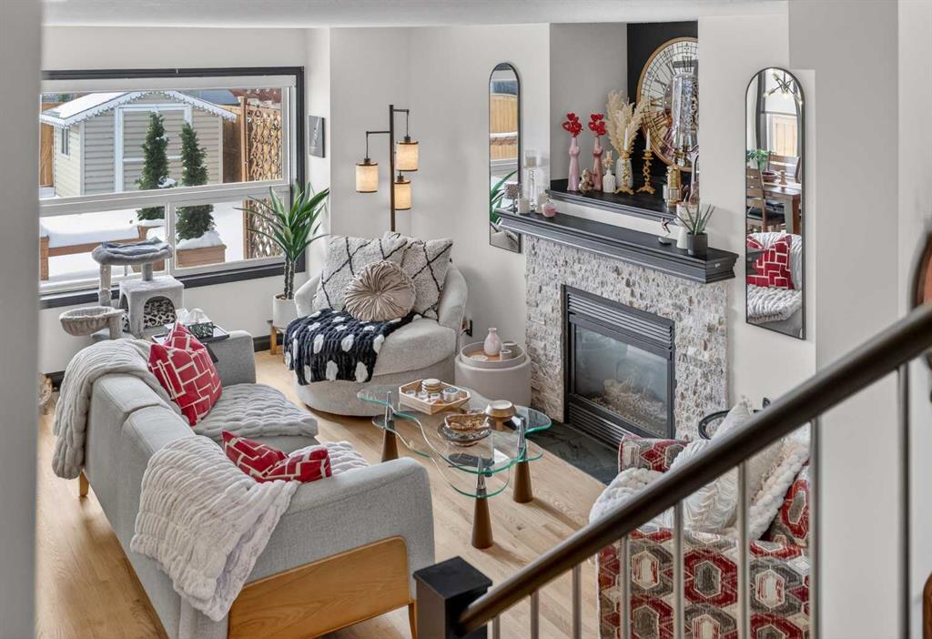 A modern cubism-inspired chandelier welcomes you at the front entry, complemented by a stunning new front door. The main floor features an open-concept layout with a fully updated kitchen (2019), complete with newer cabinetry, quartz countertops, a stylish backsplash, updated appliances, and LED pot lighting—creating a bright and inviting space. A beautifully executed gas fireplace in the living room, along with refinished original hardwood flooring, adds to the home’s warm and homely feel.