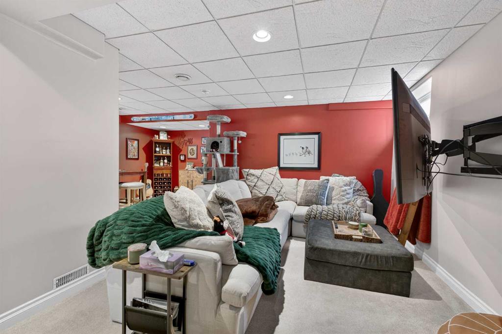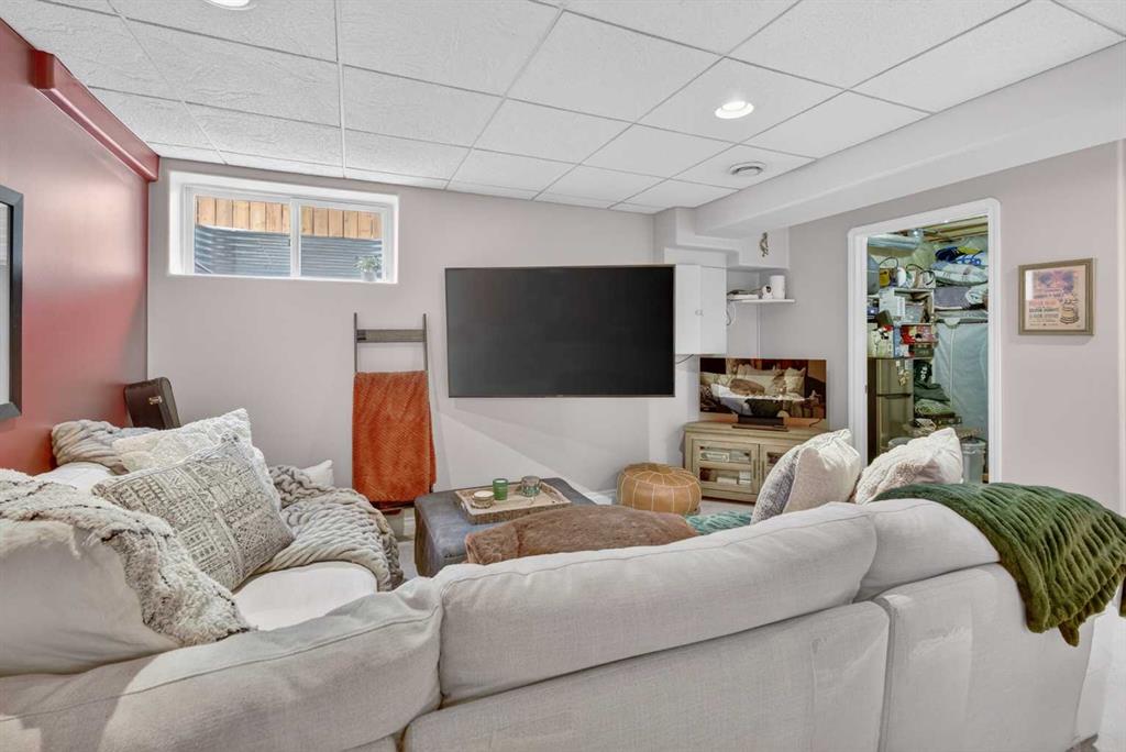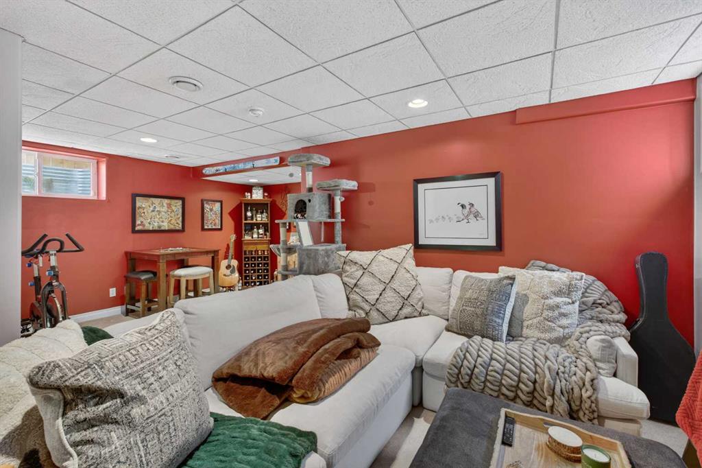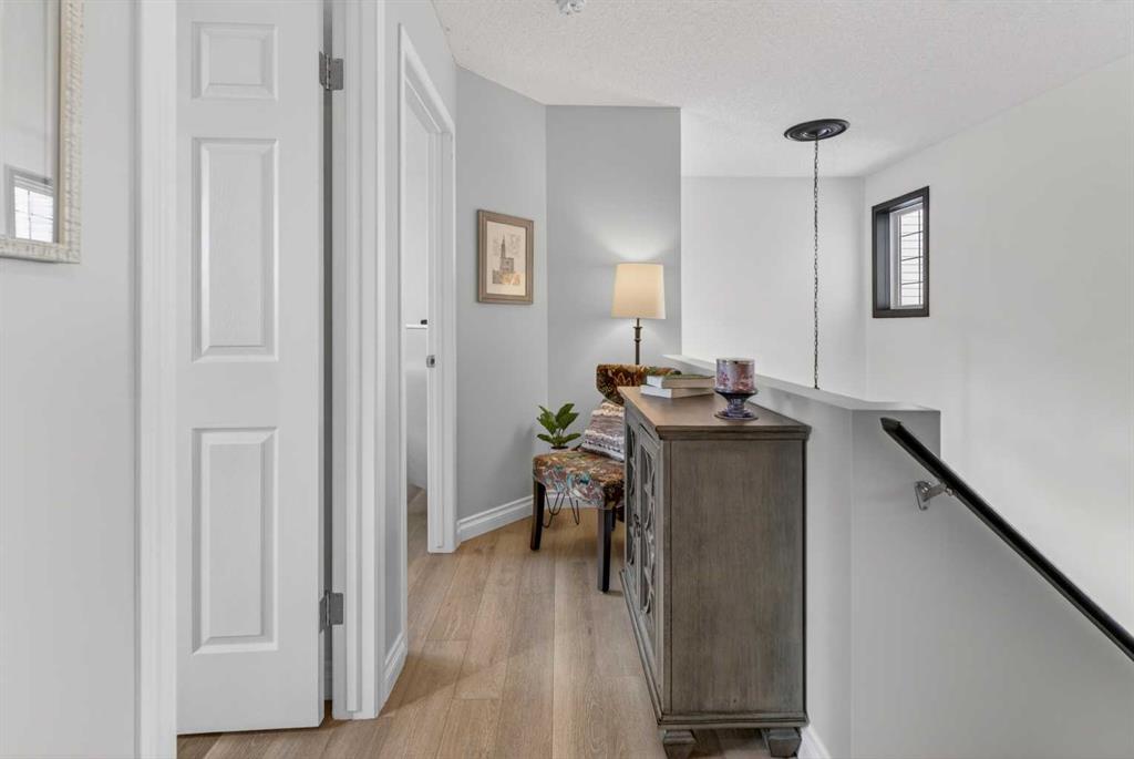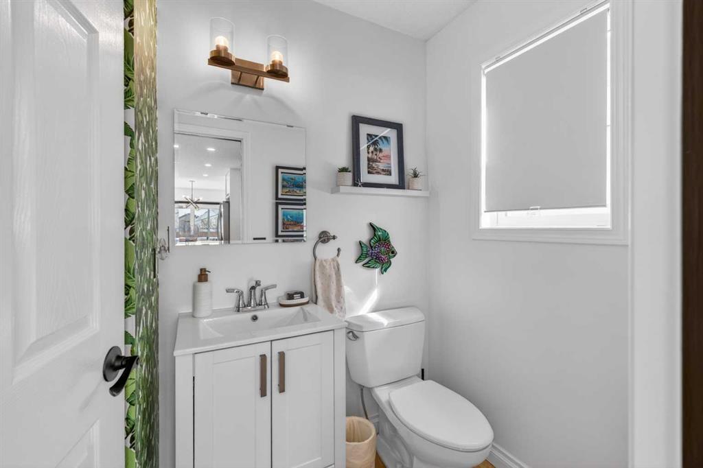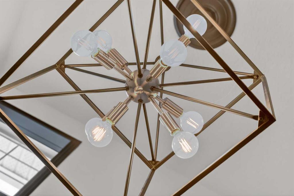 A modern cubism-inspired chandelier welcomes you at the front entry, complemented by a stunning new front door. The main floor features an open-concept layout with a fully updated kitchen (2019), complete with newer cabinetry, quartz countertops, a stylish backsplash, updated appliances, and LED pot lighting—creating a bright and inviting space. A beautifully executed gas fireplace in the living room, along with refinished original hardwood flooring, adds to the home’s warm and homely feel.