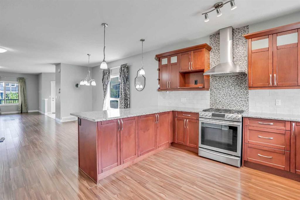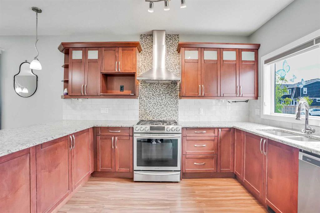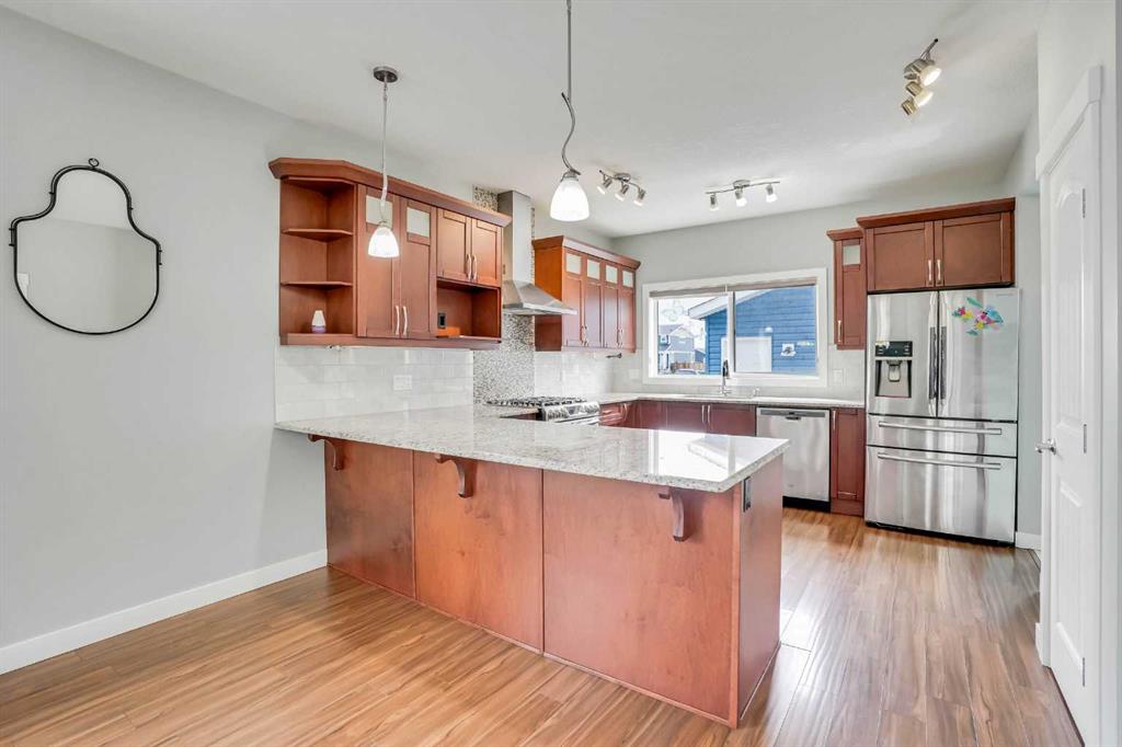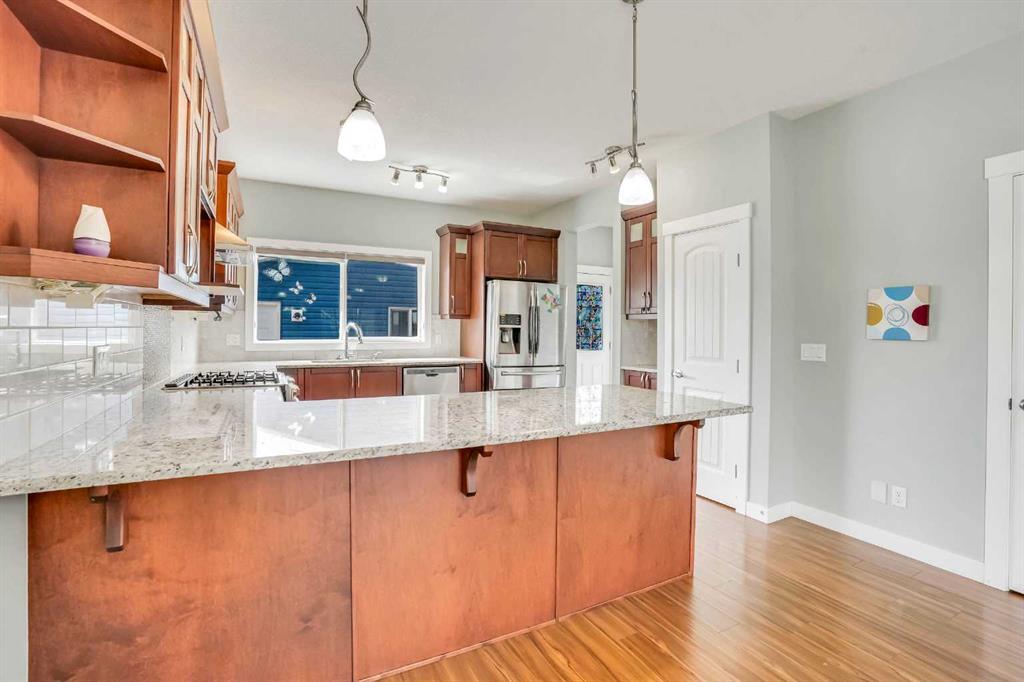 LOCATION!!! LOCATION!!!! Location!!! Welcome to Meticulously kept 2015 Built EAST FACING 1,865 Sq Ft SINGLE FAMILY DETACHED HOME including OVERSIZED DOUBLE Detached Garage with Unfinished Basement in a most Desirable community of REDSTONE On A Corner Lot. The CURRENT ORIGINAL OWNERS had upgraded the home extensively like Laminate/Tile Flooring, 9’ Main ceiling, Stainless Steel Appliances, Maple Cabinets, Granite Countertops everywhere, Railing at Stairs, Central Air Conditioning, Front Porch, & Rear Deck with Concrete Patio. MAIN FLOOR invites you with an OPEN CONCEPT FLOOR PLAN having decent front foyer followed by Spacious Living Room, MODERN STYLE UPGRADED Kitchen with Large Dining space to entertain large family, Pantry room and 3pc FULL WASHROOM finishes the level. The KITCHEN IS HIGHLY UPDATED WITH FULL HEIGHT CABINETS, CHIMNEY HOOD FAN, GAS STOVE, BUILT IN MICROWAVE, elegant backsplash and large bright window. The UPSTAIRS you have a Large Master Bedroom with 3pc Ensuite & walk in closet, Other 3 Good size Bedrooms with closets, Separate Laundry Room. The HUGE UNFINISHED BASEMENT with Egress Windows is waiting for your creative ideas. THE WEST FACING BACKYARD with Deck and Concrete Patio facilitates the low maintenance landscaping makes it ideal for summer gatherings. Plus Having Sprinklers for Grass. OVERSIZED DOUBLE DETACHED GARAGE with a paved back alley makes it ideal for your convenient lifestyle. The lovely Home is Located on Quiet Street, while Few minutes walk/drive to TRANSIT, PARK, PLAYGROUND, Shopping Plaza -Sanja Punjab & Chalo Fresco & few Mins drive to YYC, major highways, Cross iron Mall. Ideal for Living or Investment purposes to increase your rental portfolio. Don't Miss 3D Tour. Must Buy. Call Now your favourite realtor to schedule a viewing.