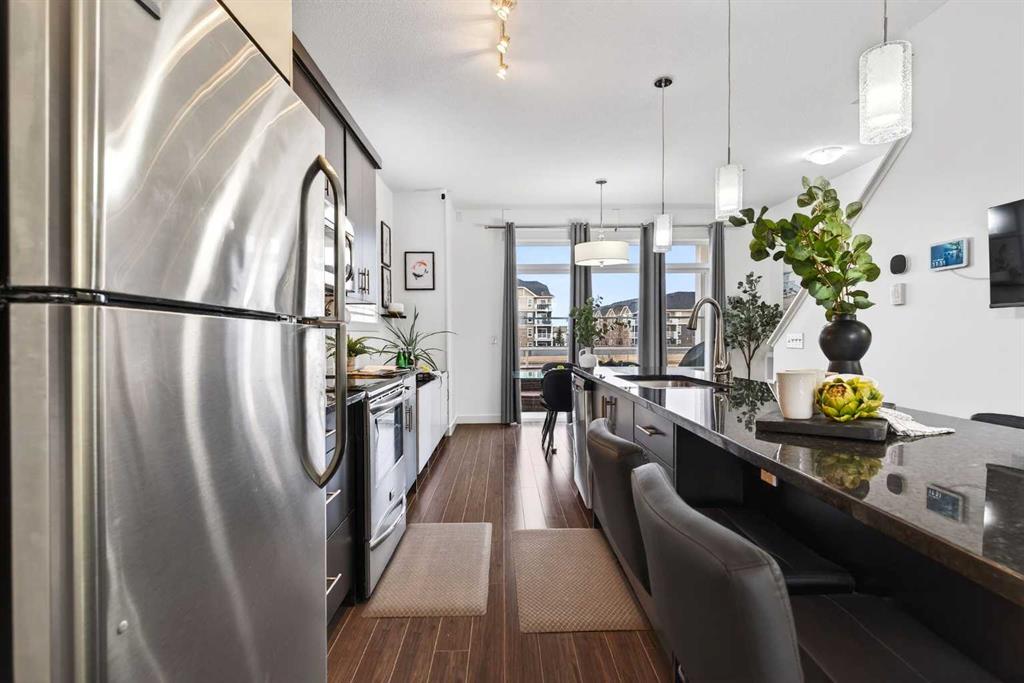 Upstairs, laminate flooring flows through the open-concept main level. The kitchen offers dark cabinetry, stainless steel appliances, and an extra-large island (ideal for casual seating and hosting), opening to a family-sized dining area with patio doors to the generous balcony with gas line for BBQ—perfect for morning coffee with the views. The living room is anchored by a custom built feature wall/wall unit, creating a stylish and functional gathering space.