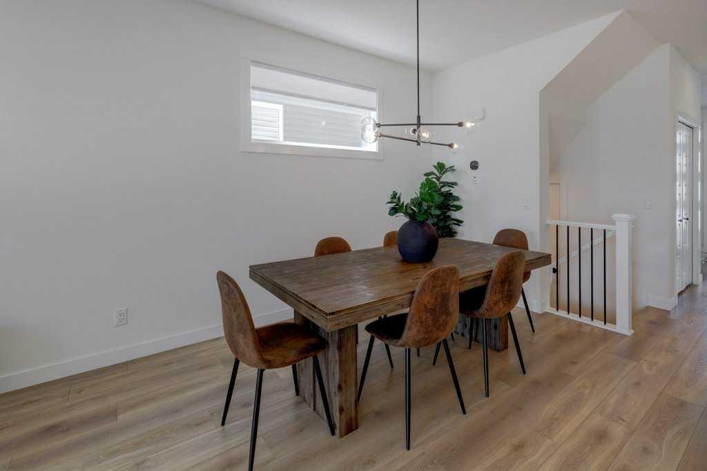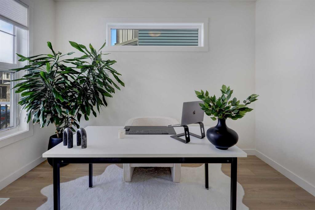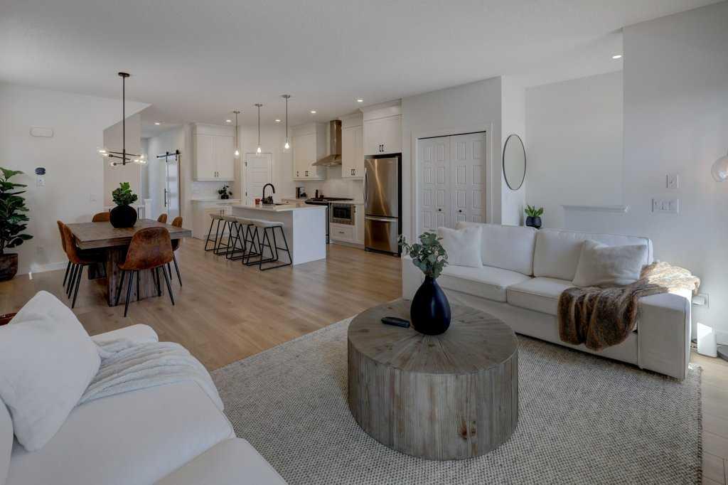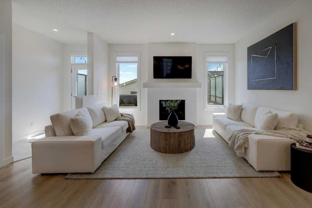 Step inside to a bright, open main floor with 9' ceilings and a layout that brings people together. The kitchen sits at the center, finished with quartz countertops, stainless steel appliances, a corner pantry, and a large island where meals, conversations, and daily routines naturally unfold. The adjoining dining and living areas create a comfortable, connected space, anchored by a warm gas fireplace and filled with natural light. A main floor office with a barn door offers a quiet place to work or focus, along with a convenient 2-piece bathroom.