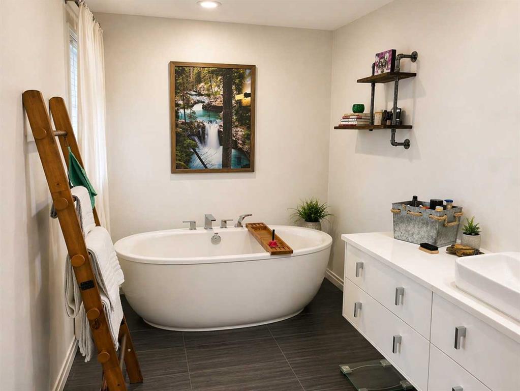 On the upper level, you’ll find a convenient laundry room and a mid-ship bonus room featuring built-in speakers and stylish wallpaper. This floor also includes two spacious children's rooms, each with access to a private 4-piece bath, while the expansive primary bedroom at the back captures breathtaking views. This luxurious suite can easily accommodate a king-size bed and additional furniture. It also features a private balcony, built-in speakers, a walk-in closet, and a 5-piece spa-inspired en-suite, complete with heated floors, dual storage vanities, a standalone tub, a full-size shower, and a water closet.