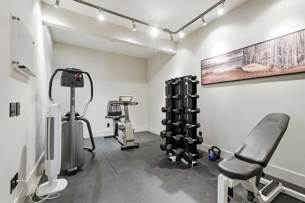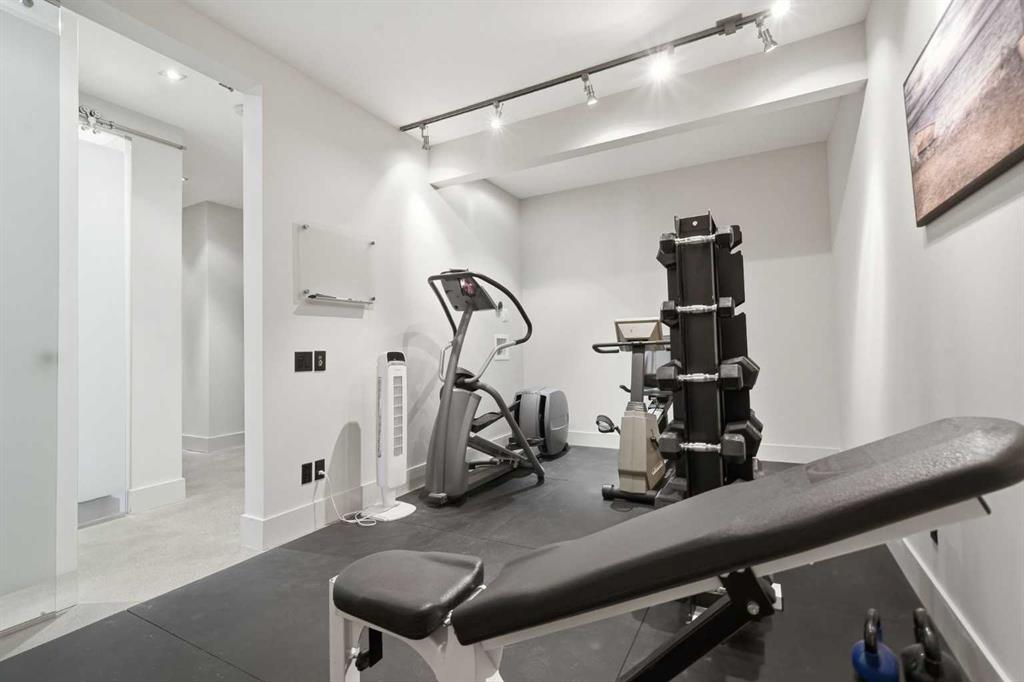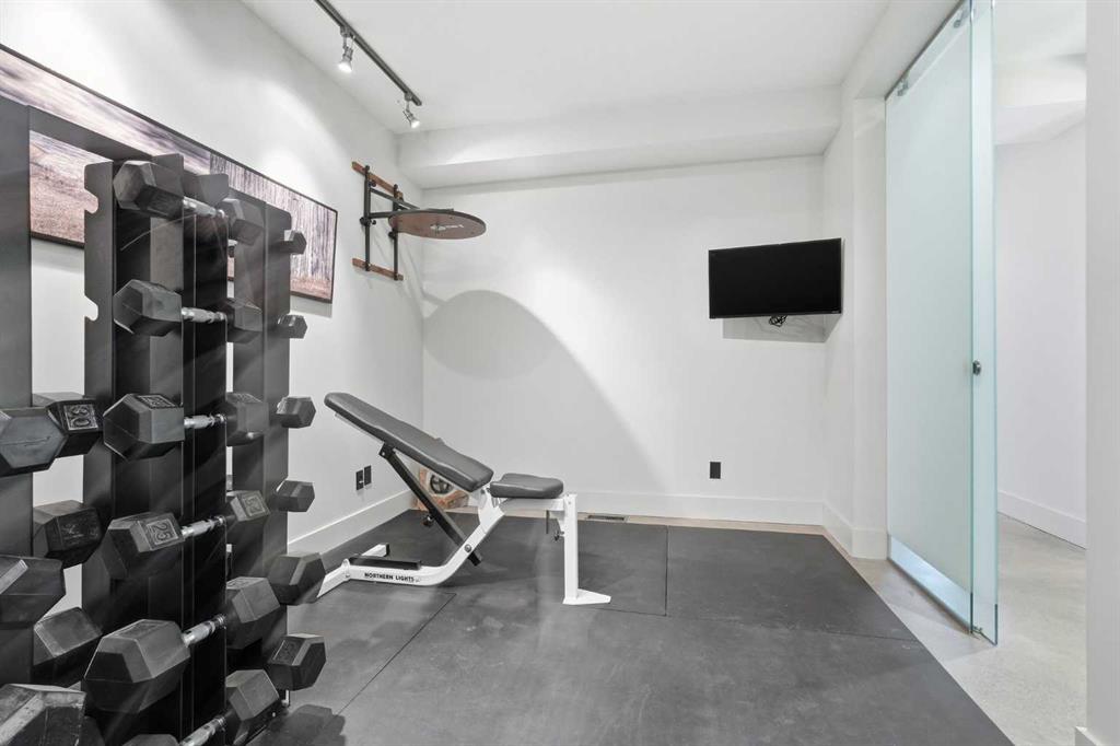 The main floor is versatile and functional, featuring a bright bedroom with full ensuite and a gym, yoga, or flex space—roughed-in for future laundry. Just outside, a private sunken courtyard with gas hookup extends the living space outdoors for entertaining or relaxing.