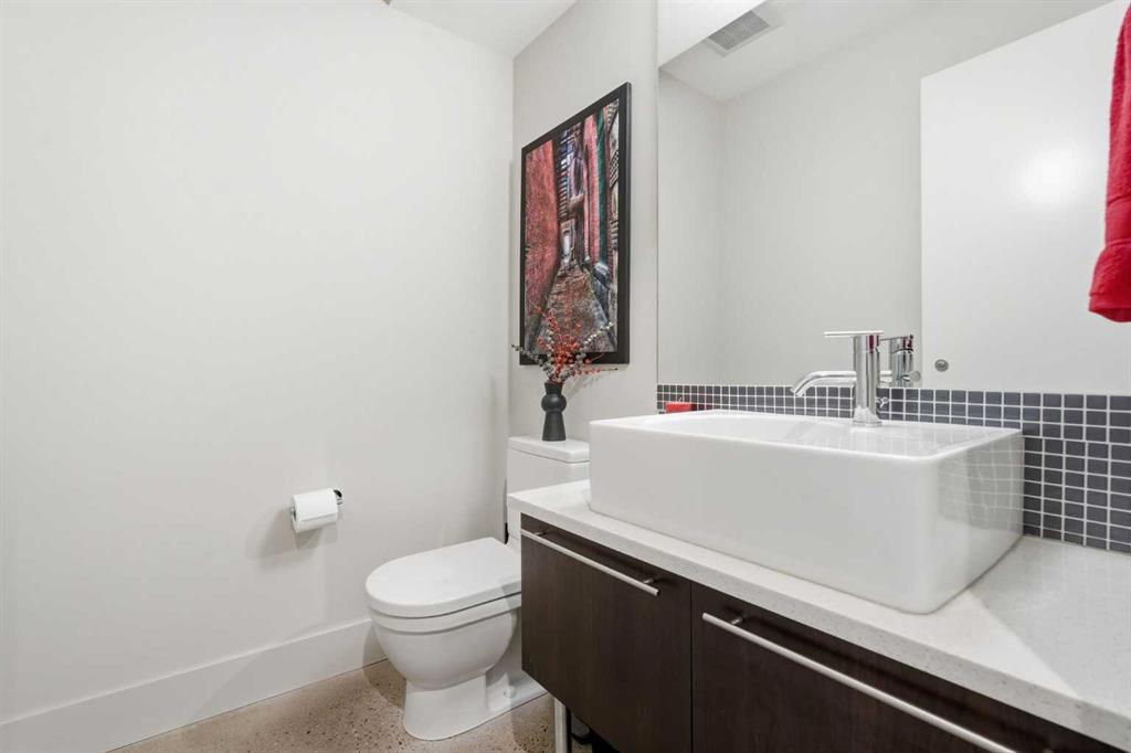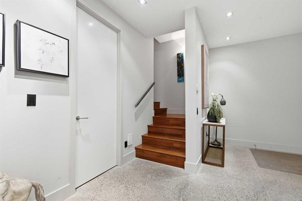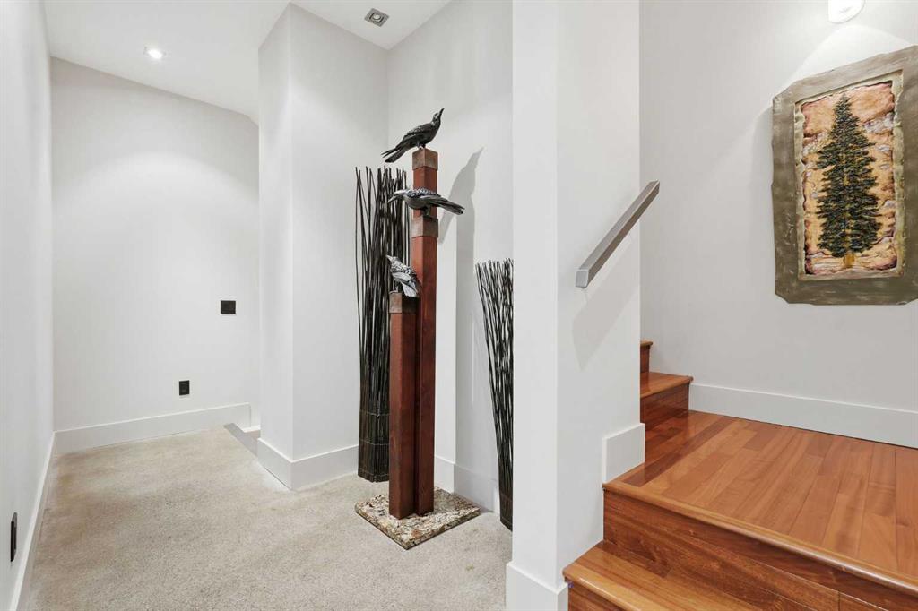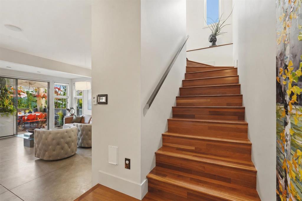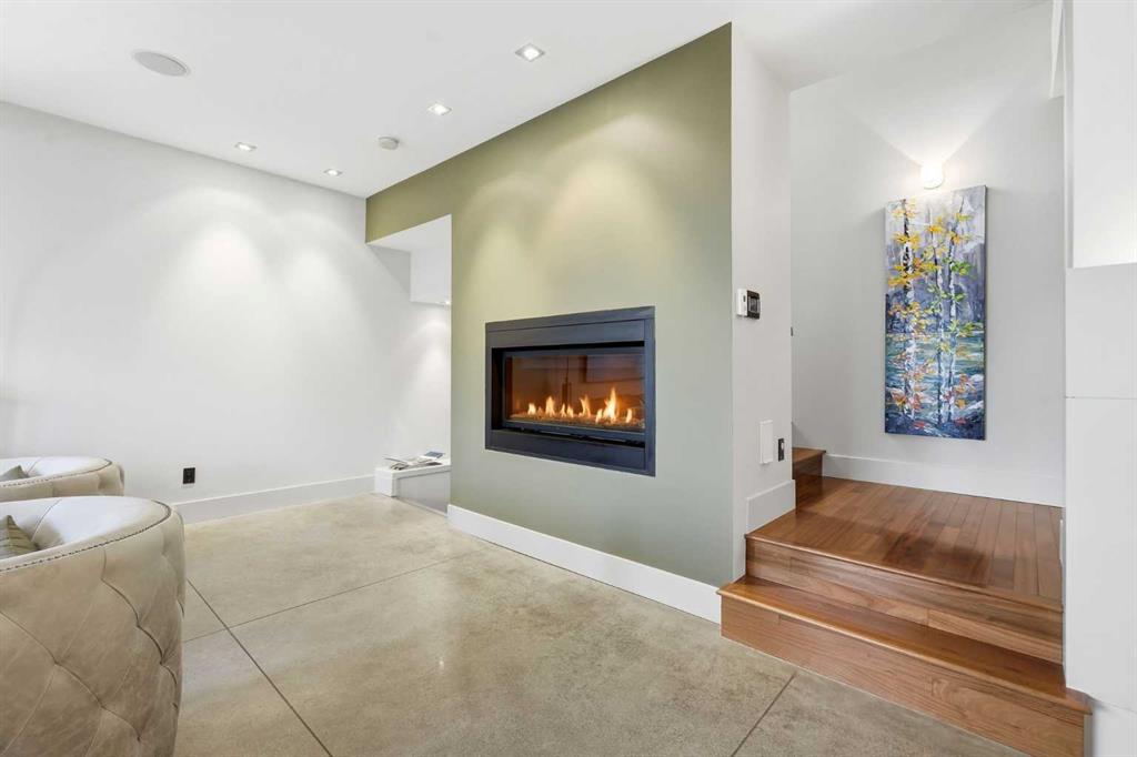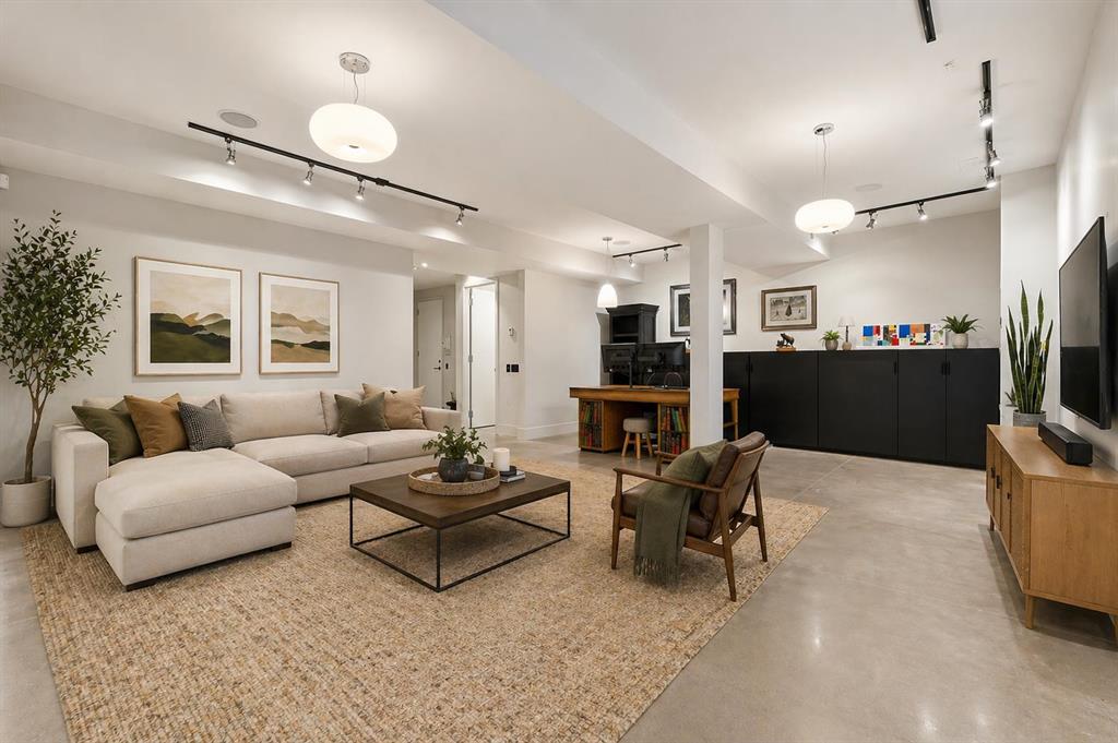The lower level offers exceptional flexibility and is currently used as a home office, and includes a convenient half bathroom. With direct access to the heated underground parkade with two stalls, this level is fully wired for surround sound and suited for a media room, family room, guest lounge, or studio space—offering a versatile extension of the home.