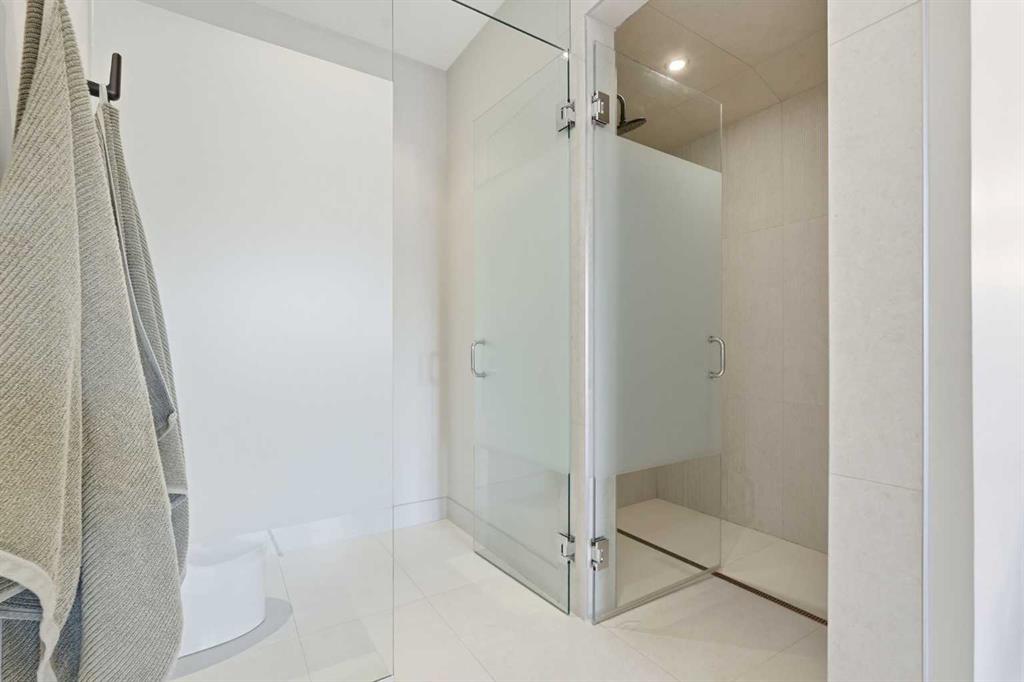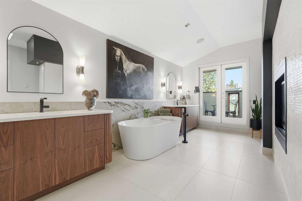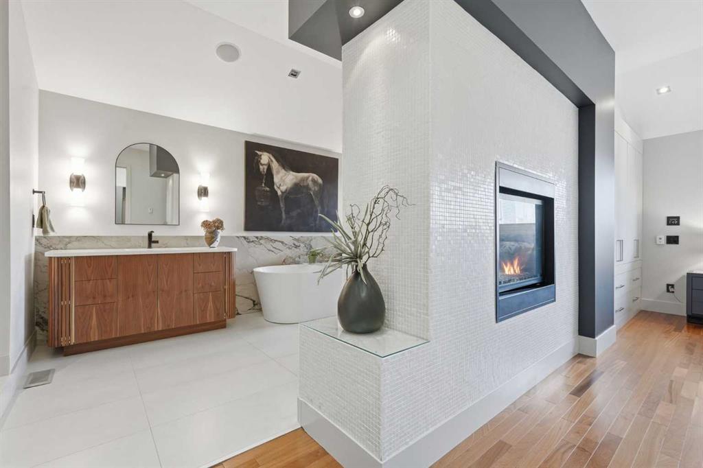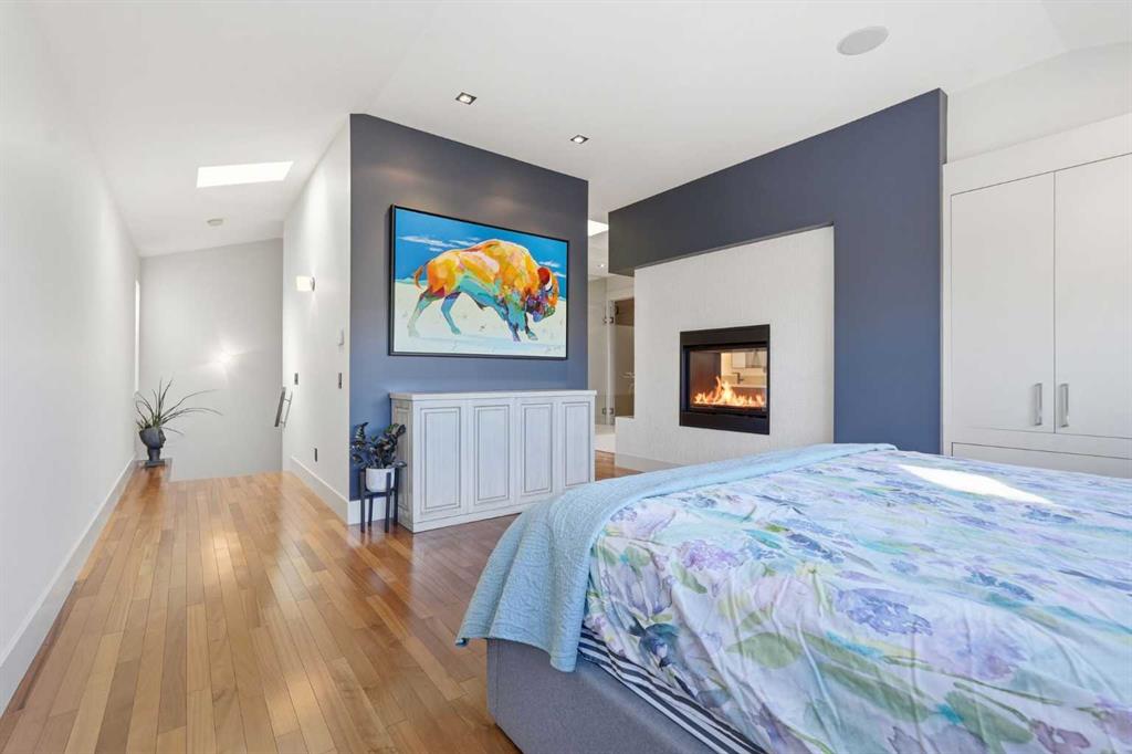 The third level is dedicated to the primary suite—an exceptional retreat. The bedroom features hardwood flooring and opens to a fully renovated 6pce ensuite with heated tile floors, freestanding soaker tub, oversized multi-head glass shower with bench seating, dual vanities, and a double-sided fireplace. A spacious walk-in closet adds storage and function. A private balcony showcases skyline views.
