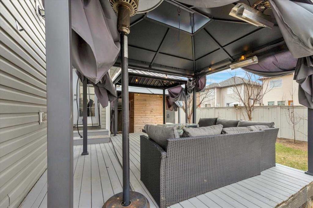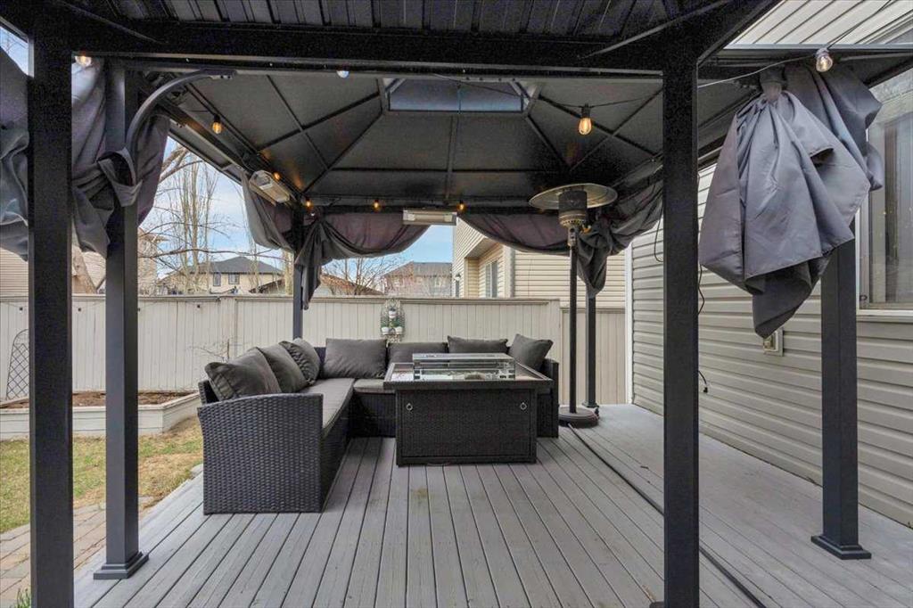 The outdoor space is built for relaxation and entertaining, featuring a GENEROUS BACK DECK, THREE GAZEBOS, GAS PATIO HEATER, INCLUDED PATIO FURNITURE, and a STORAGE SHED.