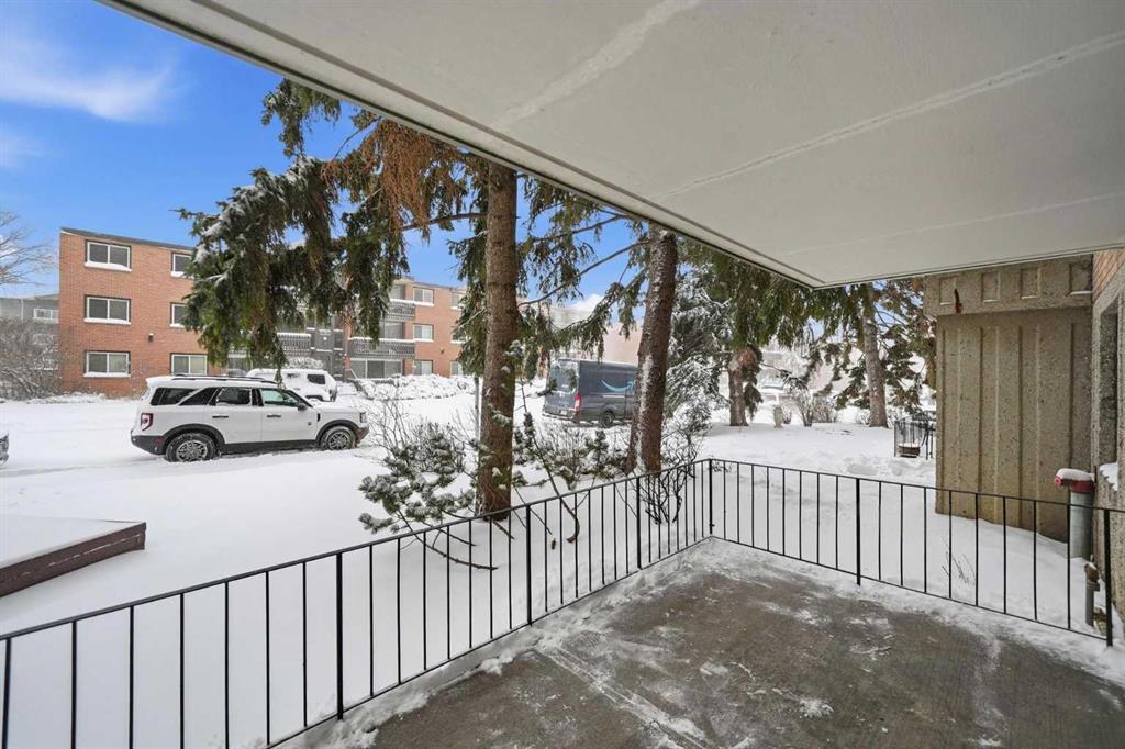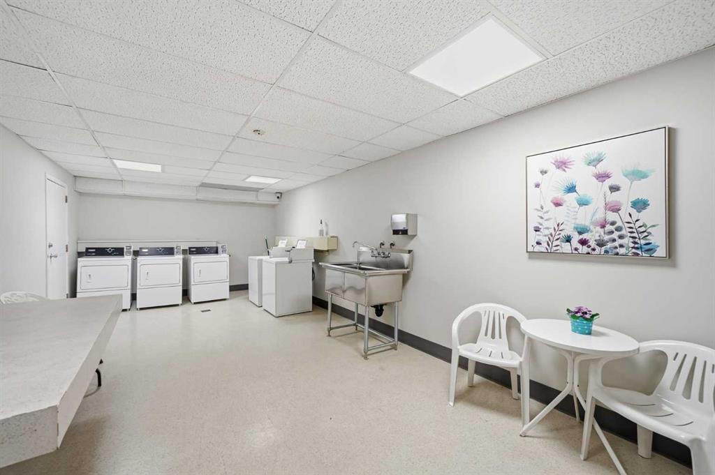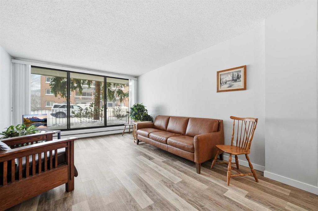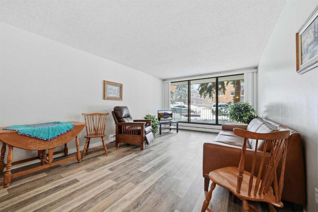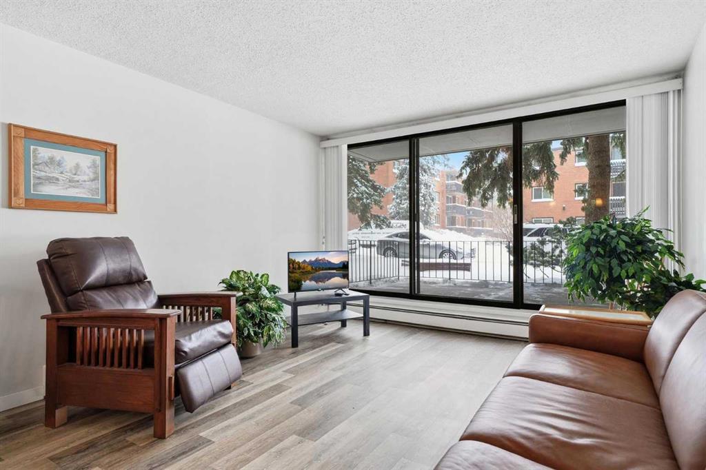 Welcome to Chinook Manor, A 40+ Age Restricted Building. This bright and spacious 1-bedroom, 1-bathroom main floor unit offers both comfort and convenience. With 617 sq. ft. of well-designed living space, this north facing home features a functional layout, including a fully equipped kitchen and a generous living room with sliding glass doors that lead directly to a large private patio with easy ground-level access.