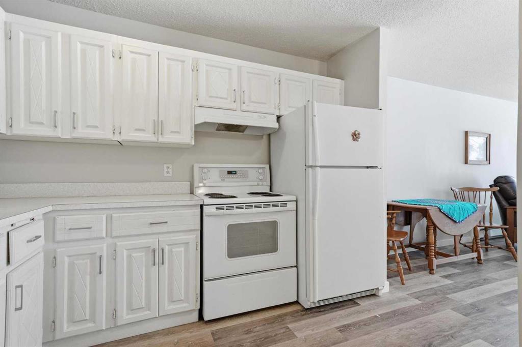 The kitchen is equipped with well-maintained cabinetry, recently refreshed with a modern white finish, along with matching white appliances including a refrigerator, stove, and dishwasher, all in good working order. Large windows throughout the unit allow for plenty of natural light.