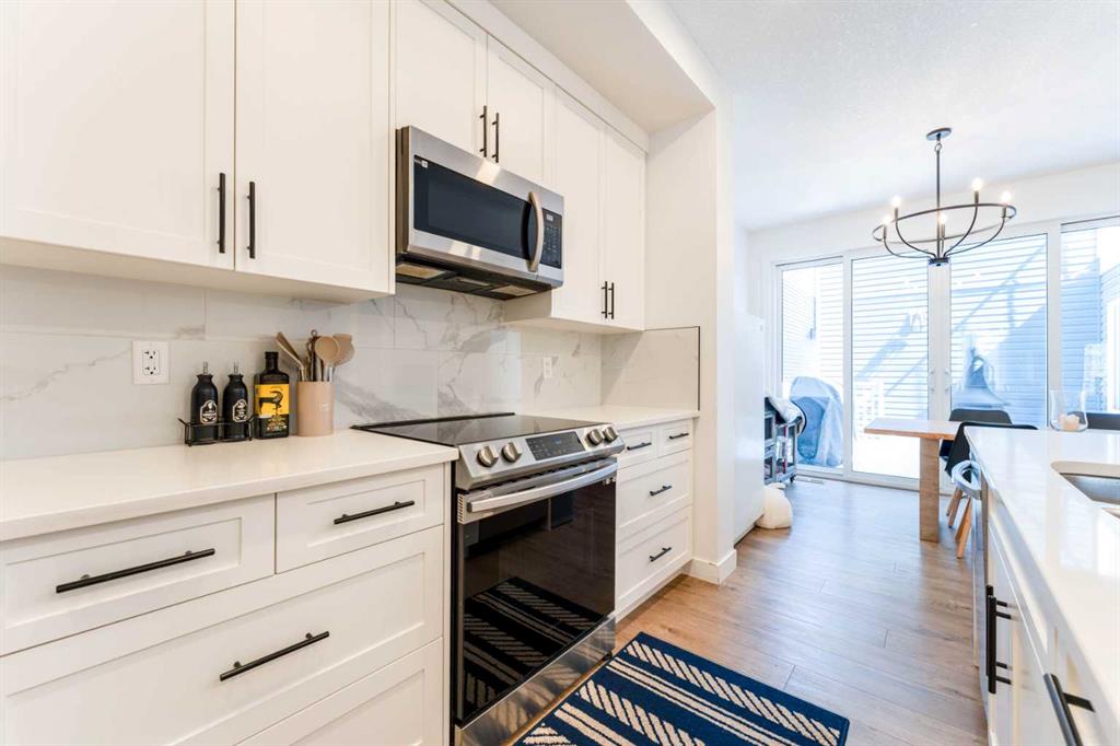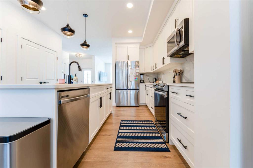 The main floor features a beautifully appointed kitchen that serves as the heart of the home, complete with a large central island, elegant granite countertops, rich white cabinetry, stainless steel appliances, and a sleek matte-finish faucet. Stylish cylinder pendant lighting and a chandelier enhance the space, while double pantry doors provide generous storage. The open-concept layout flows effortlessly into a bright and spacious living room, highlighted by large windows that bring in an abundance of natural light. Upstairs, you’ll find three generously sized bedrooms, including a luxurious primary retreat featuring a 5-piece ensuite with double sinks, plenty of space, and beautiful natural light with views of the street. A second full bathroom, additional 4-piece ensuite access, and a conveniently located laundry room ensure practicality and comfort for the entire family.