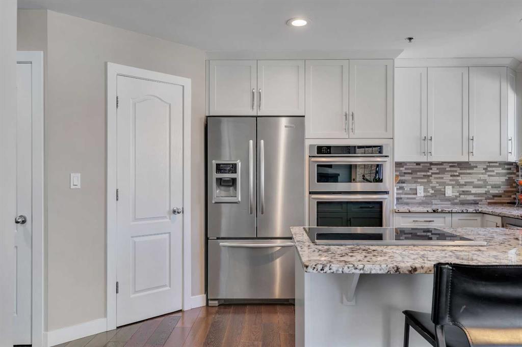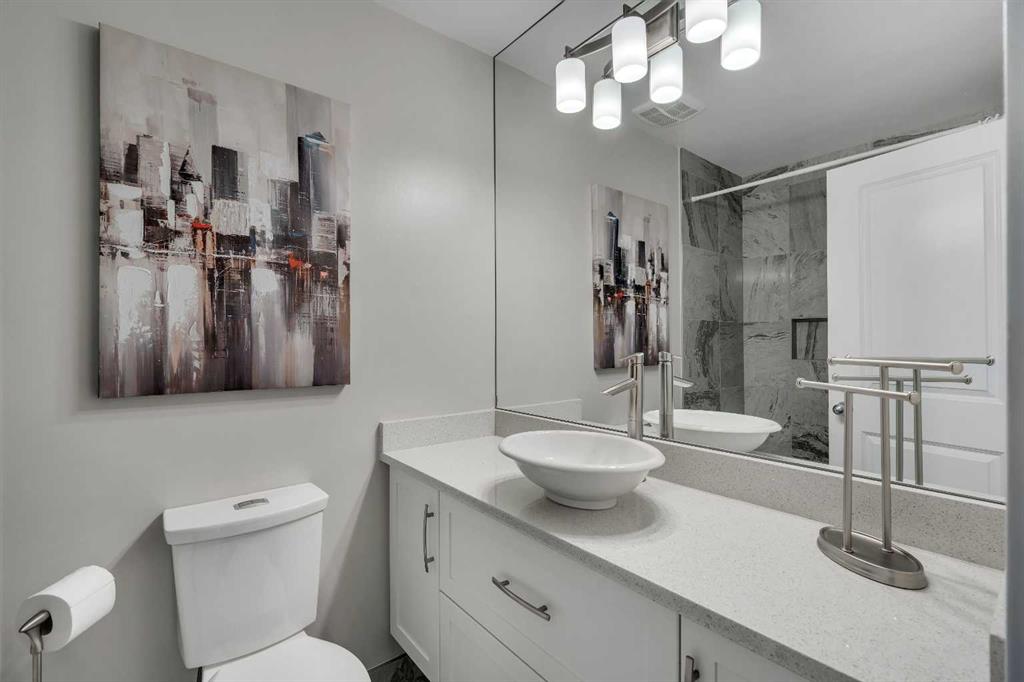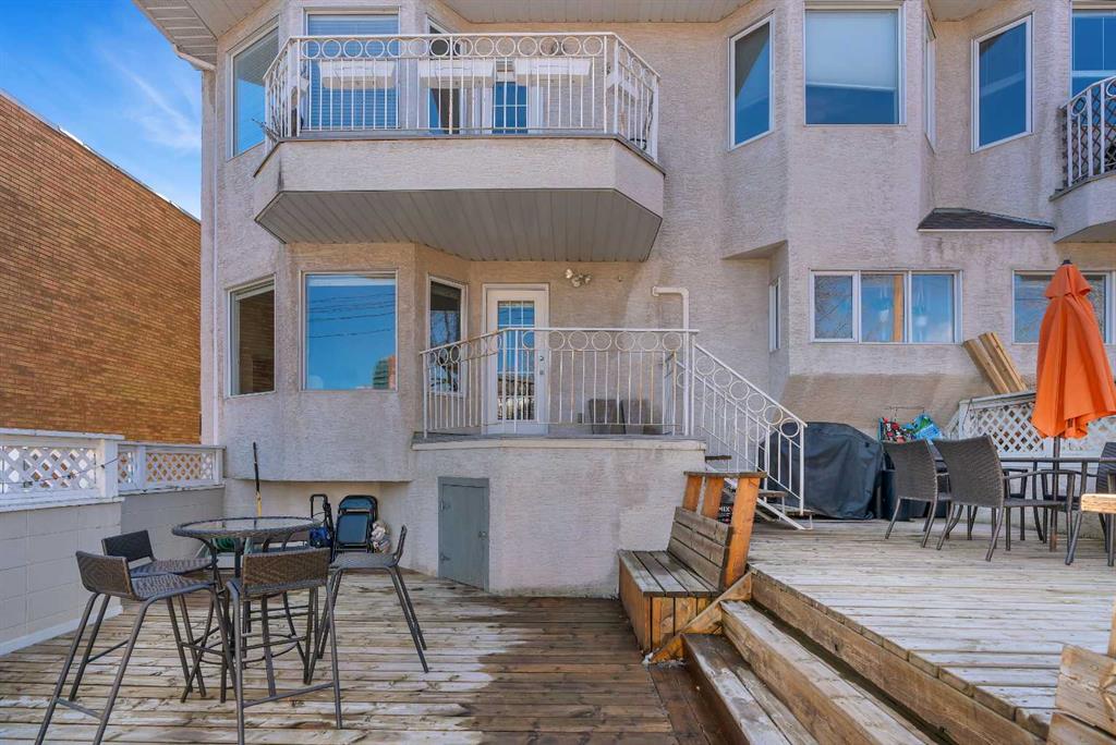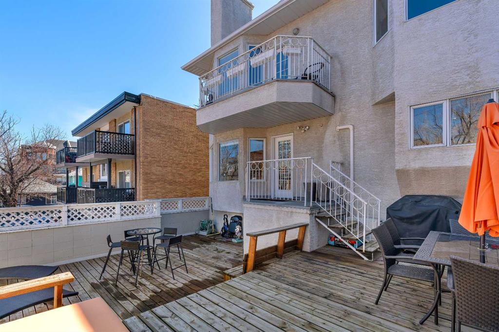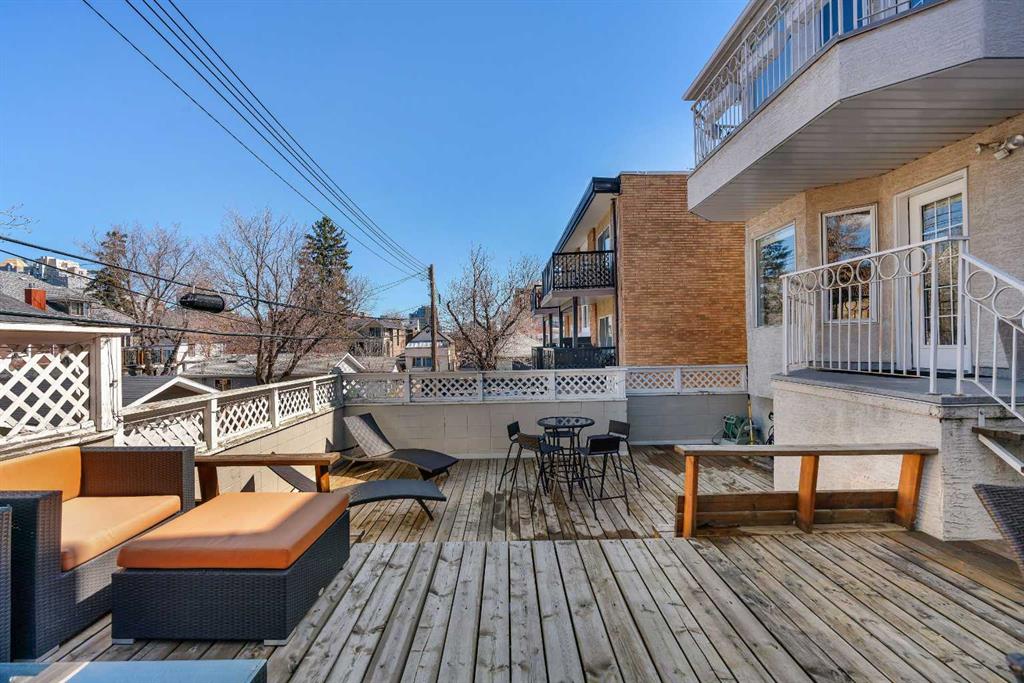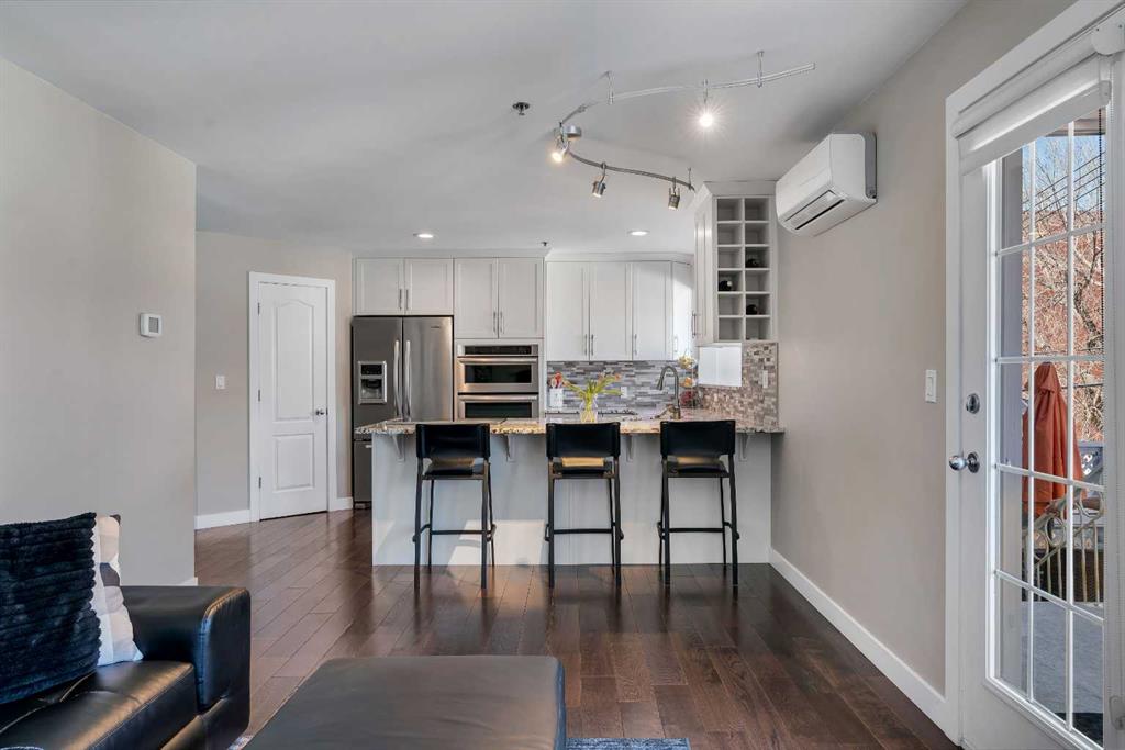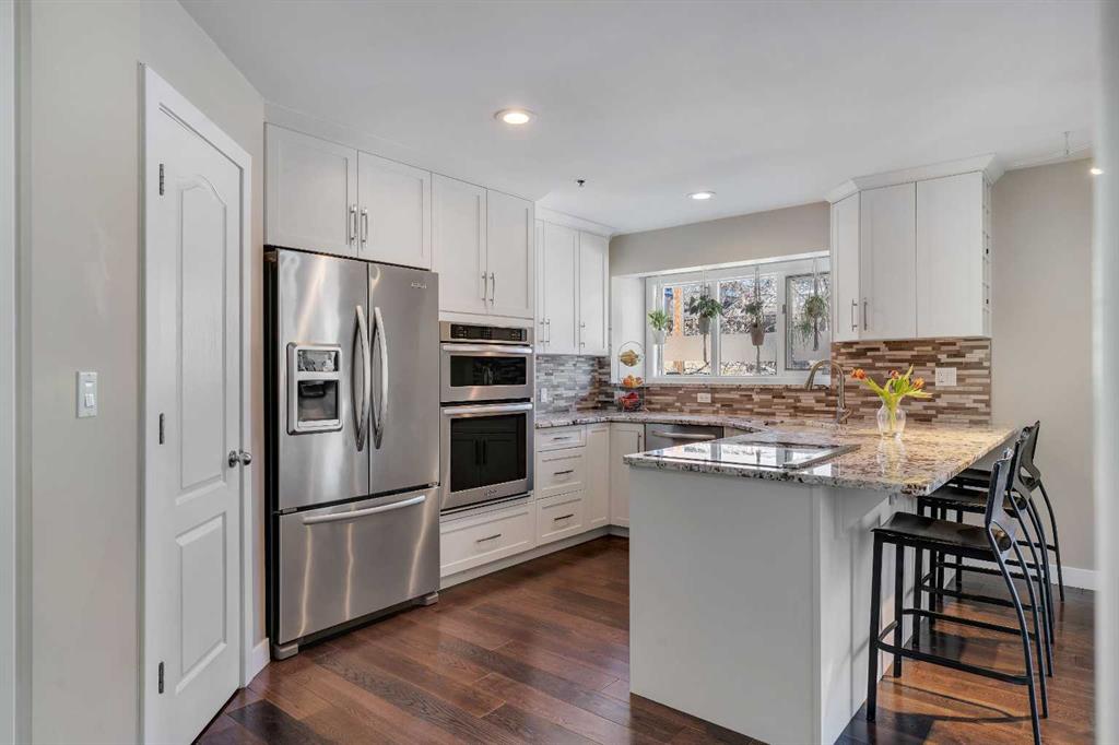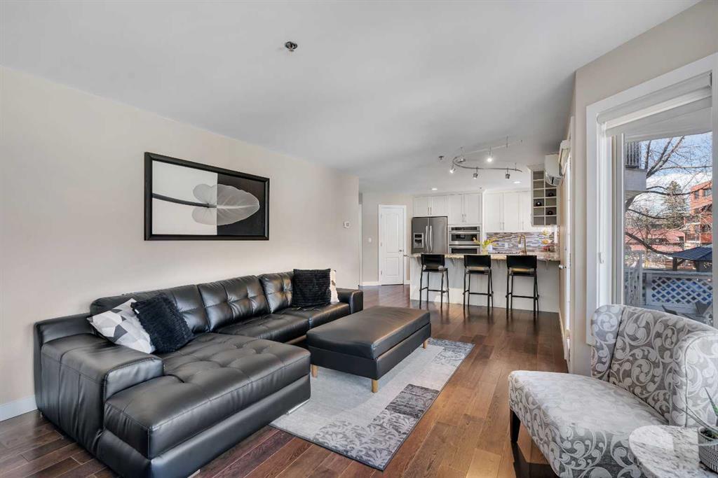 Tucked into the heart of Lower Mount Royal, this stylishly refreshed 2-bedroom, 2-bathroom condo offers an ideal blend of comfort, design, and outdoor living. Just steps from the energy of 17th Avenue, the home delivers a walkable lifestyle while still feeling private and inviting. Inside, the bright, contemporary kitchen is thoughtfully finished with crisp white cabinetry, a sleek induction cooktop with pop-up hood fan, built-in oven and microwave, and a stone backsplash that ties it all together. The open layout flows naturally into the living space, creating an easy setting for both everyday living and hosting. The primary bedroom is generously sized to accommodate a king bed and features a beautifully designed ensuite with a custom tile and glass shower, complete with a premium Grohe system and stone flooring for a spa-like feel. The second bathroom is equally well-appointed with quartz countertops, a tiled tub surround, and modern finishes throughout. One of the standout features of this home is the impressive 700 sq ft multi-level patio — a rare outdoor extension that feels more like a private courtyard. Whether it’s summer dinners, weekend lounging, or evenings with friends, this space offers exceptional versatility. Additional highlights include engineered hardwood flooring, in-floor heating for added comfort, updated windows, and a conveniently located oversized parking stall close to the building entrance. With its combination of thoughtful upgrades, generous outdoor space, and unbeatable inner-city location, this home presents a unique opportunity to enjoy the best of urban living in one of Calgary’s most sought-after neighbourhoods.