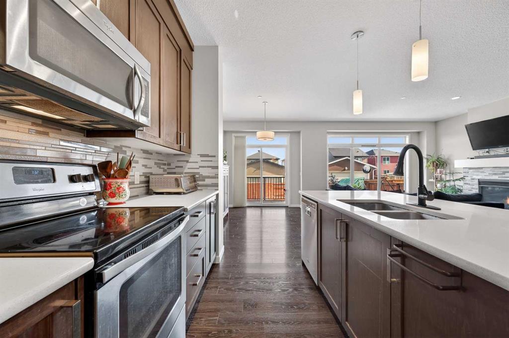 This very well maintained Cochrane 2-storey home in family-friendly Fireside offers over 2,066 square feet of functional above-grade living space designed for modern comfort. Built in 2016, your next home features a smart layout and numerous builder upgrades throughout. The open-concept main floor is anchored by 9-foot ceilings and large windows that fill the space with natural light. The kitchen is a chef’s dream, featuring quartz countertops, a massive island with a breakfast bar, stainless appliances, and a walk-through pantry for effortless organization. Adjacent to the kitchen, the spacious living room is centered around a cozy fireplace and flows seamlessly into the dining area. From here, step out onto the elevated deck to enjoy summer barbecues in the large, fully fenced backyard. A well-appointed mudroom and a 2-piece powder room complete the main level.