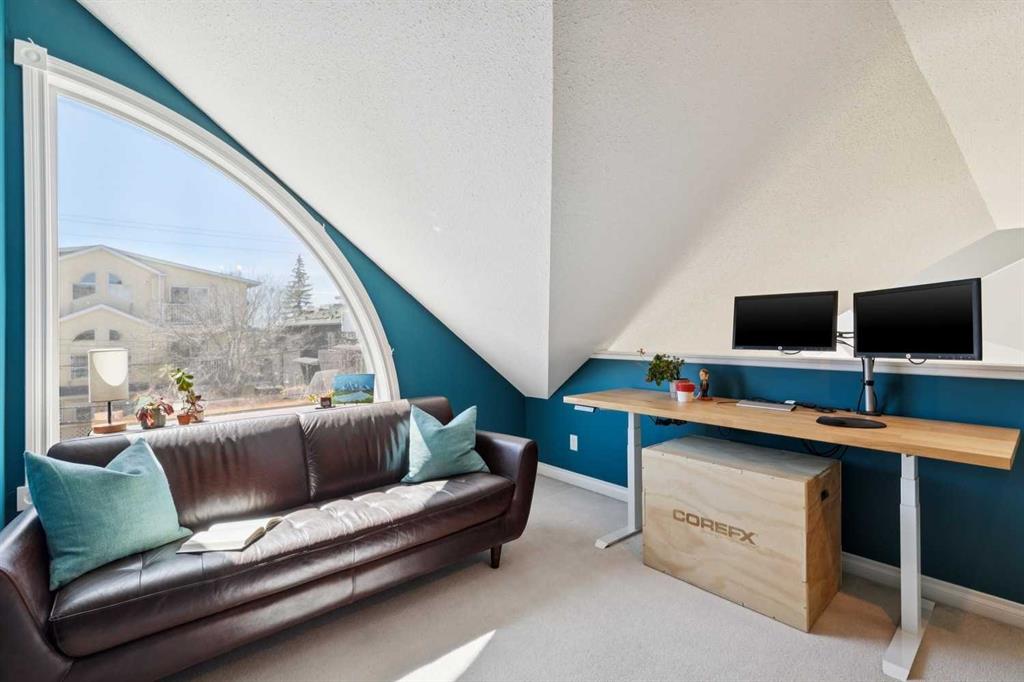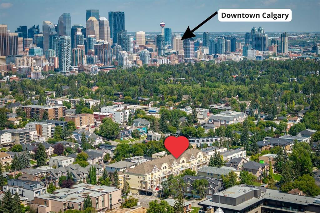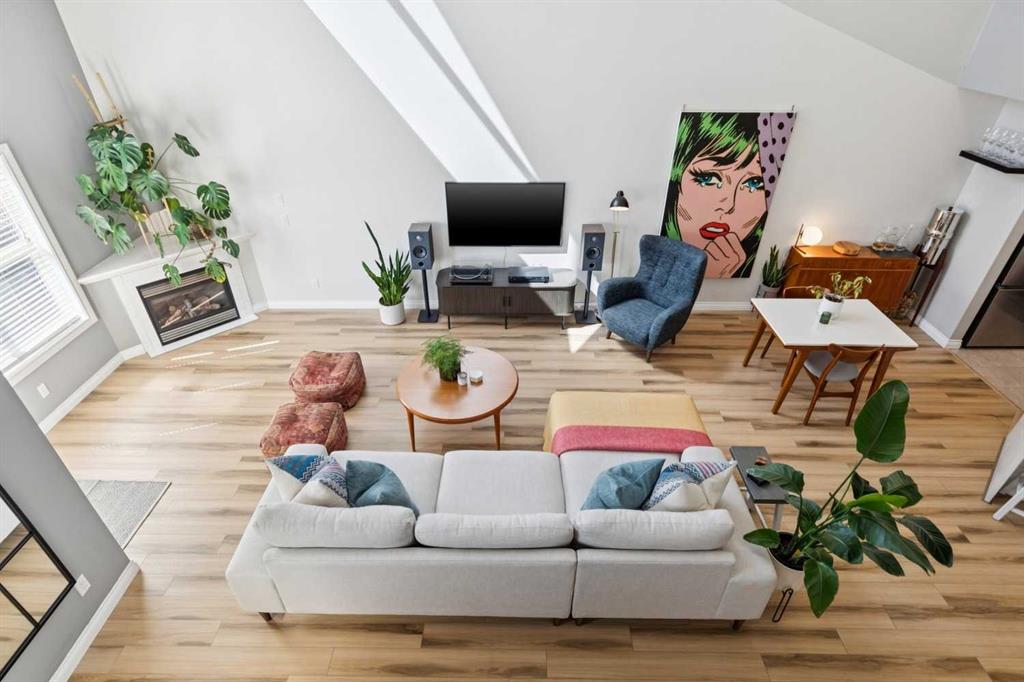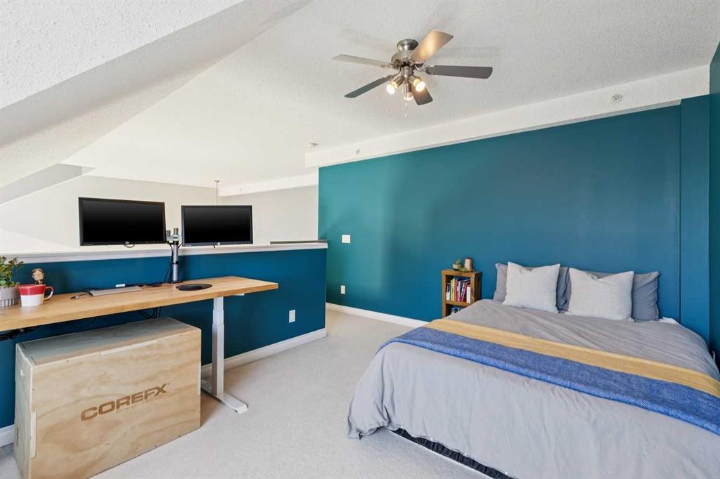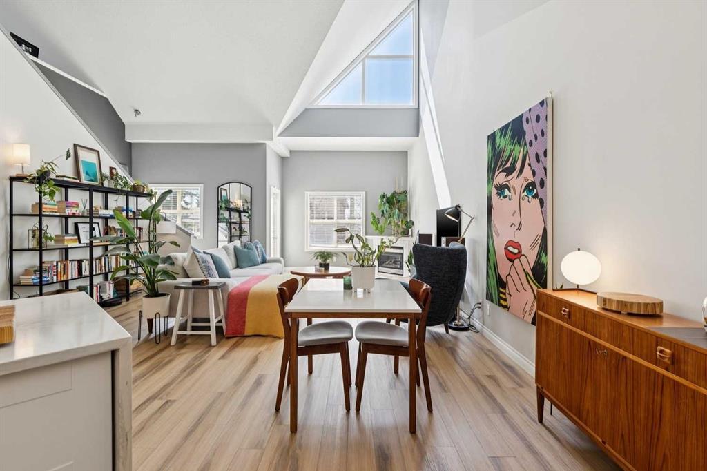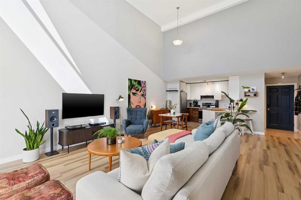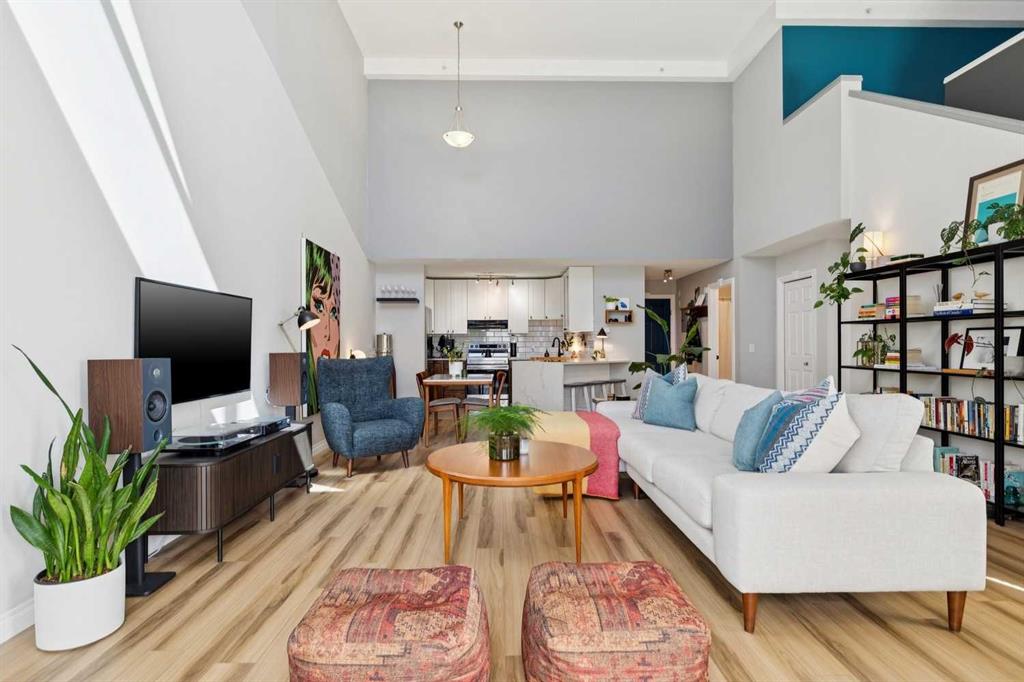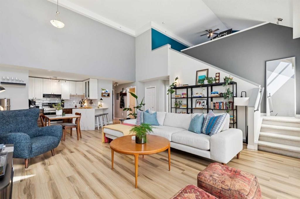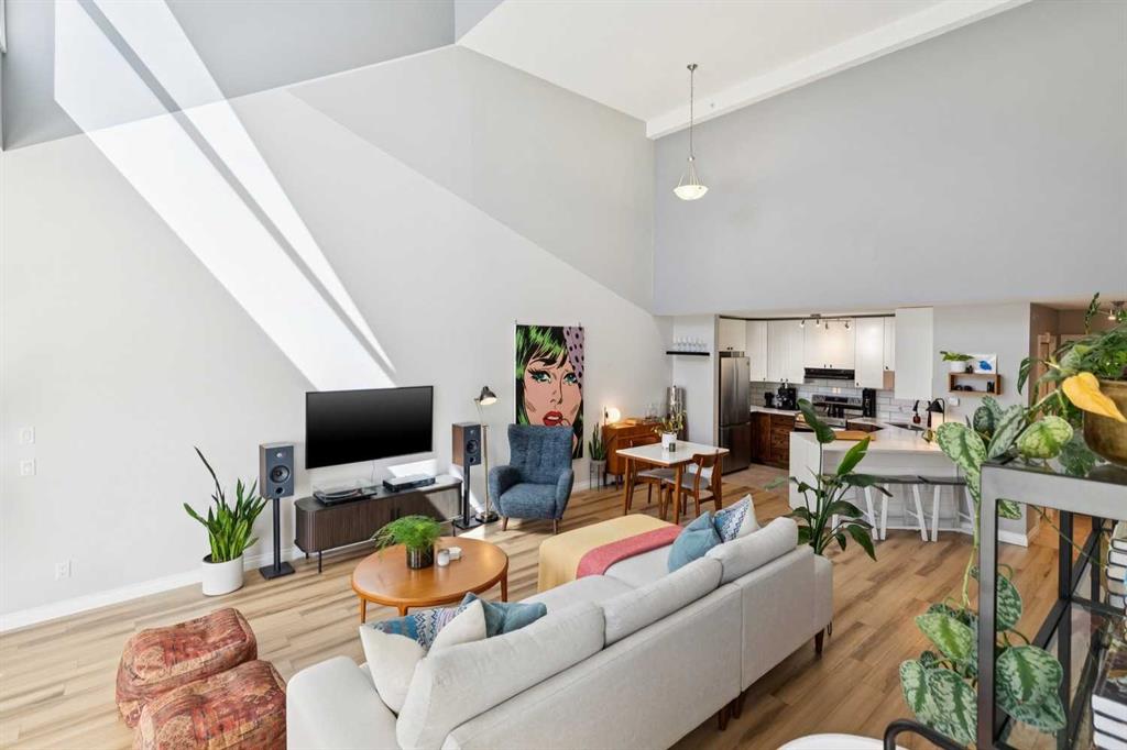 Welcome to this gorgeous 1,241 sqft TOP FLOOR 2-storey condo in the heart of vibrant Marda Loop, offering 1 spacious bedroom with a walk-through closet, 2 full bathrooms (one is an ensuite), a versatile loft that could be used as a second bedroom, in-floor heat, and a long private balcony! Soaring 2-storey ceilings - peaking at an impressive 25 feet - and expansive windows flood the space with natural light, creating an open, airy feel throughout. Step inside to discover thoughtful updates throughout, including a fully updated kitchen, bathrooms, paint, flooring, and lighting. The sleek kitchen features stainless steel appliances, updating cabinetry, a breakfast bar, quartz counters, in-floor heat, and opens to a huge living room with a beautiful gas fireplace and a dining area, perfect for entertaining. Luxury vinyl plank flooring adds warmth and durability to the space. The private primary suite is tucked away with direct access to the balcony, a walk-through closet, and a large ensuite bathroom with a corner soaker tub, separate stand-up shower, and updated vanity, sink, faucet, and light fixture. A second full bathroom near the front entry (rare for a one-bedroom home) offers a tub/shower combo and quartz counters for added flexibility, and in-unit laundry is also included. Upstairs, the bright and spacious loft provides endless possibilities for a bedroom, home office, gym, reading nook, or play area. Enjoy summer evenings on your south-facing private balcony with a gas BBQ hook-up, and take advantage of the titled underground parking stall, secure storage locker, and convenient bike storage. Located just steps from boutique shops, trendy cafés, and some of Calgary’s best restaurants, plus minutes from 17th Avenue, downtown, and fantastic recreational amenities like an outdoor pool, tennis courts, skating rink, ball diamond, and public library - just a few short blocks away! This move-in-ready home is a rare find - book your showing today!