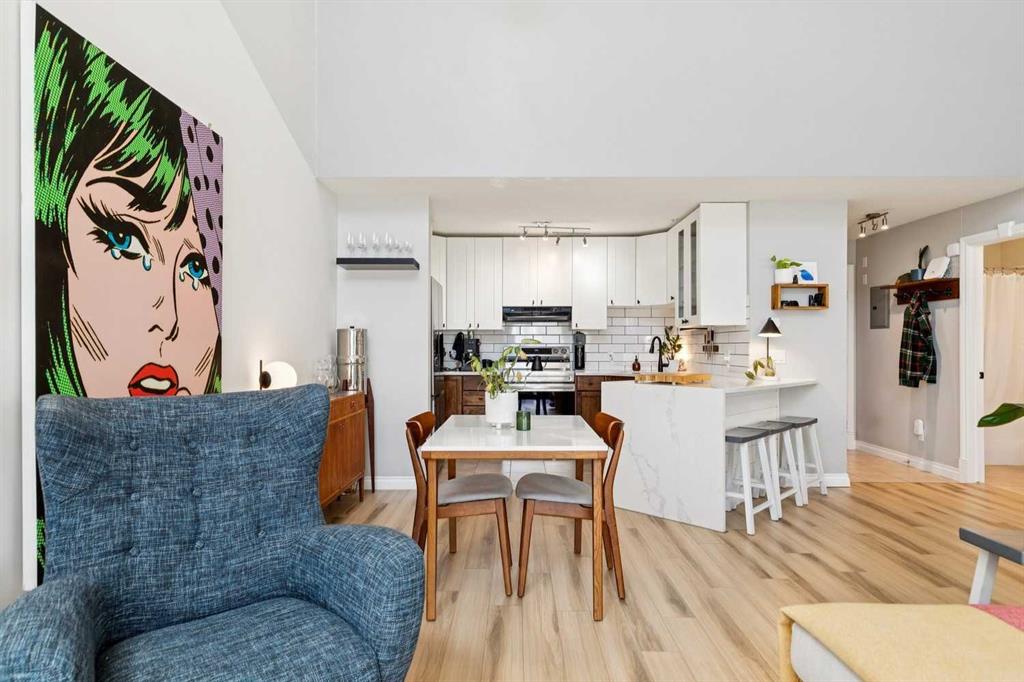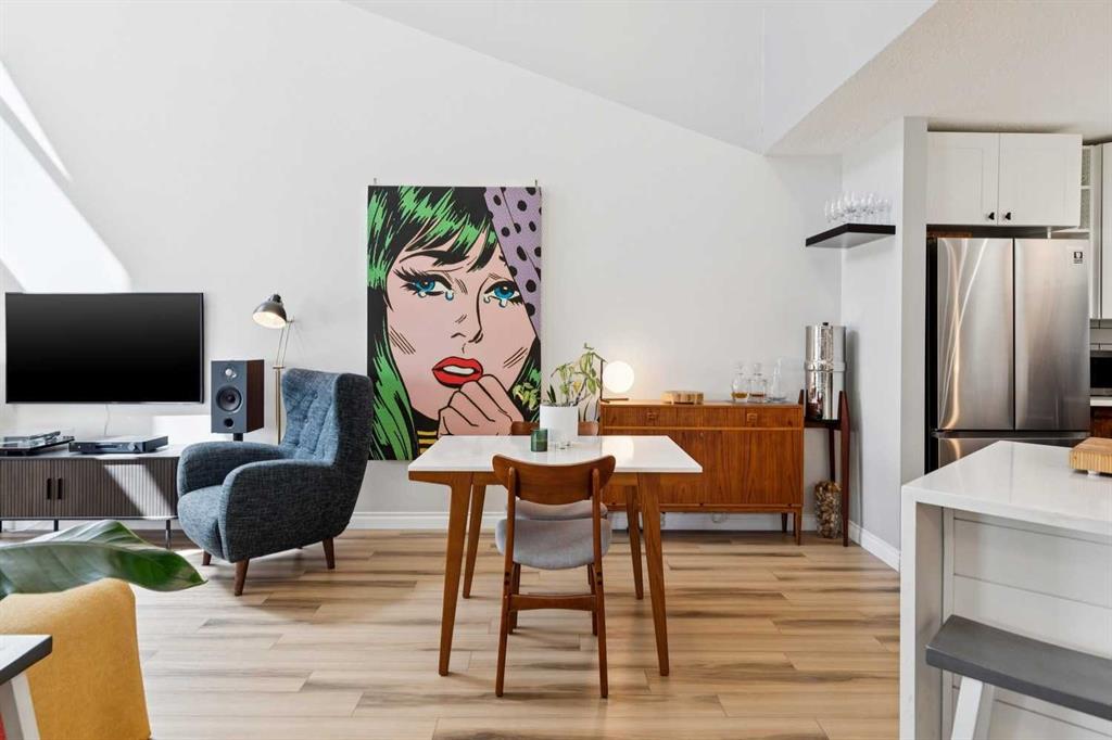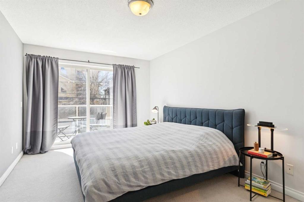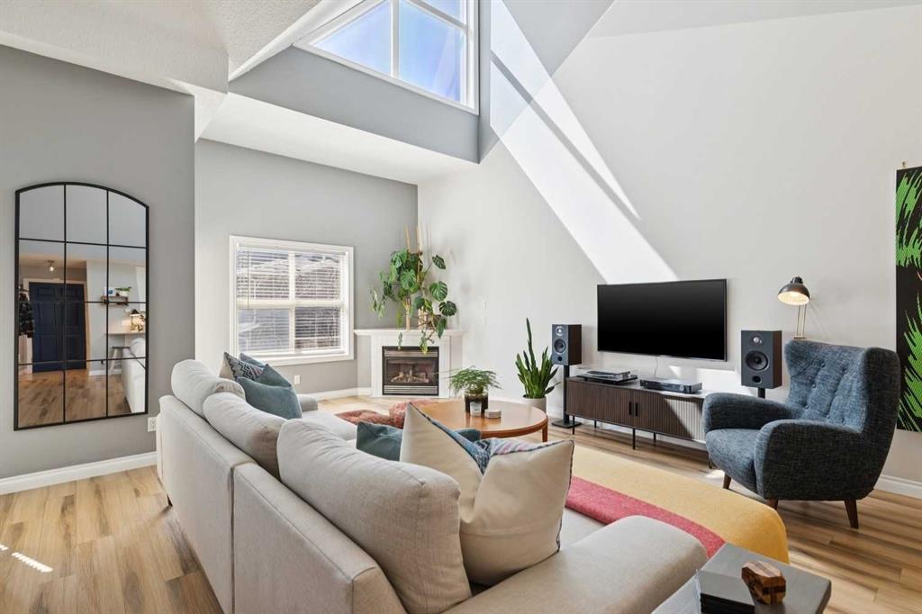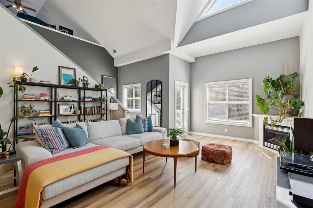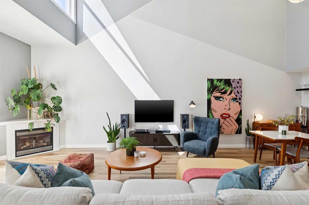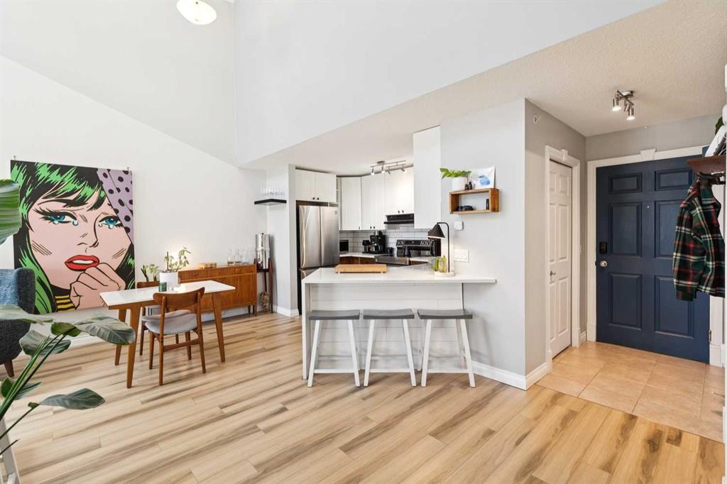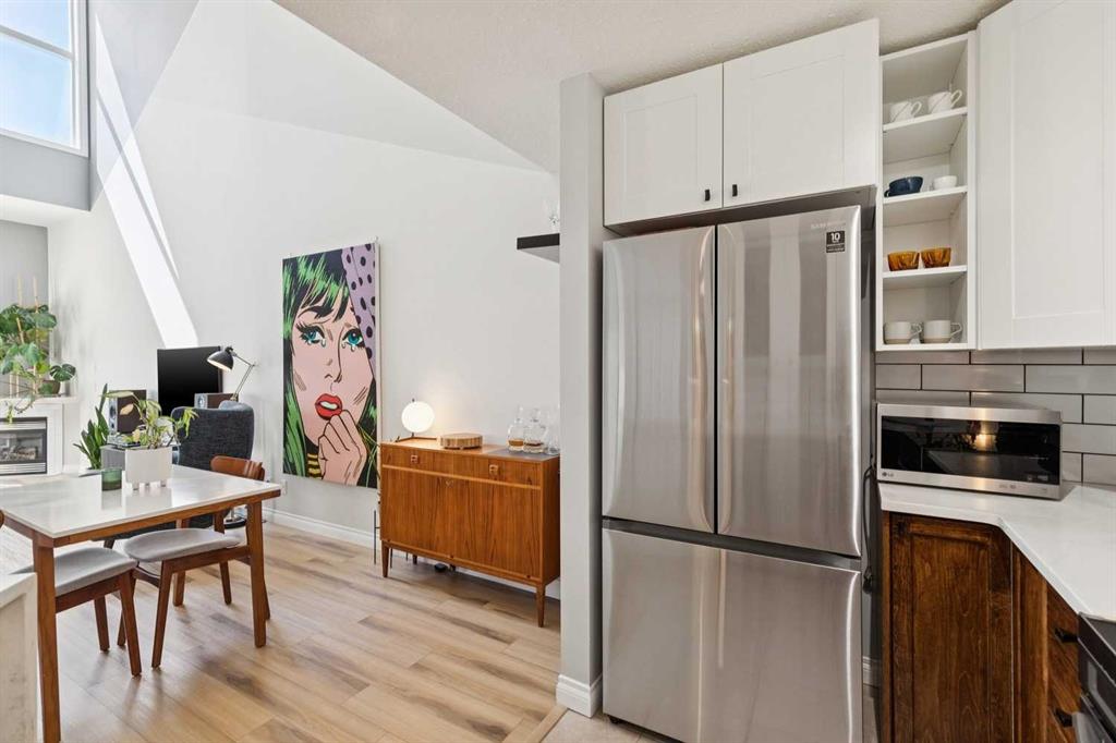Welcome to this gorgeous 1,241 sqft TOP FLOOR 2-storey condo in the heart of vibrant Marda Loop, offering 1 spacious bedroom with a walk-through closet, 2 full bathrooms (one is an ensuite), a versatile loft that could be used as a second bedroom, in-floor heat, and a long private balcony! Soaring 2-storey ceilings - peaking at an impressive 25 feet - and expansive windows flood the space with natural light, creating an open, airy feel throughout. Step inside to discover thoughtful updates throughout, including a fully updated kitchen, bathrooms, paint, flooring, and lighting. The sleek kitchen features stainless steel appliances, updating cabinetry, a breakfast bar, quartz counters, in-floor heat, and opens to a huge living room with a beautiful gas fireplace and a dining area, perfect for entertaining. Luxury vinyl plank flooring adds warmth and durability to the space. The private primary suite is tucked away with direct access to the balcony, a walk-through closet, and a large ensuite bathroom with a corner soaker tub, separate stand-up shower, and updated vanity, sink, faucet, and light fixture. A second full bathroom near the front entry (rare for a one-bedroom home) offers a tub/shower combo and quartz counters for added flexibility, and in-unit laundry is also included. Upstairs, the bright and spacious loft provides endless possibilities for a bedroom, home office, gym, reading nook, or play area. Enjoy summer evenings on your south-facing private balcony with a gas BBQ hook-up, and take advantage of the titled underground parking stall, secure storage locker, and convenient bike storage. Located just steps from boutique shops, trendy cafés, and some of Calgary’s best restaurants, plus minutes from 17th Avenue, downtown, and fantastic recreational amenities like an outdoor pool, tennis courts, skating rink, ball diamond, and public library - just a few short blocks away! This move-in-ready home is a rare find - book your showing today!