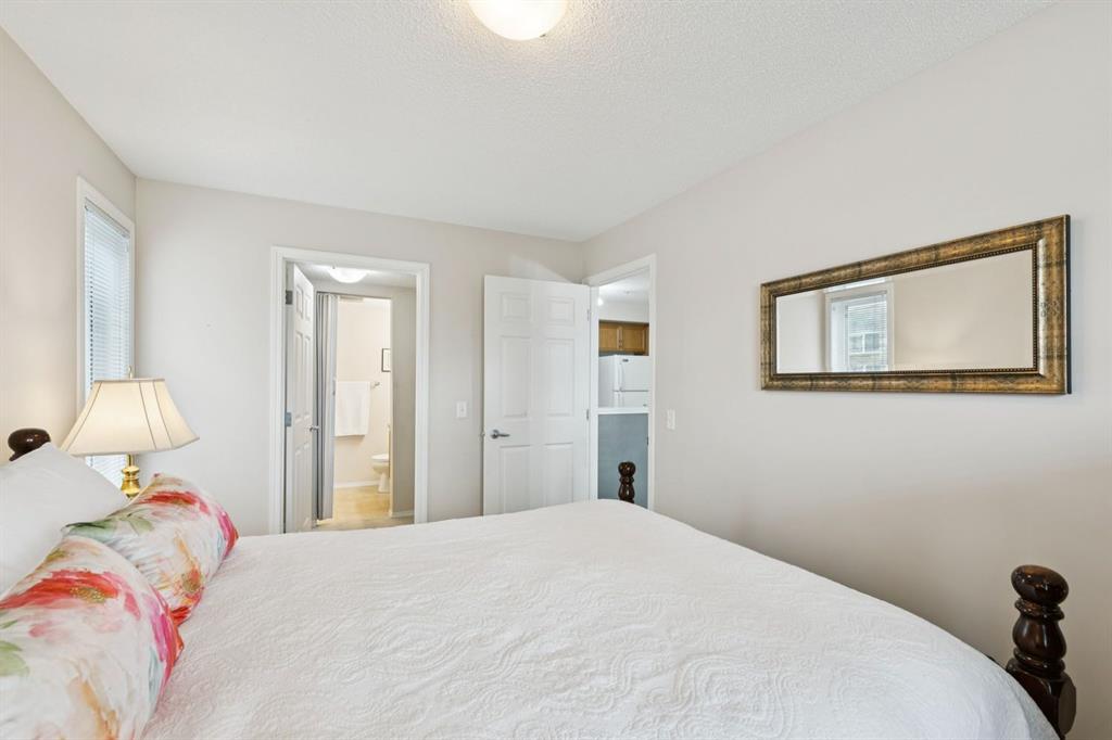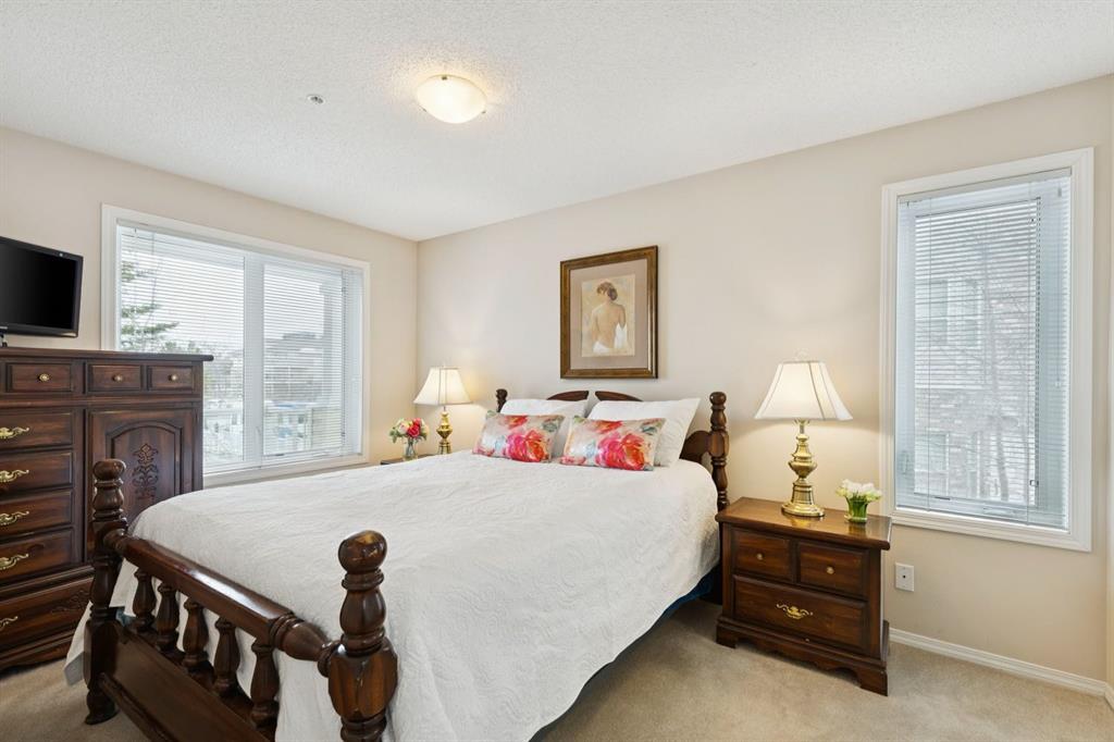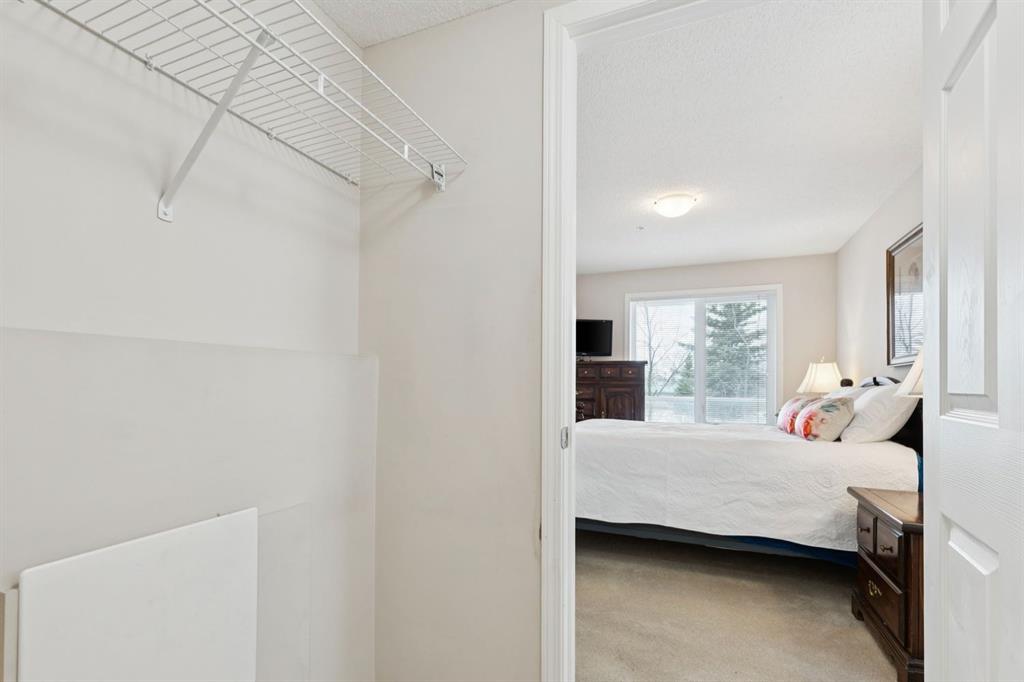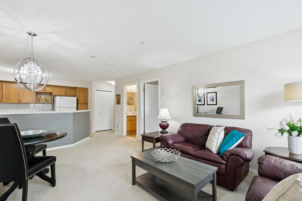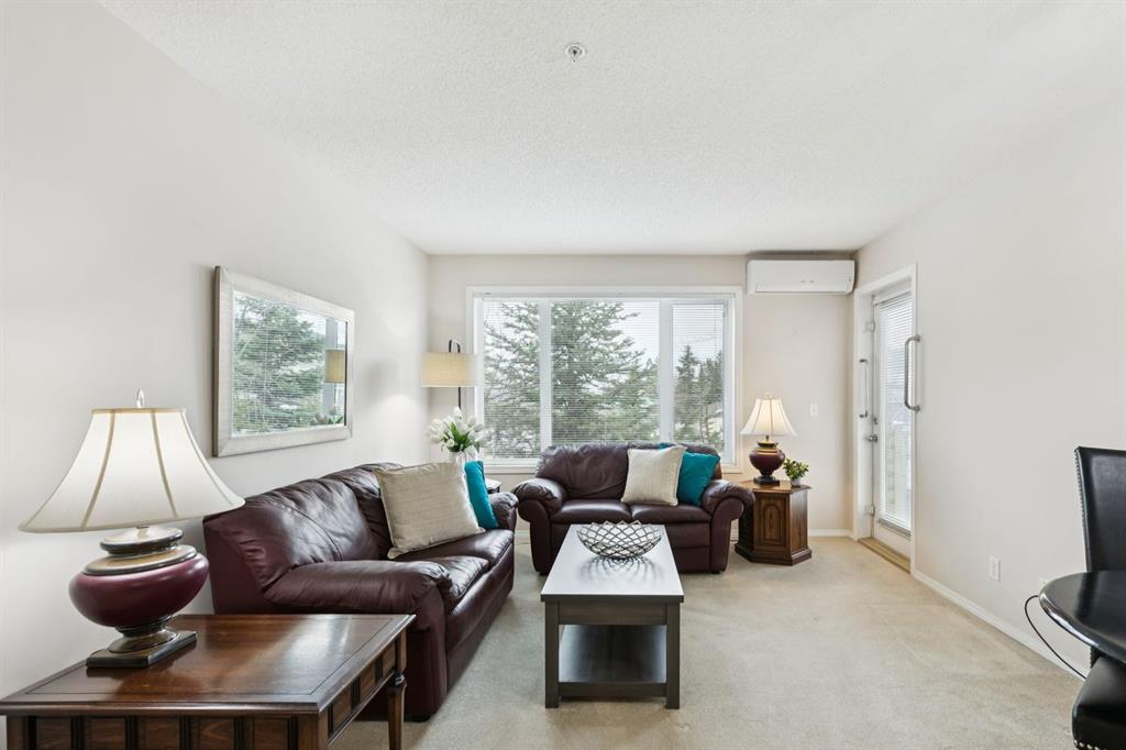Welcome to one of the most coveted floorplans in Whitehorn Calvanna Village 55+ Living - a rare CORNER unit offering 2 bedrooms + 2 bathrooms with sunny SW exposure. Beautifully maintained and filled with natural light, this 882 sqft apartment unit features an airy, open-concept layout enhanced by large windows throughout. The spacious living and dining areas create an inviting setting for everyday living, while the functional kitchen offers quality wood cabinetry, pantry cupboard and ample counter space. Step outside to your private balcony - an ideal place to enjoy your coffee and soak in the sunshine. As the surrounding mature trees come into leaf, this space becomes an even more peaceful. The generously sized primary bedroom includes a walk-through closet leading to a 4pc ensuite. A well-proportioned second bedroom offers flexibility for guests or a hobby/office space. A second 4pc bathroom conveniently serves the main living area, and in-suite laundry is thoughtfully tucked into a closet adjacent to the kitchen. A standout feature is the central air conditioning (heat pump). Located on the same floor, the activities room provides added lifestyle value with a full-service kitchen and ample seating - perfect for hosting gatherings or enjoying a quiet change of scenery with building residents. Additional highlights include one assigned underground heated parking stall and a storage locker conveniently located directly in front of your space. Enjoy the ease of a central location, quietly tucked within a beautifully maintained community - offering the perfect balance of comfort, convenience, and peaceful 55+ living.