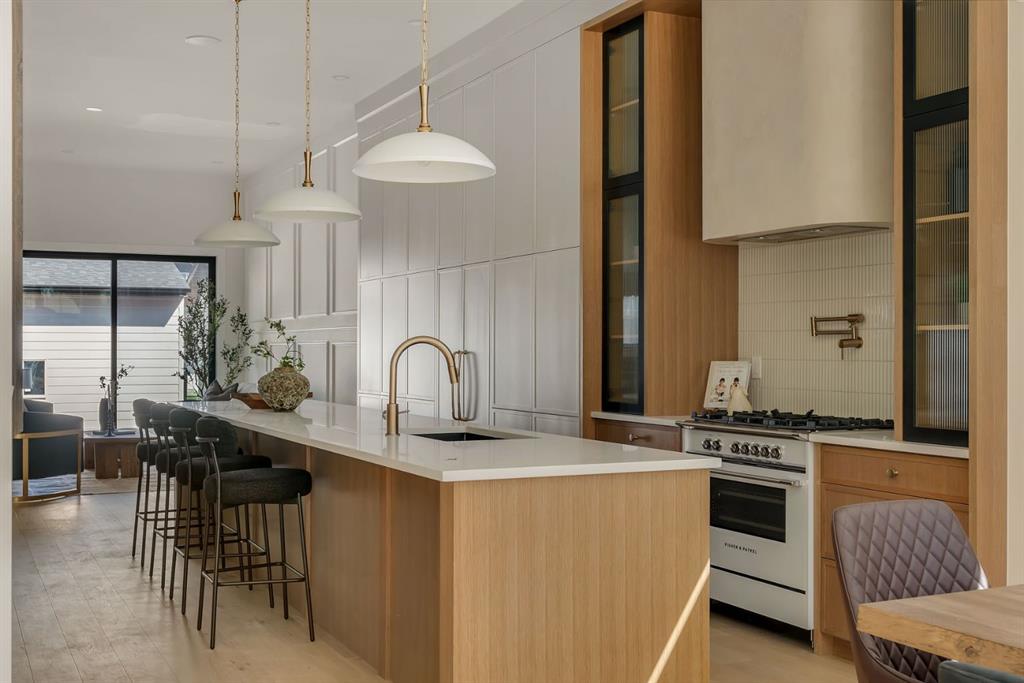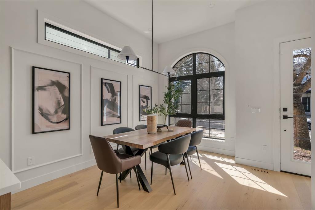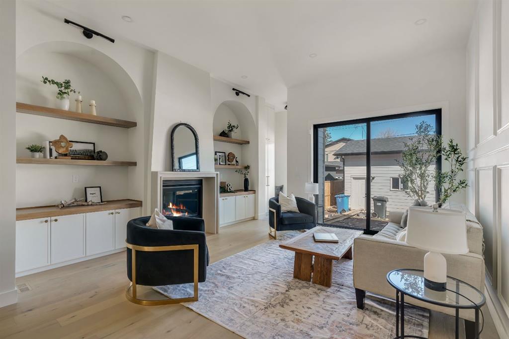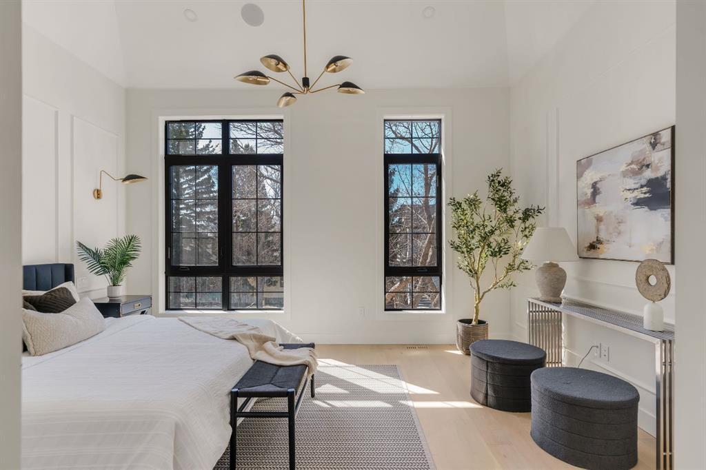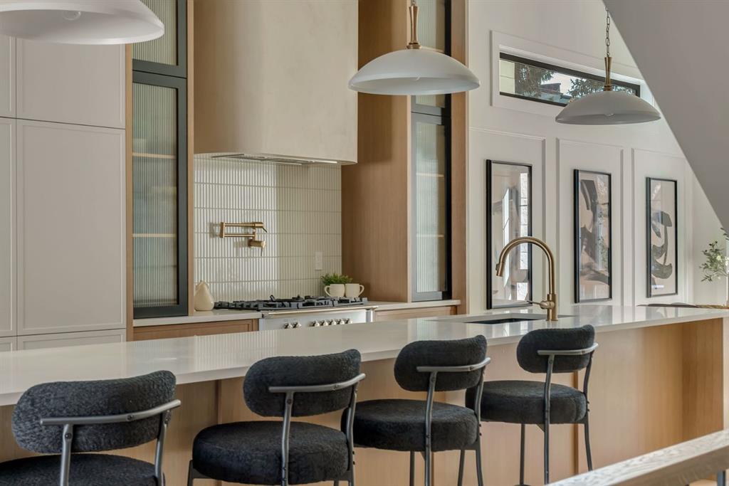 Located just one block from Confederation Park, this beautifully crafted home offers over 2,770 sq ft of refined living space designed with both style and function in mind. The main level features soaring 11-foot ceilings, rich hardwood flooring, a formal dining area with custom wainscoting, large floor to ceiling windows, and a chef-inspired kitchen anchored by a striking 15-foot island, complete with built-in Fisher & Paykel appliances, quartz countertops, an oak island, under-cabinet lighting, a curved plaster hood fan, pot filler, and elegant gold and black accents. The spacious living room is highlighted by a custom plaster gas fireplace with arched oak built-in shelving, while a well-designed mudroom and a designer powder room wrapped in statement wallpaper add everyday convenience and character. Upstairs, 9-foot ceilings and hardwood flooring continue throughout, leading to a stunning primary retreat with vaulted ceilings, detailed wainscoting, and a luxurious 5-piece ensuite featuring in-floor heating and a steam shower rough-in, along with two additional bedrooms, a full 3-piece bathroom, and a dedicated laundry room. The fully finished basement expands the living space with a large recreation area, office, arched wet bar, an additional bedroom, and a 3-piece bathroom. Additional highlights include rough-ins for air conditioning, ceiling speakers, security system, and exterior cameras, along with upgrade options available. Ideally located near parks, schools, shopping, SAIT, the University of Calgary, Foothills Medical Centre, Alberta Children’s Hospital, and offering quick access to the LRT, Highway 1, and Deerfoot Trail, this home combines luxury living with exceptional convenience, with exterior landscaping to be completed as weather permits. Call today to book your private tour!