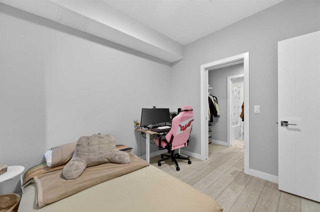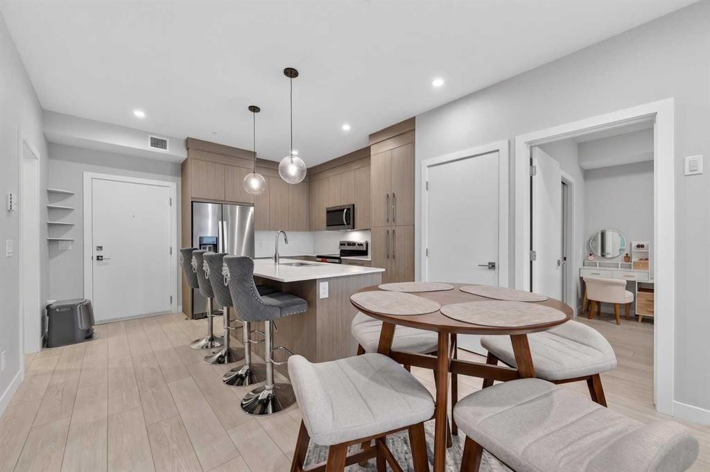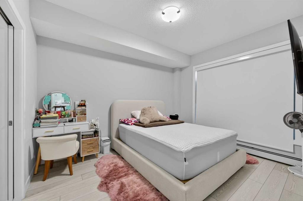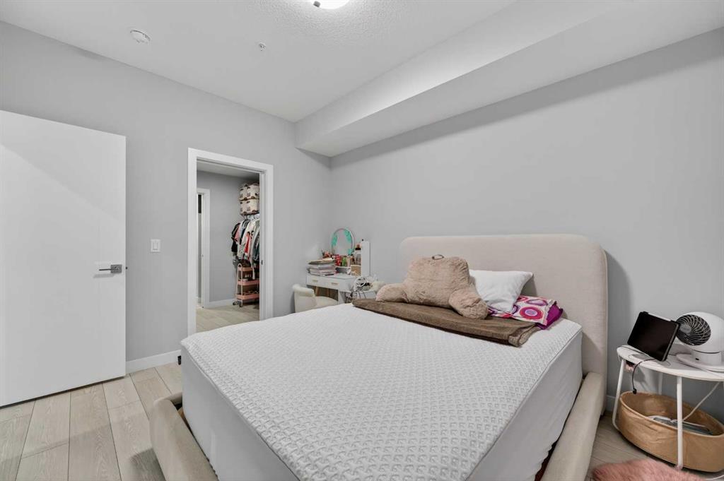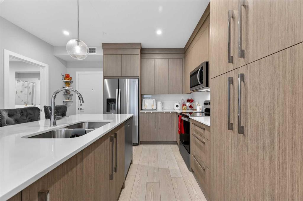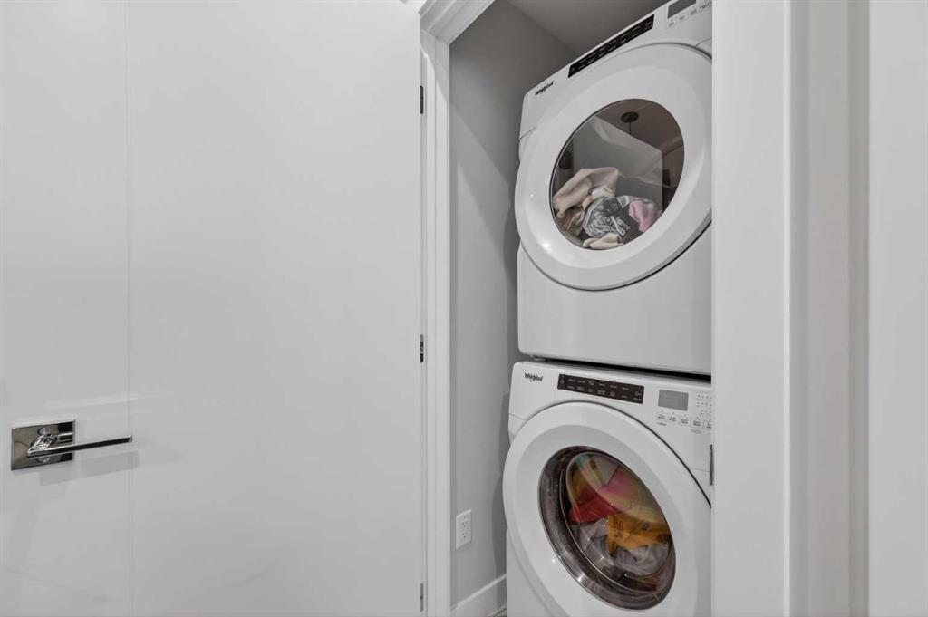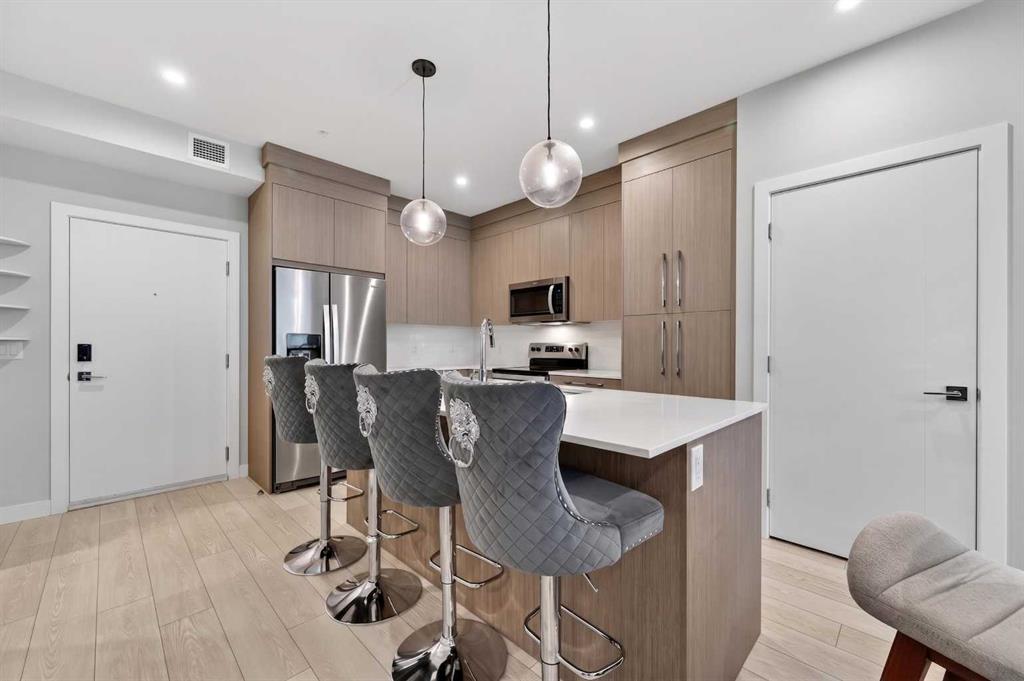 Welcome to this beautiful main-floor West-facing unit, offering over 800sqft of thoughtfully designed living space, complete with underground titled parking. This stunning 2 bed, 2 bath condo features wide plank flooring throughout with open concept living. A stylish chef-inspired kitchen featuring stainless steel appliances, white subway tile backsplash, bright quartz countertops, a pantry, and a kitchen island. A spacious primary bedroom comfortably fits a king-sized bed and includes a walk-through closet leading to a 4-piece ensuite with quartz counters and a glass enclosed shower.The second bedroom is generously sized and located near a modern 3-piece bathroom with sleek finishes and quartz countertops. Enjoy your private patio with a BBQ gas line, ideal for relaxing summer evenings or hosting friends and family. In-suite stacked laundry add to your everyday convenience. This well managed building offers exceptional amenities, including a fitness centre, residents' lounge, dog wash station, and bike wash area. This condo also comes with 1 underground heated parking stall and a storage locker. Located just steps from restaurants, cafés, grocery stores, and parks. Everything you need within minutes of your front door.
