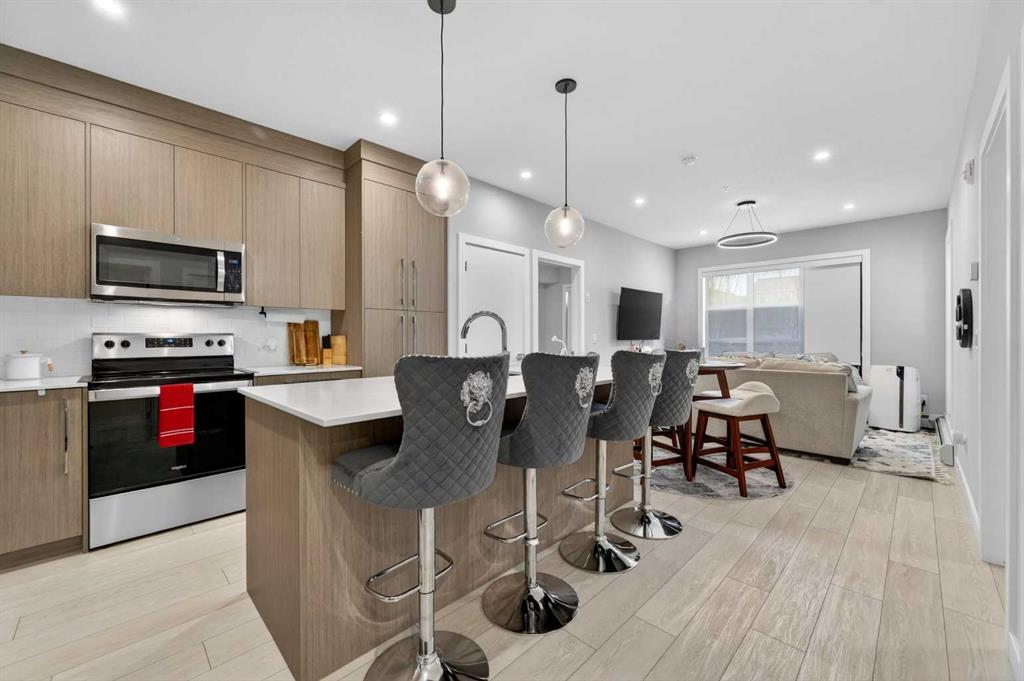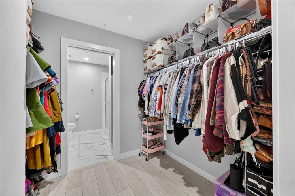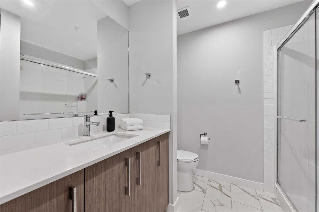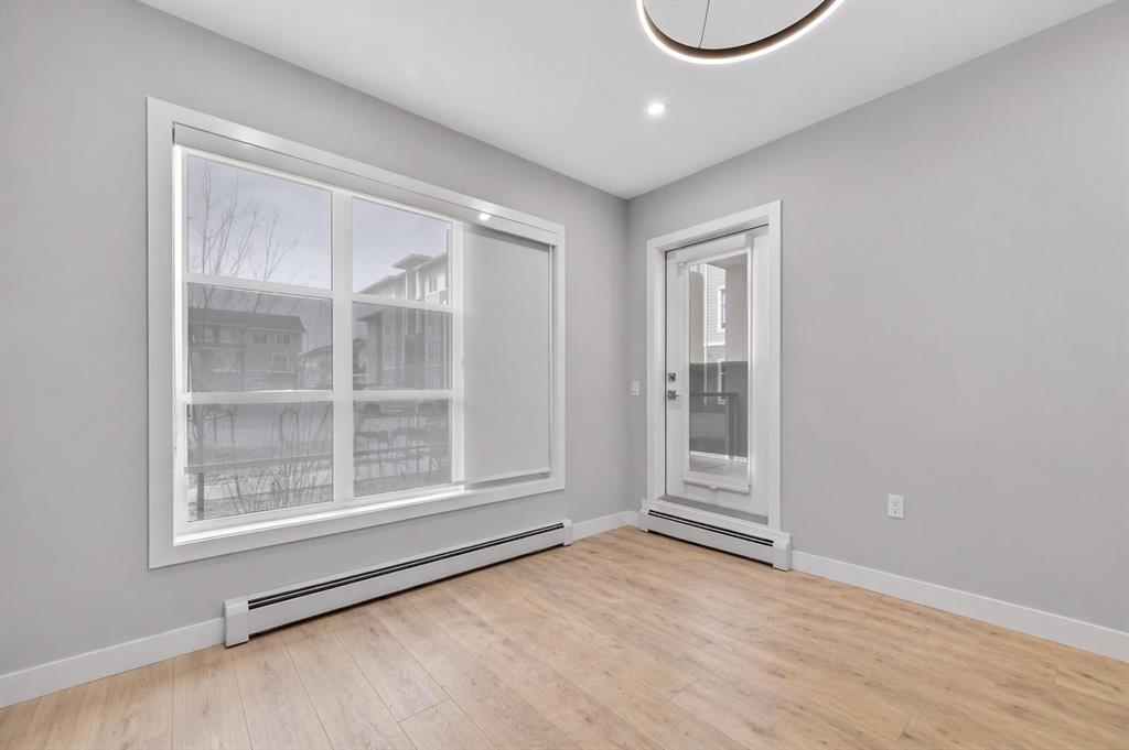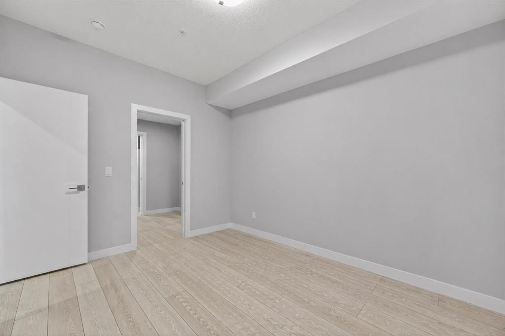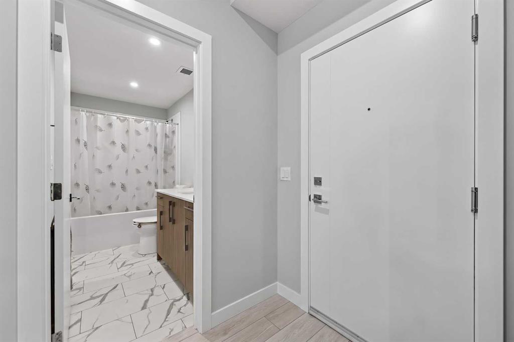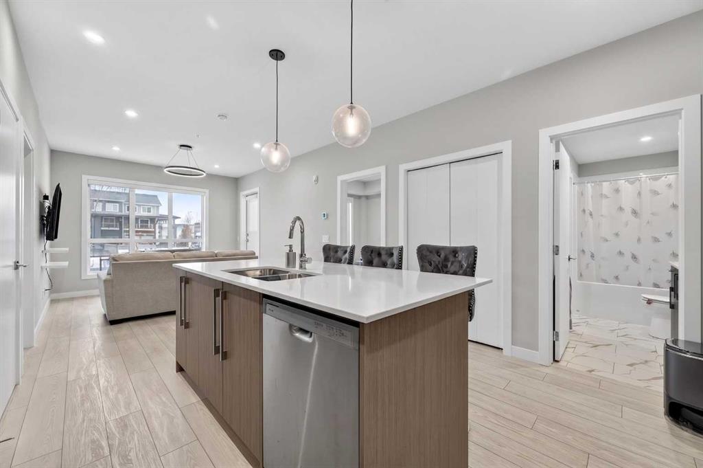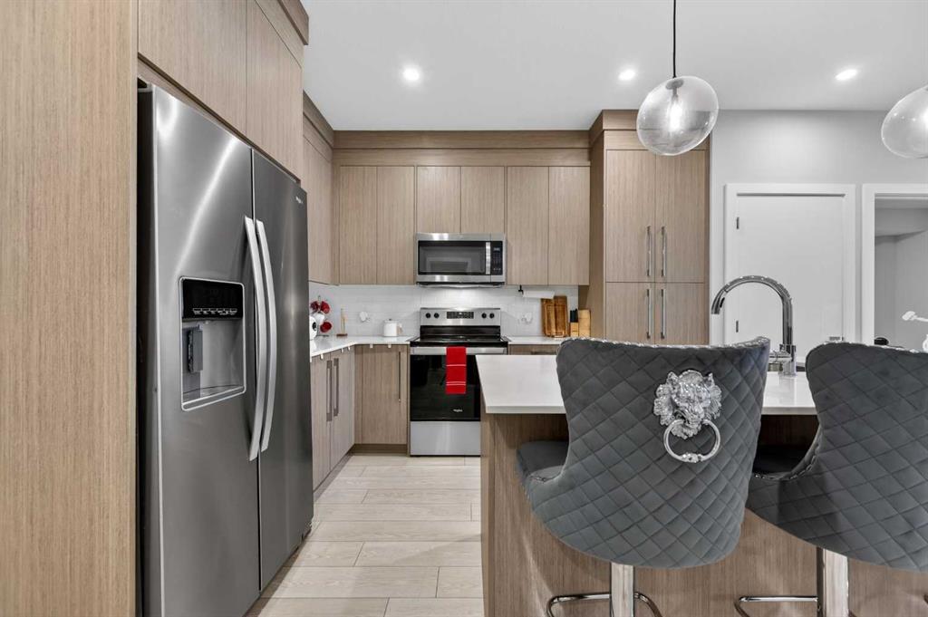 Welcome to this beautiful main-floor West-facing unit, offering over 800sqft of thoughtfully designed living space, complete with underground titled parking. This stunning 2 bed, 2 bath condo features wide plank flooring throughout with open concept living. A stylish chef-inspired kitchen featuring stainless steel appliances, white subway tile backsplash, bright quartz countertops, a pantry, and a kitchen island. A spacious primary bedroom comfortably fits a king-sized bed and includes a walk-through closet leading to a 4-piece ensuite with quartz counters and a glass enclosed shower.The second bedroom is generously sized and located near a modern 3-piece bathroom with sleek finishes and quartz countertops. Enjoy your private patio with a BBQ gas line, ideal for relaxing summer evenings or hosting friends and family. In-suite stacked laundry add to your everyday convenience. This well managed building offers exceptional amenities, including a fitness centre, residents' lounge, dog wash station, and bike wash area. This condo also comes with 1 underground heated parking stall and a storage locker. Located just steps from restaurants, cafés, grocery stores, and parks. Everything you need within minutes of your front door.