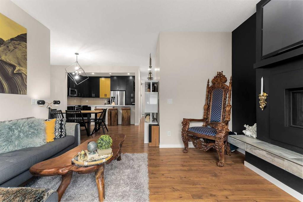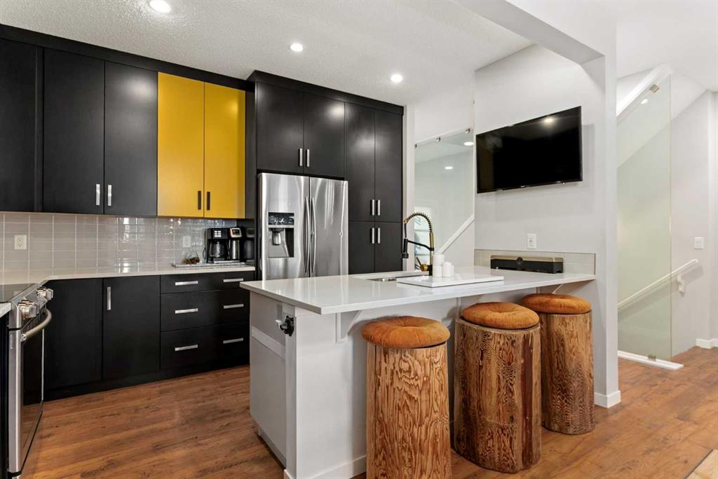 Inside, architectural details set the tone with a striking feature fireplace wall, full-height tempered glass architectural divider, built-in media shelving, and whole-home smart lighting and dimmers. The upgraded kitchen showcases quartz countertops, modern cabinet refacing, pull-out storage organizers, a stylish backsplash, and a smart fridge with a hidden pantry entry, blending sleek aesthetics with everyday functionality.