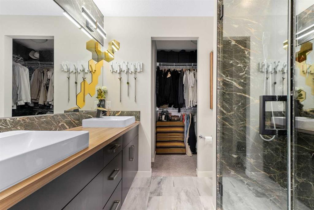 Upstairs, the spa-inspired ensuite delivers standout luxury with a custom walk-in steam shower, rainfall showerhead, frameless glass enclosure, oversized tilework, a soaker tub, a double vanity with an LED mirror, and motion-sensor lighting. Thoughtful storage solutions continue throughout with closet organizers, built-in shelving, a mudroom with custom storage, and an organized laundry space featuring a Samsung washer and dryer.