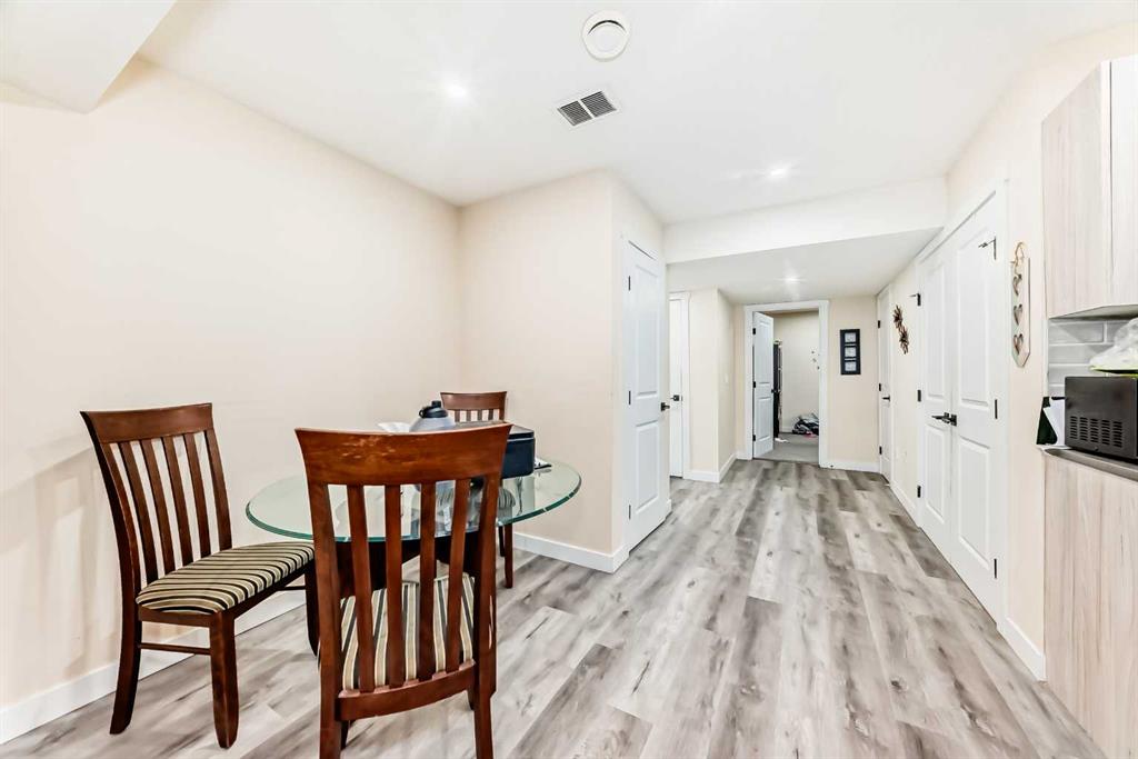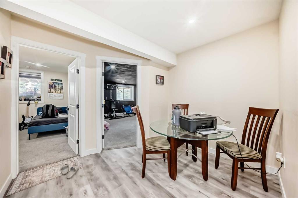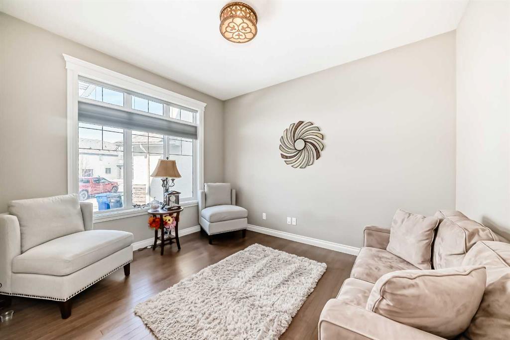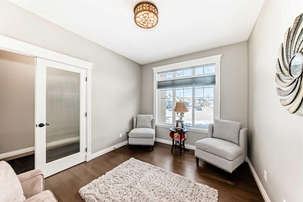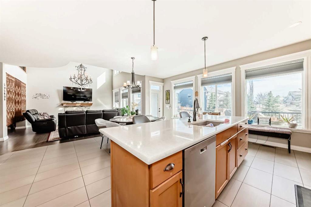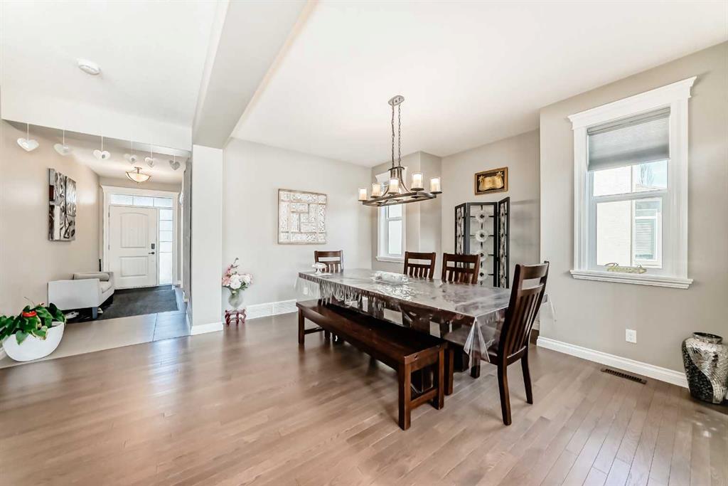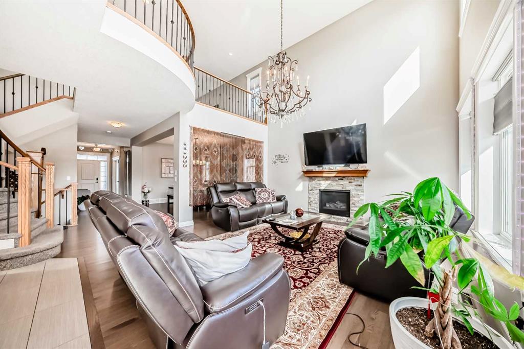 The main floor is having Bedroom with an attached Bathroom and is full of natural light from expansive south-facing windows. The open-concept main floor seamlessly connects the dining room, living room, and kitchen—perfect for entertaining or keeping an eye on the family. The spacious dining area comfortably seats eight people and flows into the impressive two-story living room, highlighted by a statement chandelier and cozy gas fireplace.