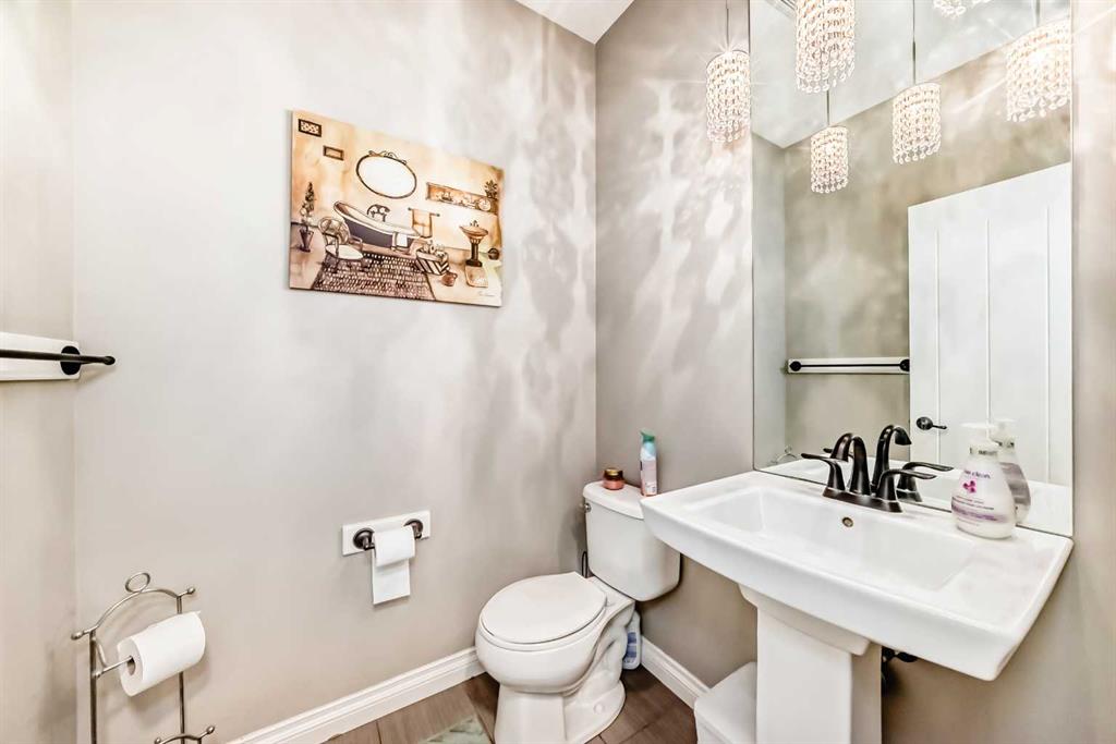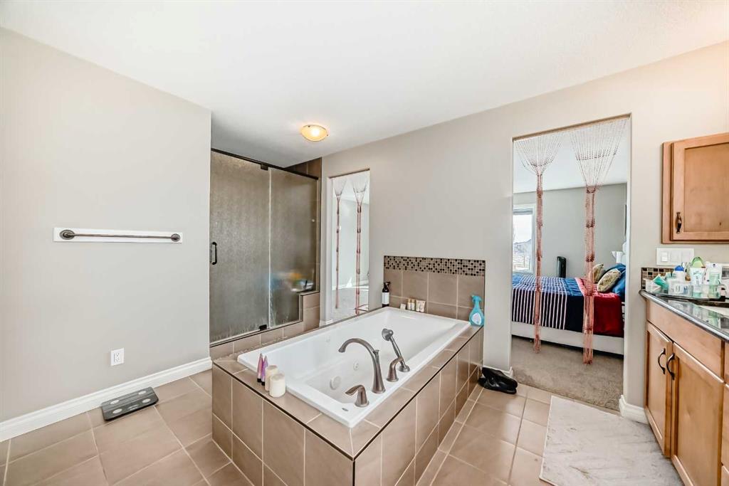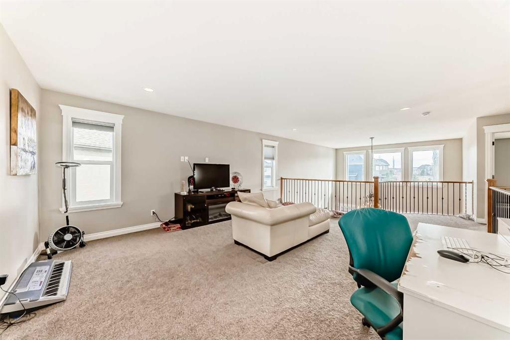 Up the stunning semi-spiral staircase, a generous bonus room overlooks the main living space below, offering the perfect retreat for relaxation or entertainment. The thoughtfully designed split floor plan ensures privacy in the primary suite, which overlooks the rear pathway and includes a walk-in closet and a luxurious 5-piece ensuite complete with a jetted tub, standalone shower, dual vanity, and private water closet.