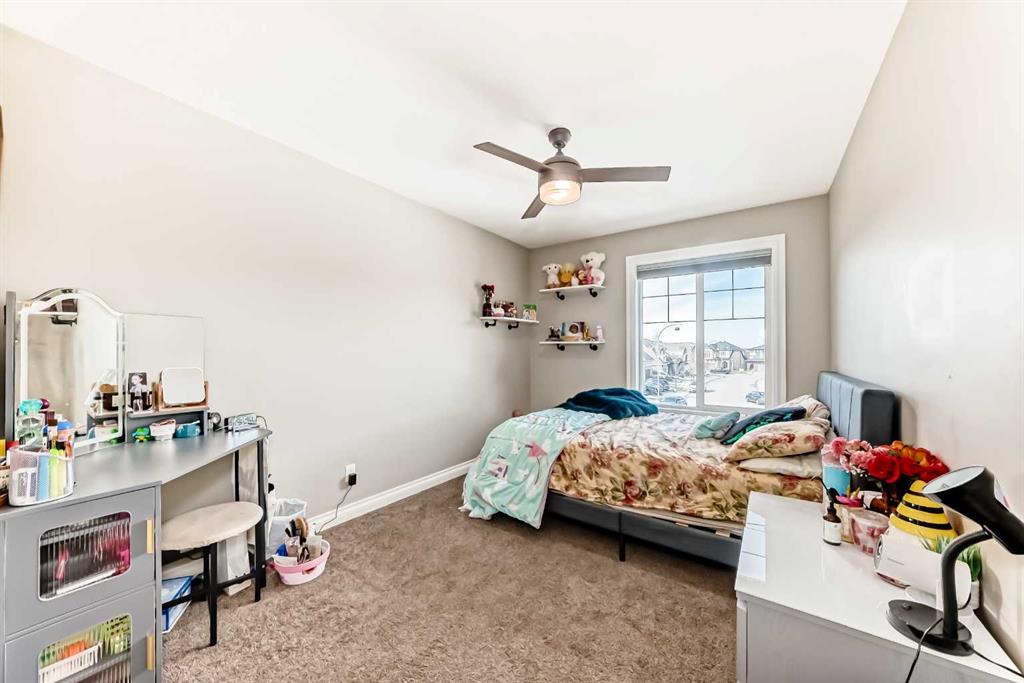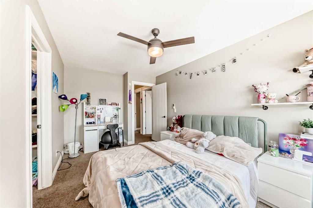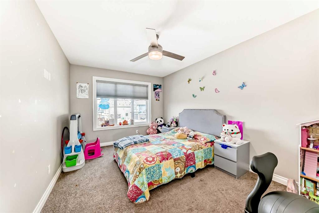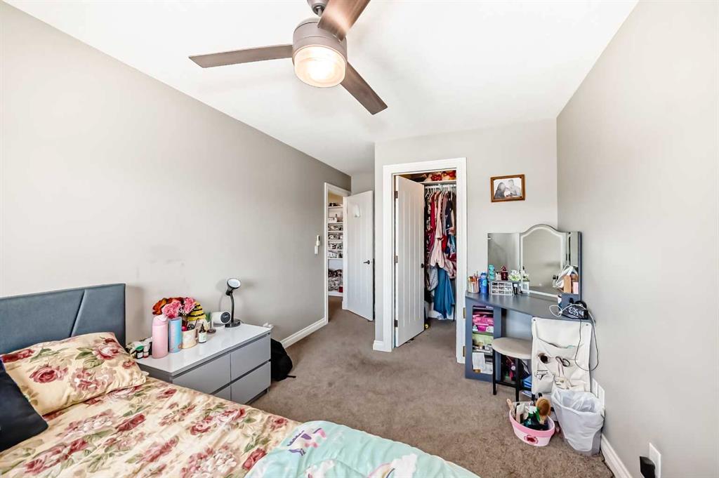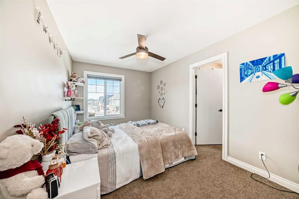 Three additional bright bedrooms—each with its own walk-in closet—share a well-appointed 5-piece bathroom with dual vanities and a wall-mounted mirror. The upper-level laundry room and large linen closet add everyday convenience.