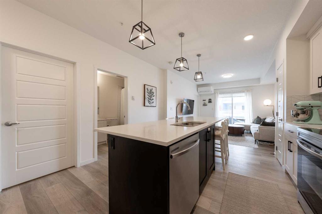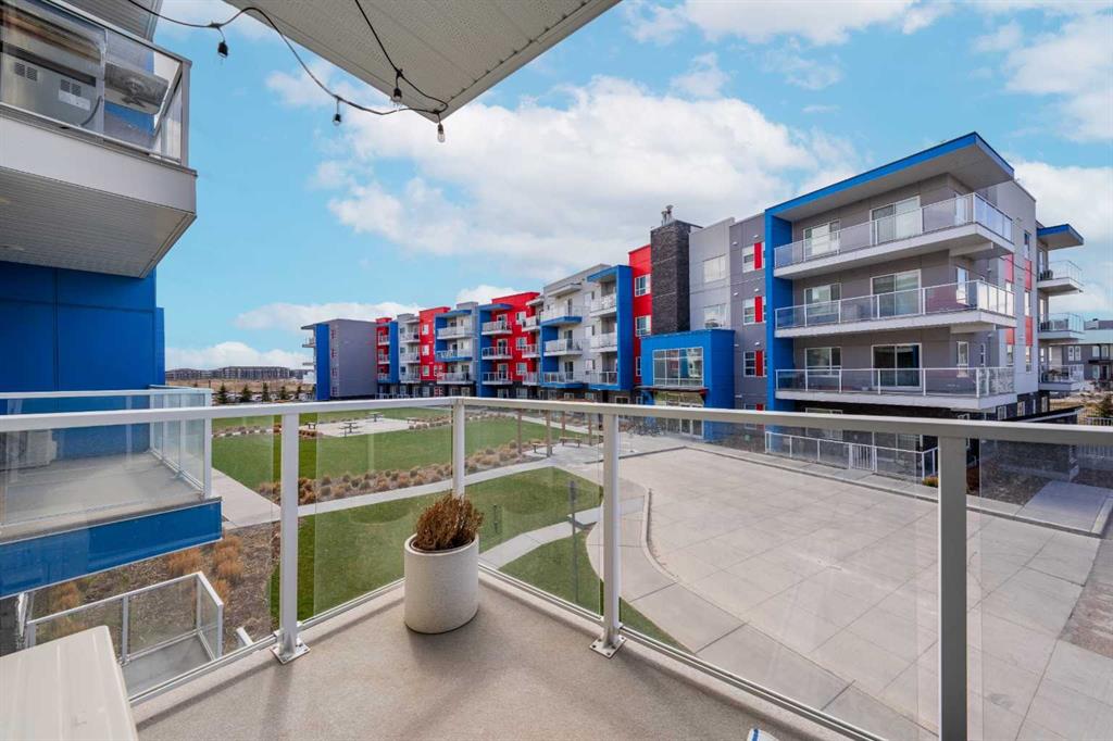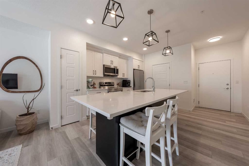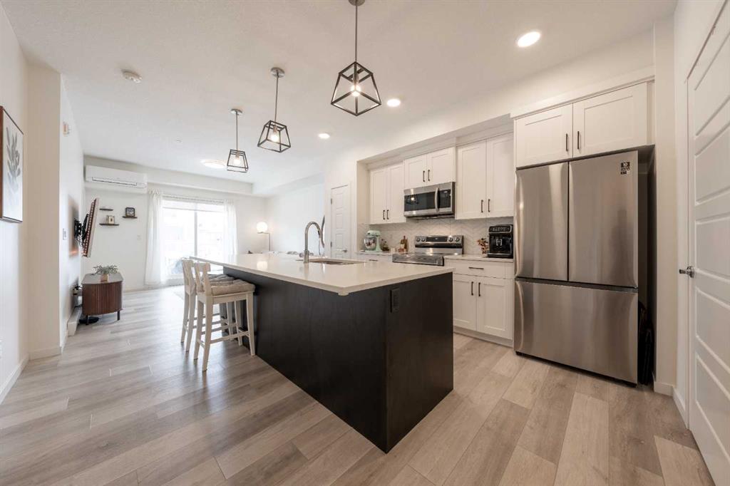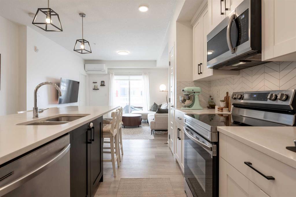 Welcome to this beautifully presented 2 BEDROOM, 2 BATHROOM apartment in the vibrant and highly walkable community of SETON. Offering 722 SQ. FT. of thoughtfully designed living space, this second-floor unit combines modern finishes, everyday comfort, and an outstanding location close to many of southeast Calgary’s best amenities. The bright, open-concept layout features CENTRAL AIR CONDITIONING, stylish VINYL PLANK FLOORING, contemporary lighting, and large patio doors that fill the main living area with natural light. The kitchen is beautifully finished with QUARTZ COUNTERTOPS, full-height cabinetry, stainless steel appliances, a microwave hood fan, tile backsplash, and a large central island with seating, creating a functional and inviting space for cooking, dining, and entertaining. The living room flows easily onto the WEST-FACING BALCONY, where you can enjoy fresh air, evening sun, and views into the well-kept interior courtyard area.
