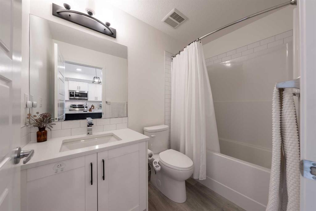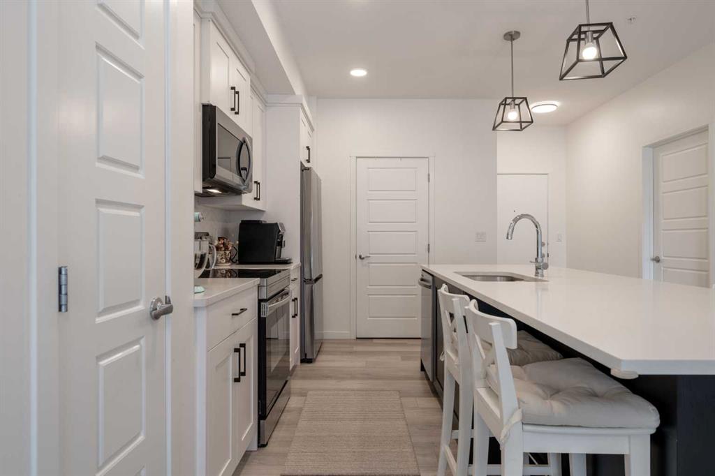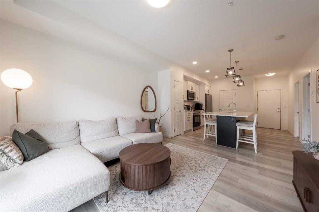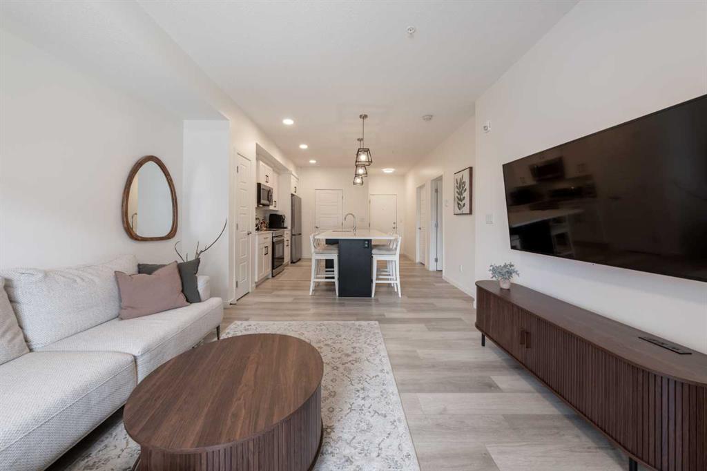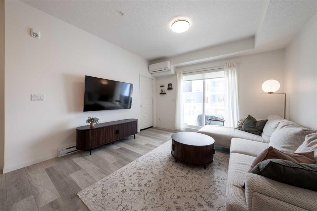 Welcome to this beautifully presented 2 BEDROOM, 2 BATHROOM apartment in the vibrant and highly walkable community of SETON. Offering 722 SQ. FT. of thoughtfully designed living space, this second-floor unit combines modern finishes, everyday comfort, and an outstanding location close to many of southeast Calgary’s best amenities. The bright, open-concept layout features CENTRAL AIR CONDITIONING, stylish VINYL PLANK FLOORING, contemporary lighting, and large patio doors that fill the main living area with natural light. The kitchen is beautifully finished with QUARTZ COUNTERTOPS, full-height cabinetry, stainless steel appliances, a microwave hood fan, tile backsplash, and a large central island with seating, creating a functional and inviting space for cooking, dining, and entertaining. The living room flows easily onto the WEST-FACING BALCONY, where you can enjoy fresh air, evening sun, and views into the well-kept interior courtyard area.