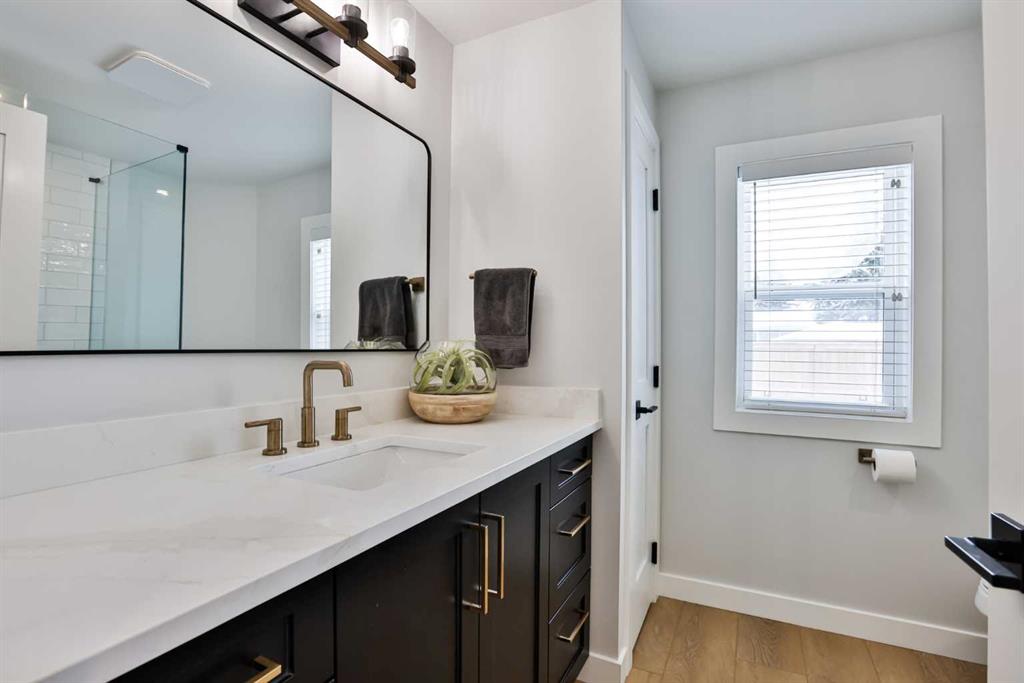 The living room is anchored by a stylish electric fireplace with a wood mantle and shiplap feature wall, adding warmth and character. The interior has been thoughtfully updated with modern finishes including luxury vinyl plank flooring, updated trim and baseboards, fresh paint, and sleek flat ceilings. The kitchen has been beautifully updated with new cabinetry, quartz countertops, fixtures, appliances, and a Blanco sink, while the bathrooms feature quartz countertops, custom glass showers, updated vanities, fixtures, and tile work—creating a clean, cohesive feel throughout.