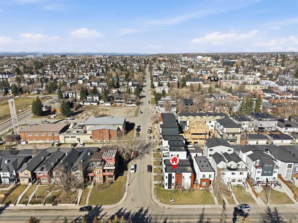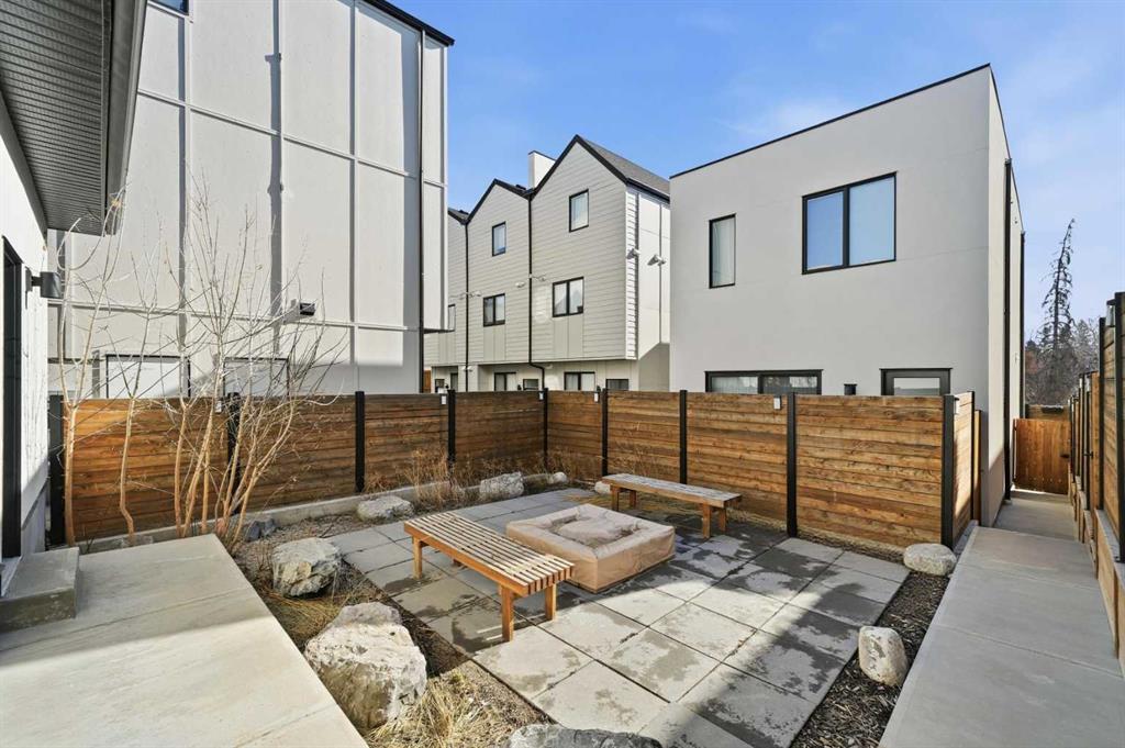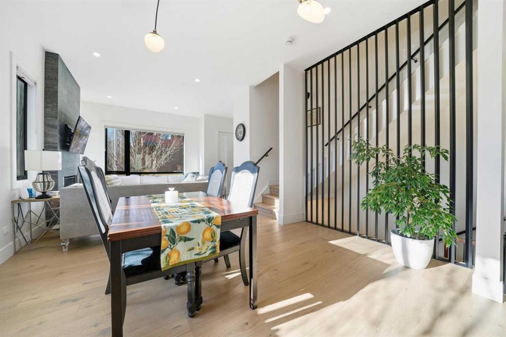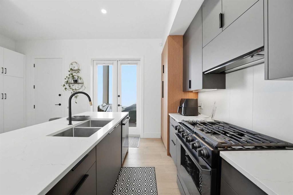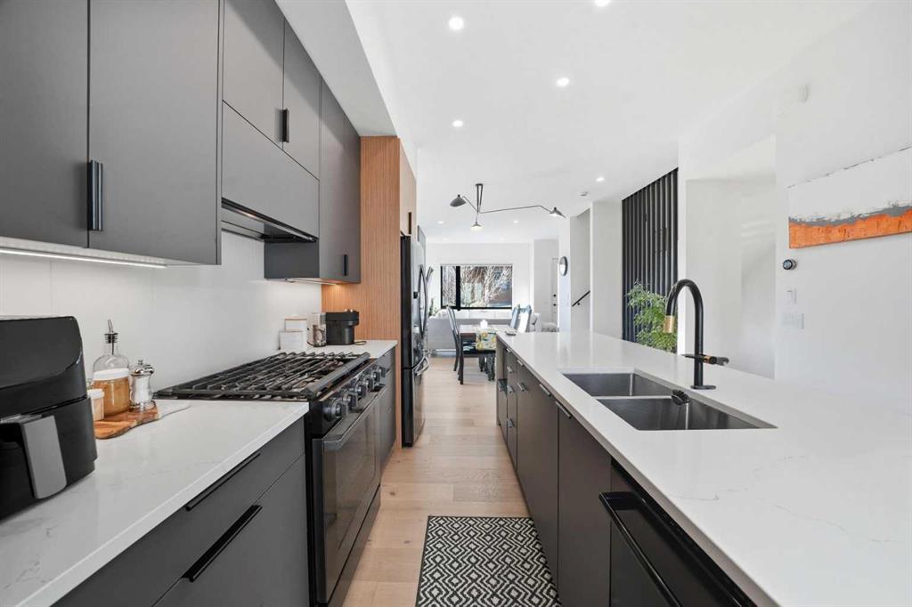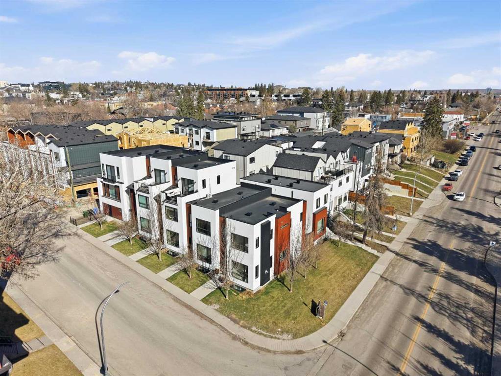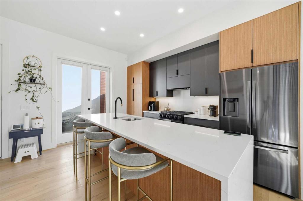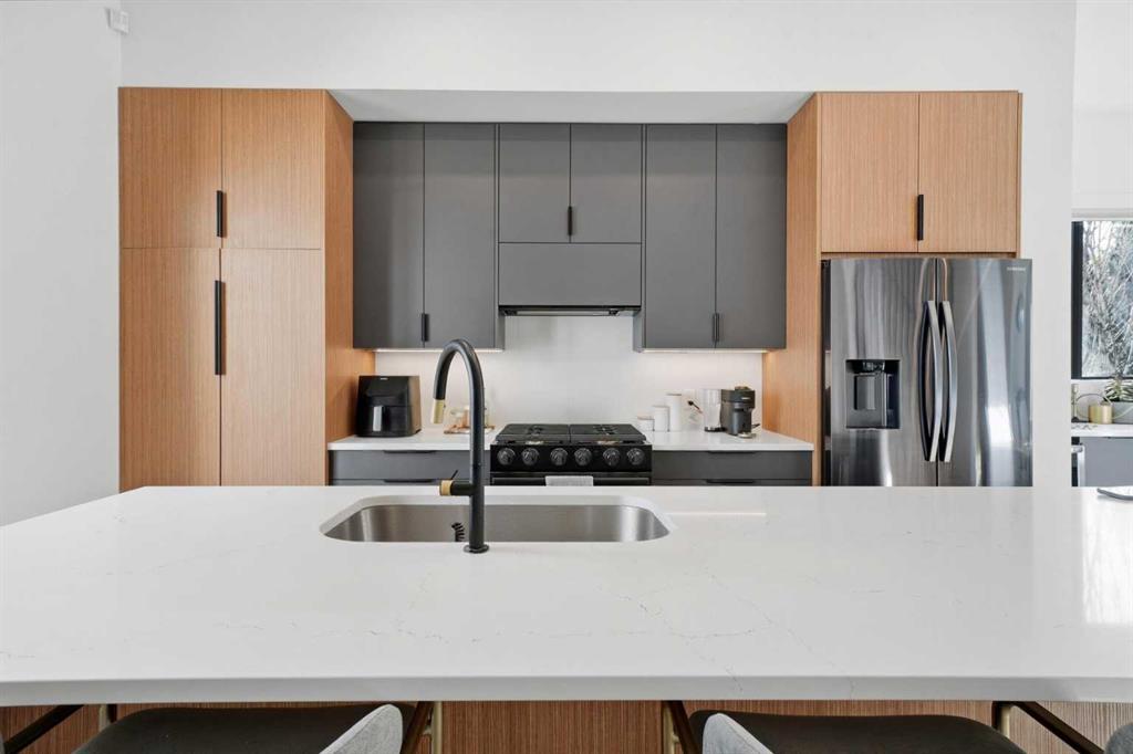 Welcome to Alto37, an exceptional urban residence in the heart of Mardaloop, masterfully built by Urban Craft Homes and thoughtfully designed with interiors curated by JRstudioworks. This rare, extra-wide 2-storey townhome spans nearly 1,900 sq ft of refined living space and offers a layout that truly sets it apart from anything else on the market. Positioned as a bright corner unit, this home is flooded with natural light from expansive south-facing windows, creating an open, airy atmosphere throughout. The main level showcases impressive 10-foot ceilings, wide staircases, and a sleek, minimalist aesthetic that perfectly balances form and function. The spacious dining area is ideal for hosting, while the chef-inspired kitchen features a gas range, high-end appliances, and custom cabinetry designed for both everyday living and elevated entertaining. The signature extra-wide floor plan allows for full-sized furnishings, an uncommon luxury in townhome living—providing both comfort and versatility. Step directly from the kitchen onto your private rooftop deck, complete with a privacy fence and perfect for summer BBQs and relaxing evenings. Upstairs, the primary retreat offers a serene escape with sunny south exposure and a beautifully appointed ensuite. Two additional bedrooms, a full bathroom, and convenient upper-floor laundry complete the level, making it ideal for families or professionals alike, Additional highlights include central air conditioning, a single attached garage with epoxy flooring, and premium finishings throughout. Located just steps from one of Calgary’s best off-leash dog parks, as well as top-rated restaurants, cafes, and public transit, this home delivers the ultimate inner-city lifestyle. A rare opportunity to own a standout property in one of Calgary’s most desirable communities.