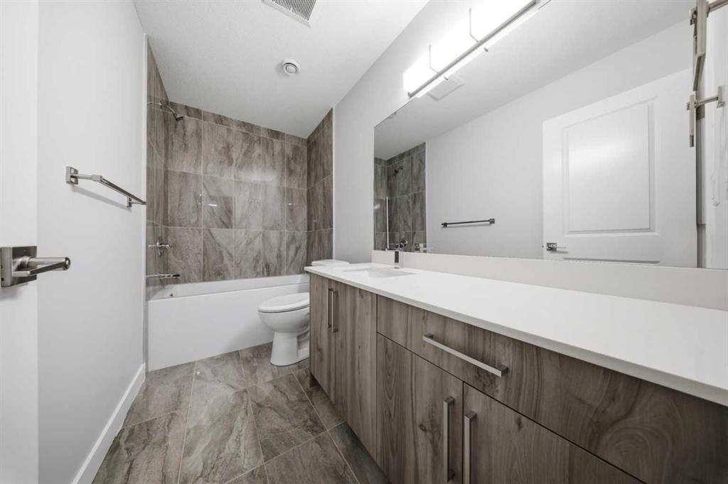 Upstairs, an elegant open-railing staircase enhances the modern design with clean sightlines and an expansive open feel. The upper level offers three spacious bedrooms and a conveniently enclosed laundry area complete with wire shelving. The primary retreat is designed to impress — the spa-inspired ensuite features floor-to-ceiling tile work, a full-width vanity mirror, and a soaker jacuzzi tub that transforms your daily routine into a luxury experience.