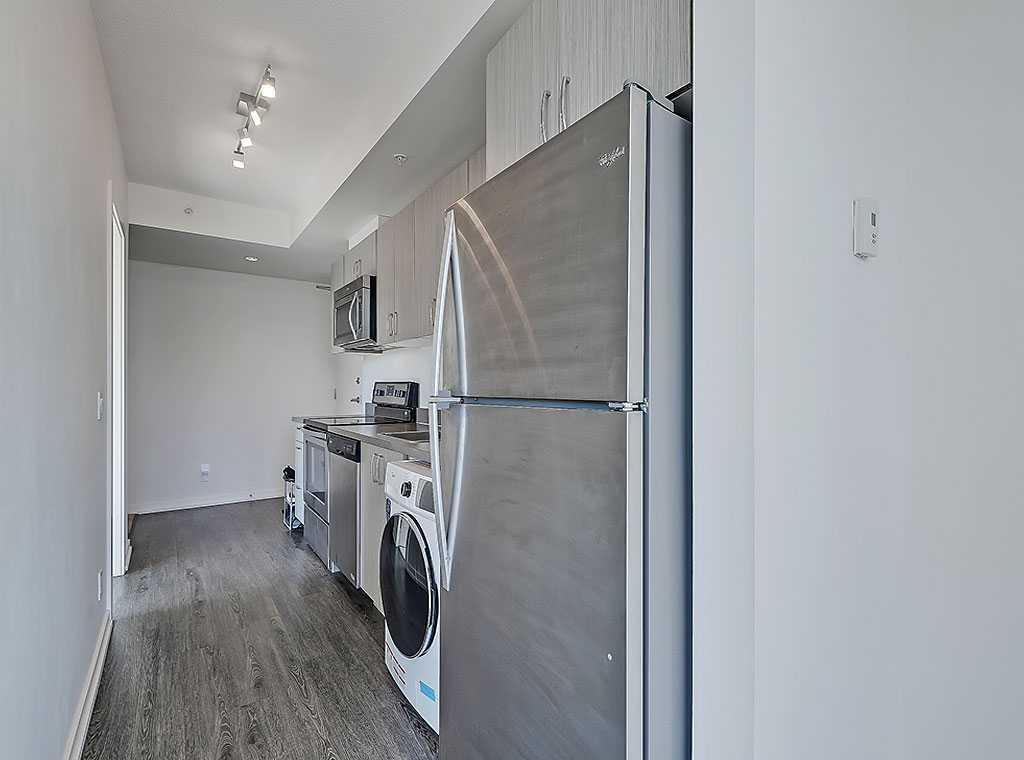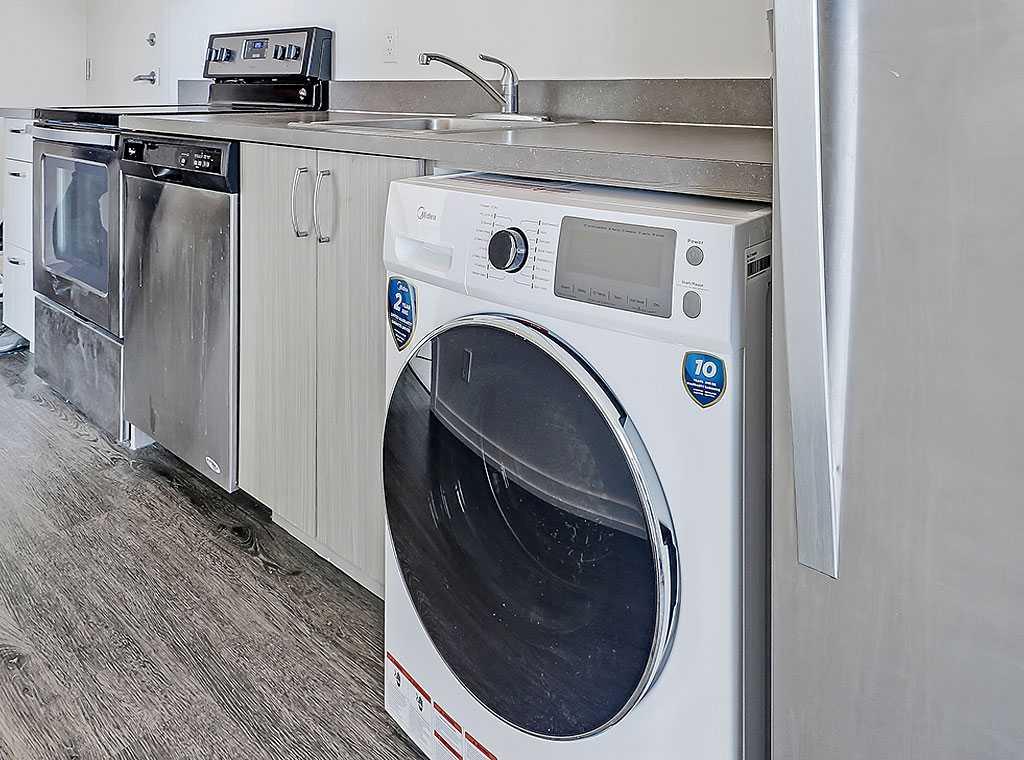 The contemporary kitchen features sleek cabinetry and stainless steel appliances—perfectly suited for both everyday living and entertaining. The bedroom is designed with comfort and efficiency in mind, while in-suite laundry and a dedicated storage locker add everyday convenience.