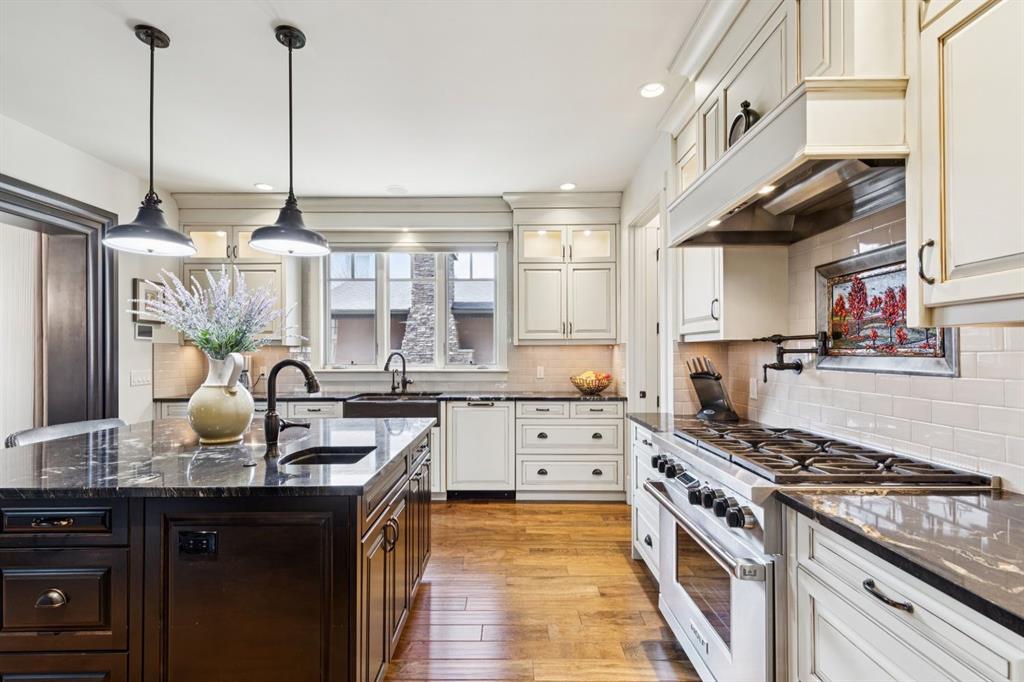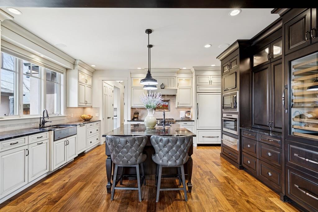 An exceptional Altadore residence where timeless craftsmanship, thoughtful design, and abundant natural light converge create a truly one-of-a-kind family home. From the moment you arrive, the stunning curb appeal and inviting front porch set the tone for what awaits inside. A grand two-storey foyer welcomes you with a striking full height stone feature wall and soaring ceilings that immediately showcase the home’s architectural presence. Gorgeous hardwood floors lead you into a breathtaking living room with vaulted ceilings, a large picture window flooding the space with natural light, and a dramatic two-way stone fireplace that seamlessly connects to the elegant dining room, complete with cove lighting and sliding glass doors opening to the rear patio. Through a beautifully crafted archway, the kitchen is nothing short of a masterpiece featuring site-built cabinetry in rich espresso and cream tones, luxurious granite countertops, and an expansive island with prep sink and seating. Premium appliances include a full Wolf gas range with pot filler, built-in Wolf microwave, steam oven, warming drawer, Sub-Zero panelled fridge, Miele dishwasher, wine fridge, and beverage drawers. A custom glass art installation by Calgary artist Julianna Reece creates a stunning focal point above the cooktop. A walk-in pantry, service area, and thoughtfully designed mudroom with convenient wash/dryer complete the space. The main floor also offers a refined den with exquisite millwork and fireplace, perfectly positioned near the elevator for added convenience. Upstairs, the primary retreat is a serene escape with vaulted ceilings, a sitting area, dressing space, and a spa-inspired ensuite featuring a clawfoot tub. A second soundproofed bedroom with ensuite ensures comfort and privacy. Designed for entertaining, the lower level impresses with a spacious family room with custom media wall, games area with a full wet bar, Miele dishwasher and two beverage drawers, and a show-stopping wine cellar. A massive rec room with cork flooring offers flexibility for a home gym and can be easily converted to include an additional bedroom, alongside a third bedroom and full bath. Outdoors, the private backyard oasis features a stone tile patio, wood burning fireplace, and mature trees for seasonal privacy, perfect for hosting or relaxing. A triple detached garage completes this extraordinary property, enhanced by Control4 automation and irrigation. Ideally located in the heart of Altadore, this home is just steps to local favourites like Neighbour Coffee, as well as highly regarded nearby schools, parks, and the vibrant amenities and dining experiences of Marda Loop, offering an unmatched lifestyle in one of Calgary’s most desirable inner-city communities.