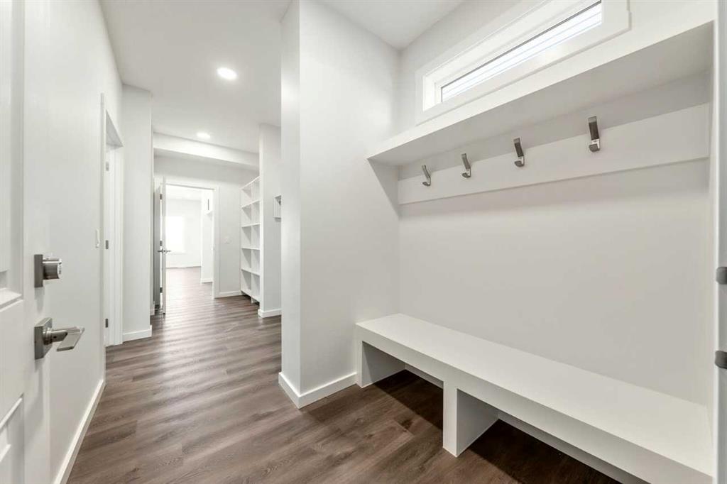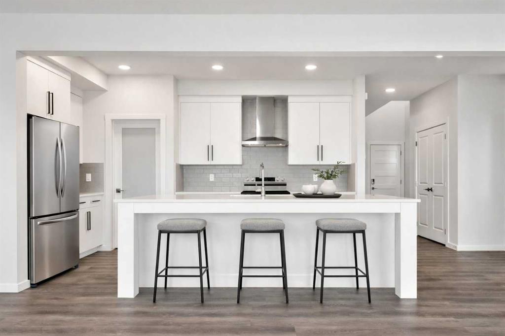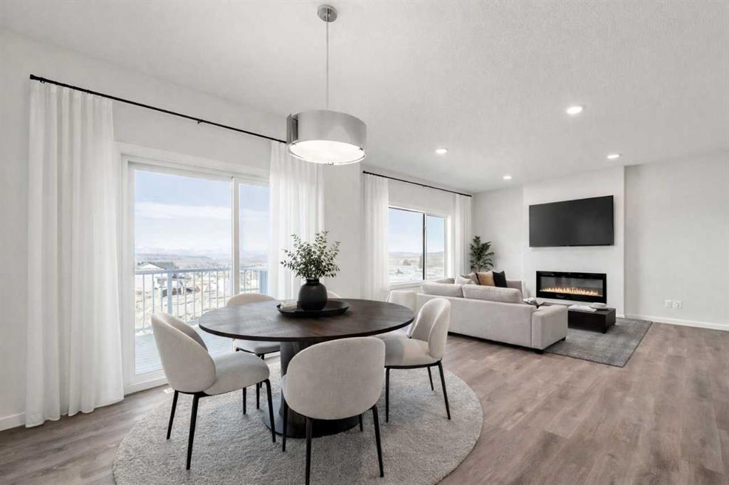 Framed by breathtaking mountain views from the rear, this 3-bed, 2.5-bath, 2,237 sq ft front-attached garage home delivers refined, quick-possession living at its finest. An open-to-above foyer flows into a sun-drenched main floor with 9' ceilings and a great room anchored by a 50" electric fireplace. The chef's kitchen stuns with quartz countertops, ceiling-height cabinetry, chimney hood fan, oversized island, and walk-through pantry. Upstairs, the primary bedroom features a private sitting area, custom walk-in closet with direct laundry access, and a spa-style ensuite with double sinks, soaker tub, and tiled shower. A walkout basement with 9' foundation offers exceptional development potential, while an extended concrete patio and rear deck elevate outdoor living. High-efficiency furnace, HRV system, and soft-close finishes throughout.
