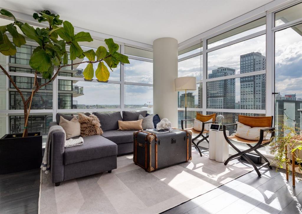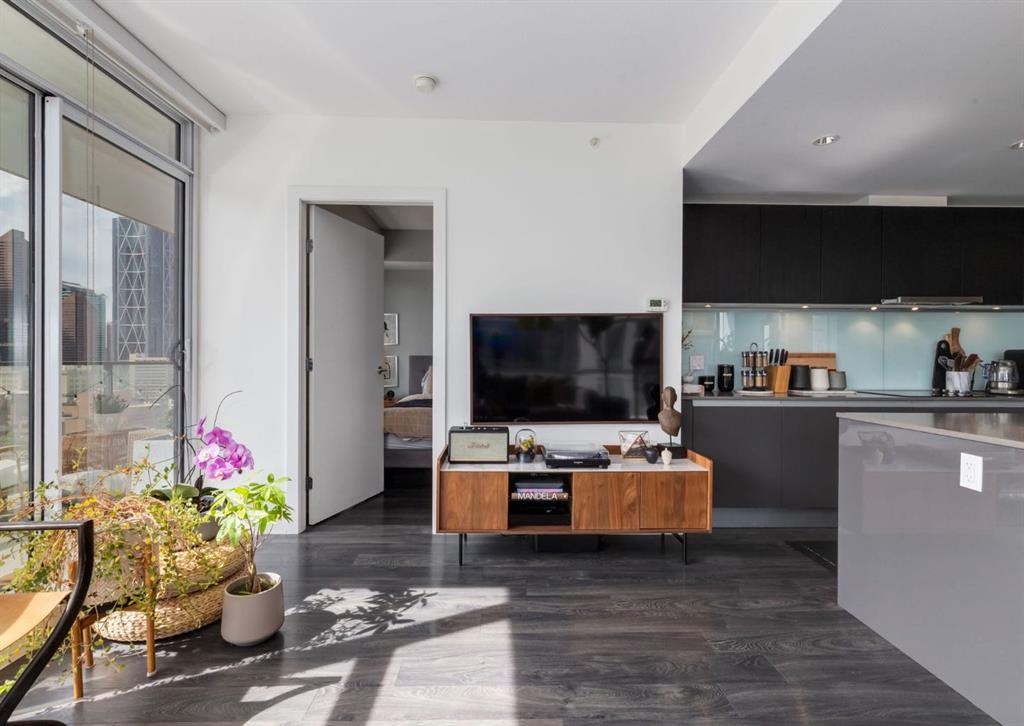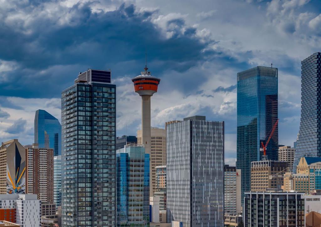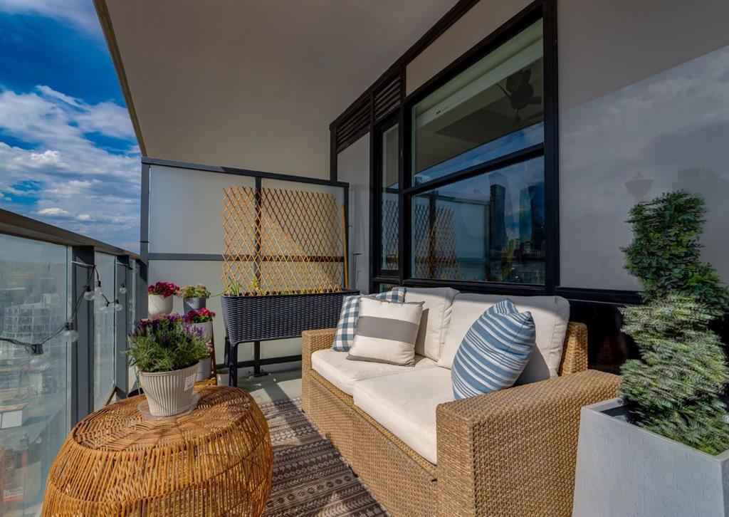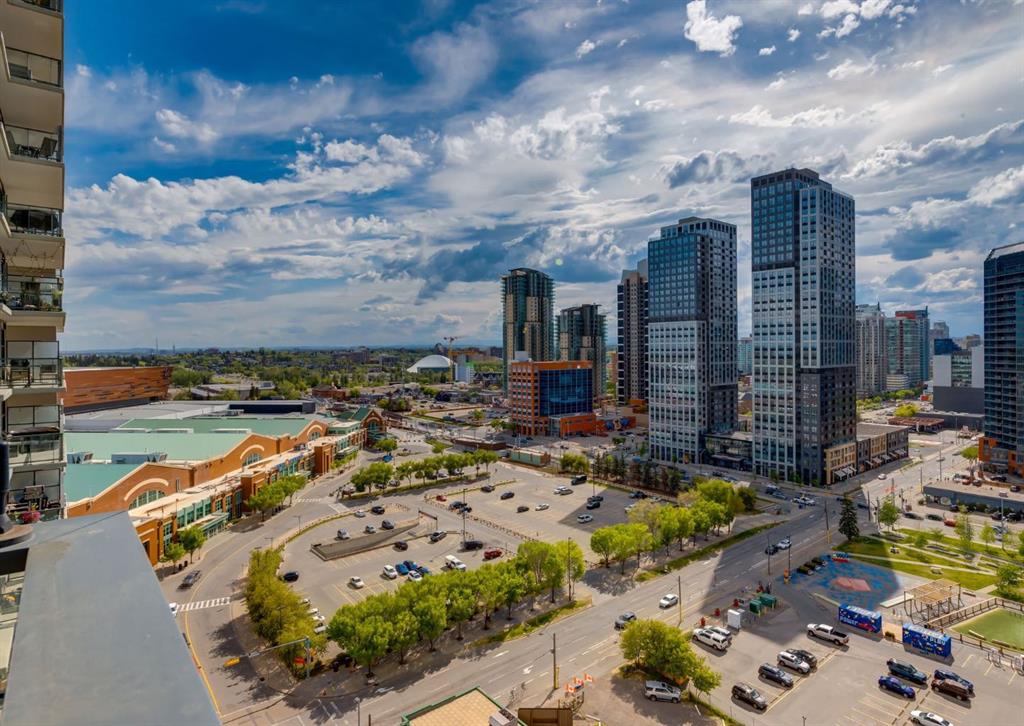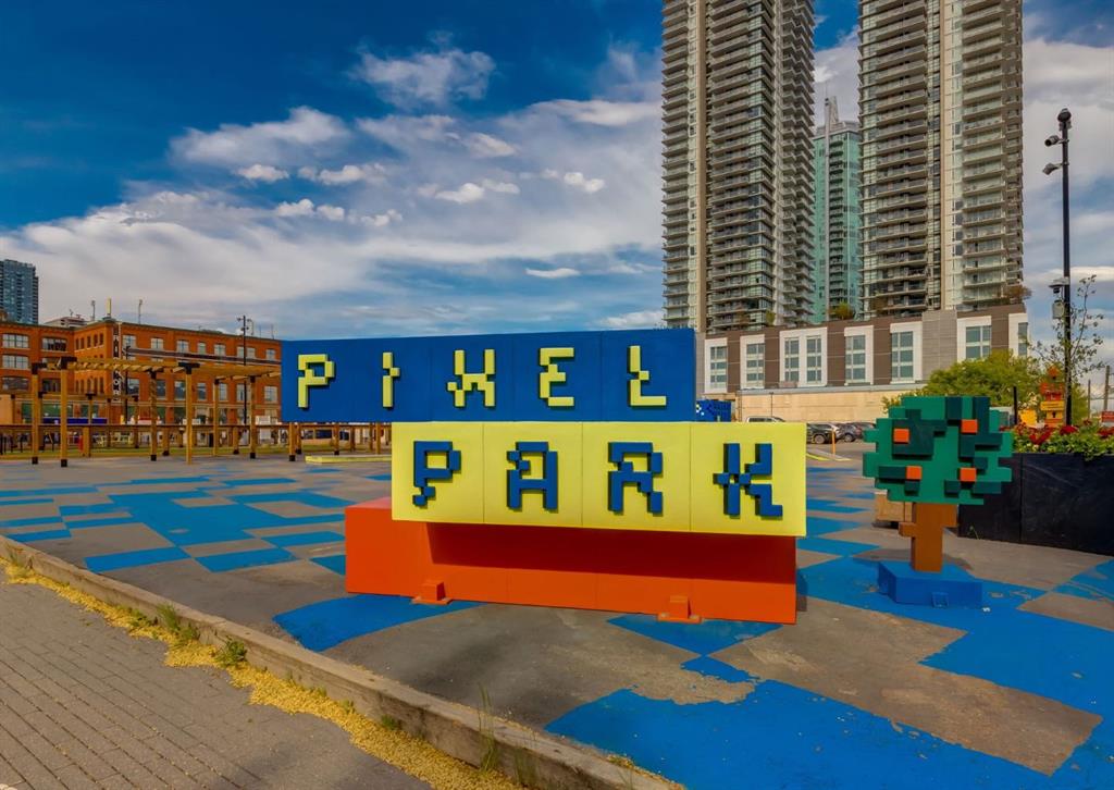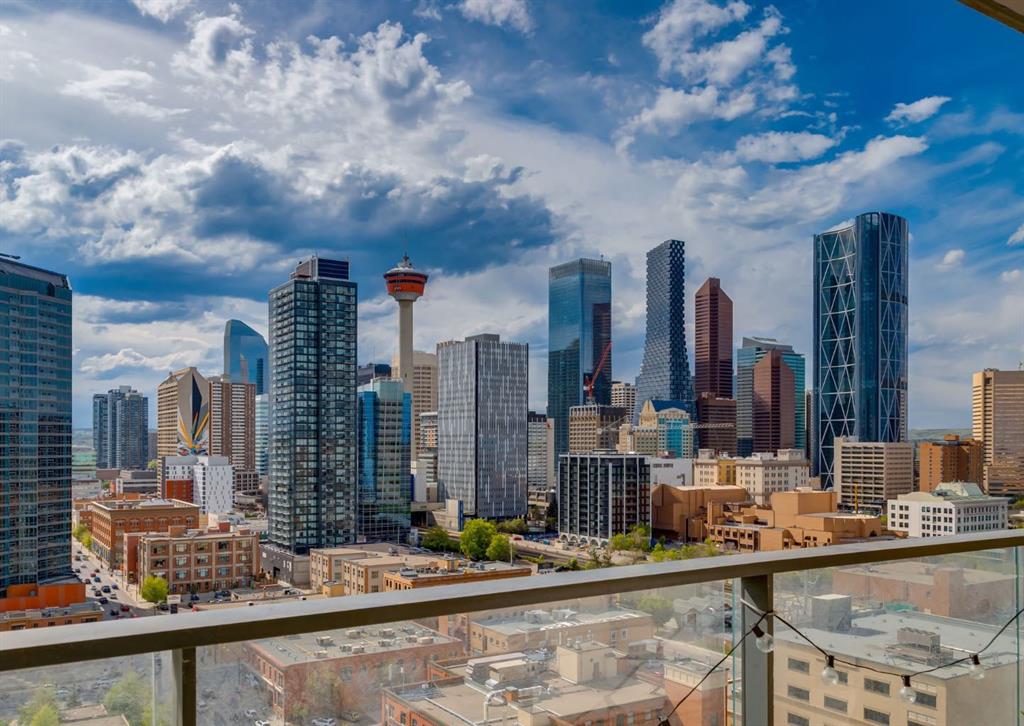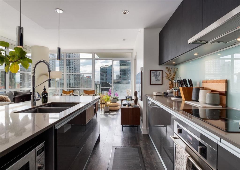 SW CORNER UNIT with MOUNTAIN VIEWS + CITY VIEWS + TANDEM PARKING! This bright and welcoming open-concept home is filled with natural light and offers 2 bedrooms, 2 full bathrooms, tandem titled parking for two vehicles, and a large balcony with breathtaking views you’ll enjoy every day. The modern kitchen features sleek cabinetry, stainless steel appliances including panelled refrigeration, quartz countertops, and plenty of storage. The primary bedroom easily fits a king-size bed and includes a walk-through closet with custom built-ins leading to a contemporary ensuite. The second bedroom is conveniently located next to a full 3-piece bathroom—perfect for guests, roommates, or a home office. Enjoy the perks of this executive concrete building, which offers concierge service, a fitness centre, party room, rooftop terrace, workshop, air conditioning, high-speed elevators, visitor parking, and a separate assigned storage locker. Impeccably maintained by its original owners, this move-in-ready home is also pet friendly (with board approval) and ideally located—just steps from Pixel Park, river pathways, the LRT, Stampede Grounds, Central Library, restaurants, cafes, shops, and groceries. Floor plans and a 3D tour are readily available, providing a glimpse into this stylish condo!