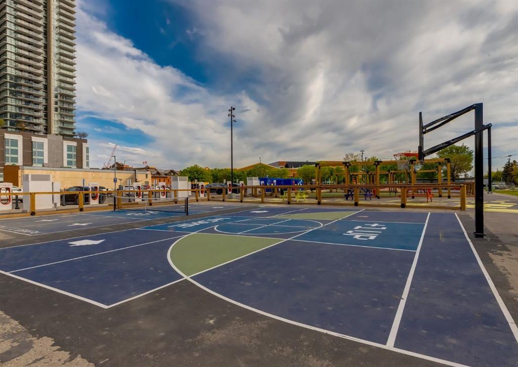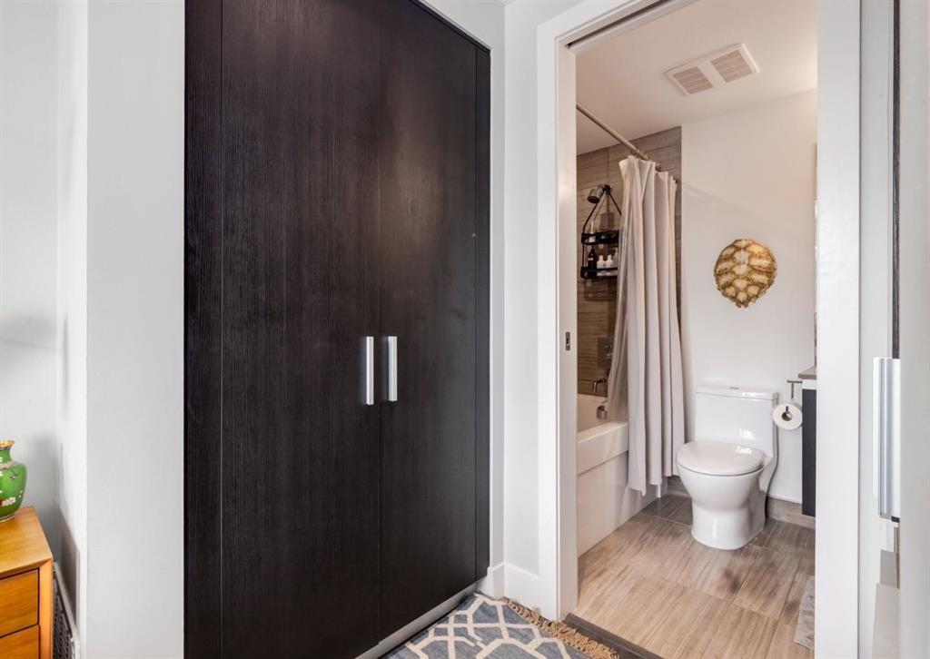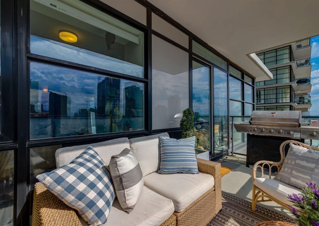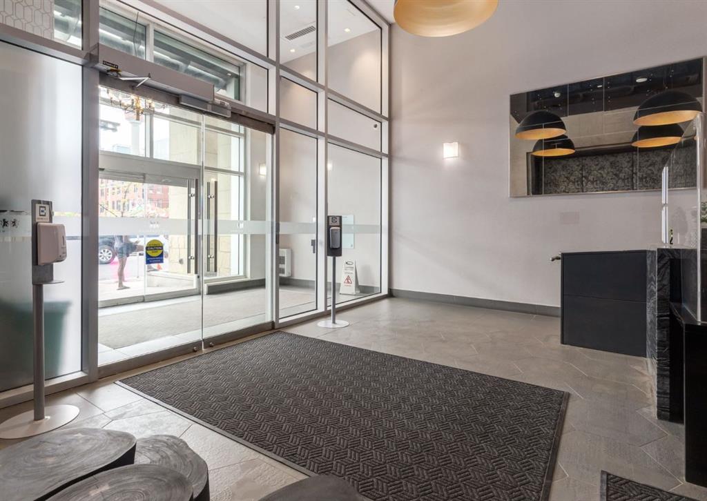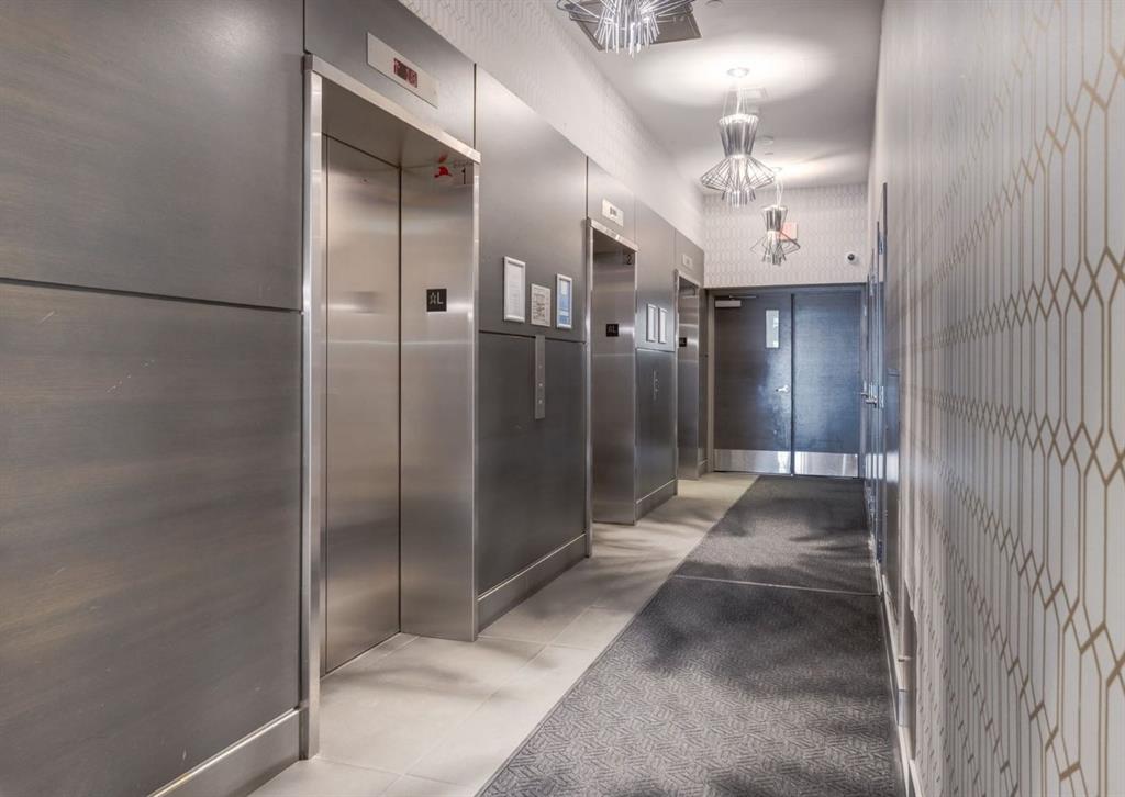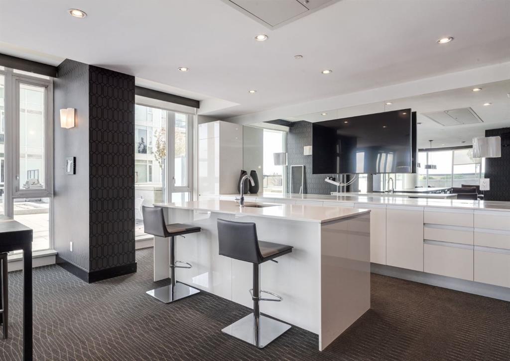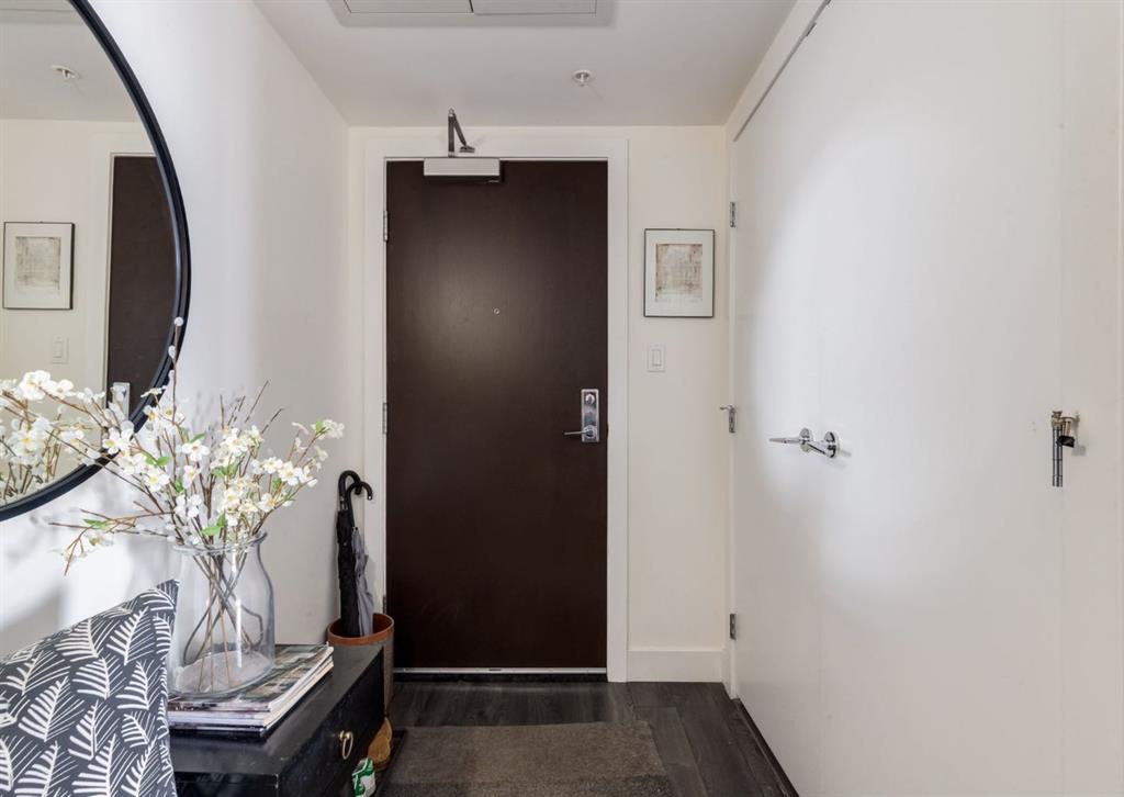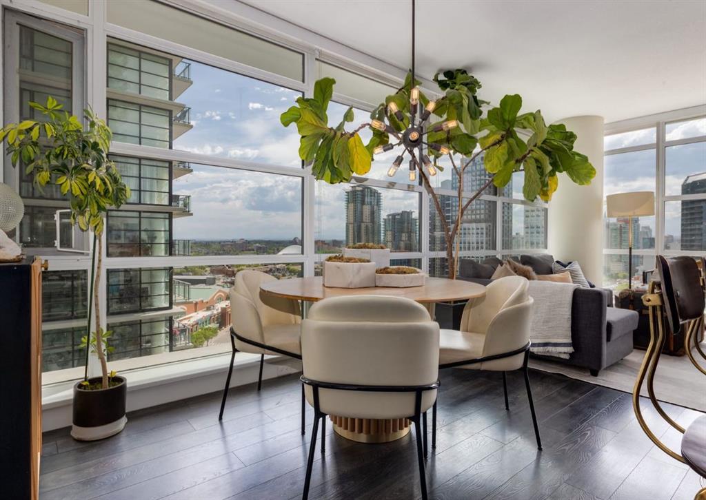 SW CORNER UNIT with MOUNTAIN VIEWS + CITY VIEWS + TANDEM PARKING! This bright and welcoming open-concept home is filled with natural light and offers 2 bedrooms, 2 full bathrooms, tandem titled parking for two vehicles, and a large balcony with breathtaking views you’ll enjoy every day. The modern kitchen features sleek cabinetry, stainless steel appliances including panelled refrigeration, quartz countertops, and plenty of storage. The primary bedroom easily fits a king-size bed and includes a walk-through closet with custom built-ins leading to a contemporary ensuite. The second bedroom is conveniently located next to a full 3-piece bathroom—perfect for guests, roommates, or a home office. Enjoy the perks of this executive concrete building, which offers concierge service, a fitness centre, party room, rooftop terrace, workshop, air conditioning, high-speed elevators, visitor parking, and a separate assigned storage locker. Impeccably maintained by its original owners, this move-in-ready home is also pet friendly (with board approval) and ideally located—just steps from Pixel Park, river pathways, the LRT, Stampede Grounds, Central Library, restaurants, cafes, shops, and groceries. Floor plans and a 3D tour are readily available, providing a glimpse into this stylish condo!