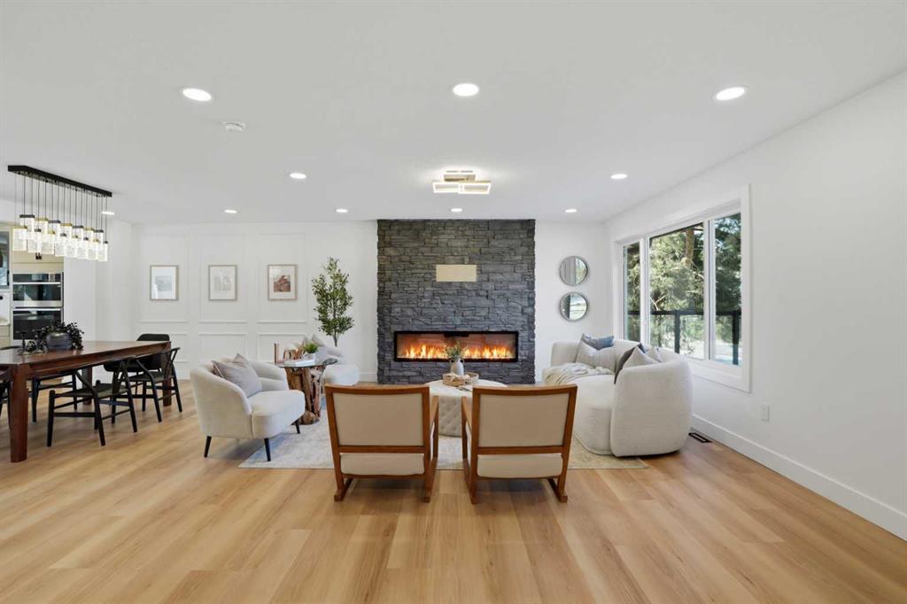 Elegant wood moulding in the dining area adds a rich, upscale touch, while the living room is anchored by a full-height stone feature wall with an electric fireplace, creating a warm yet sophisticated atmosphere.