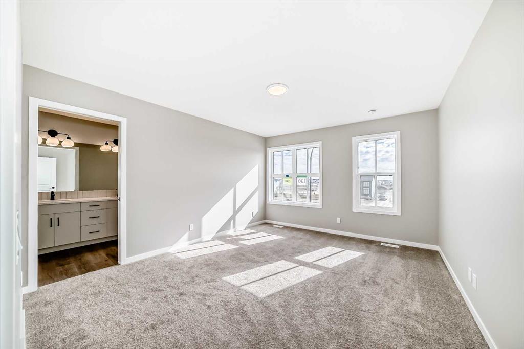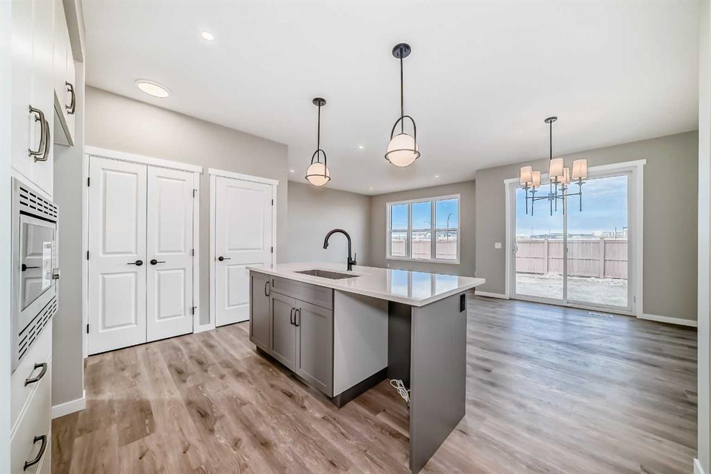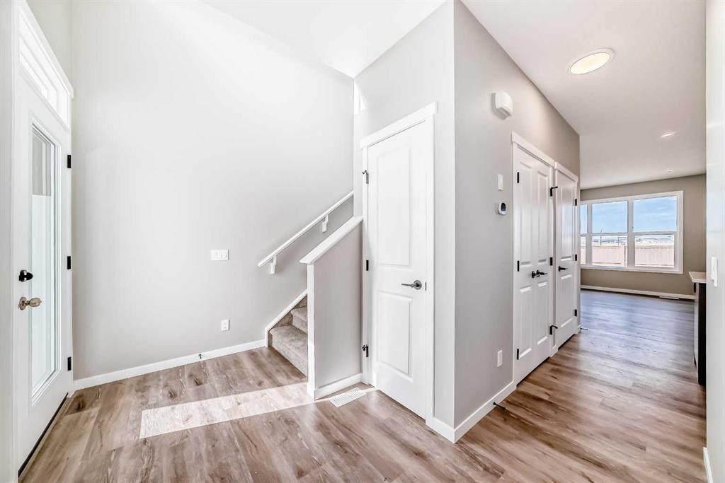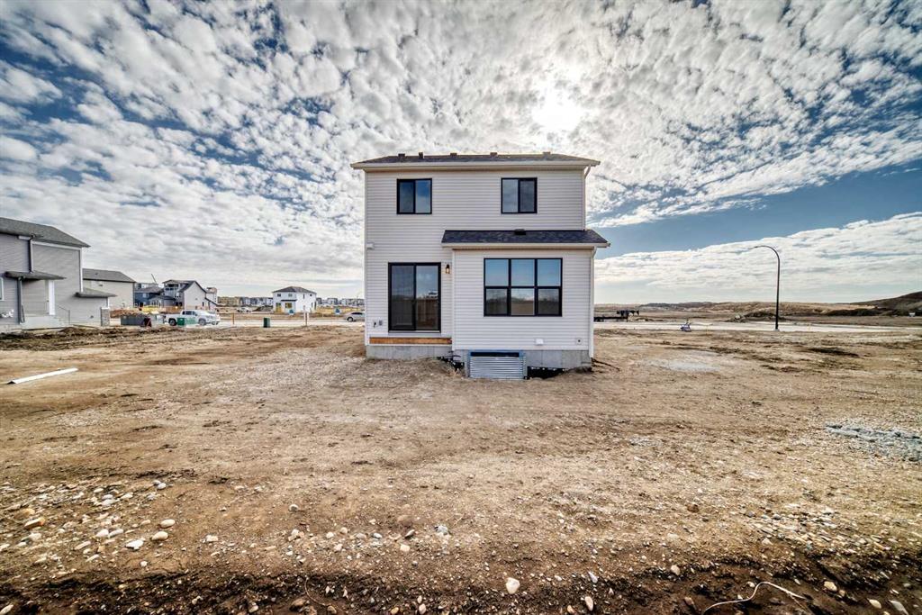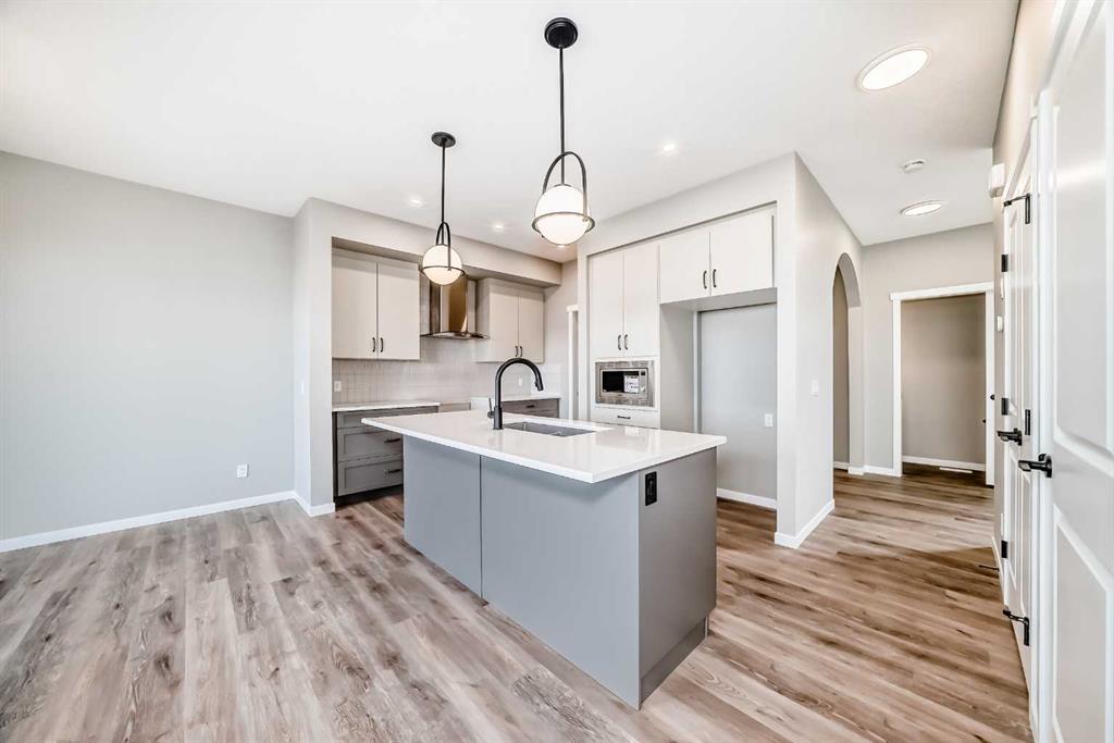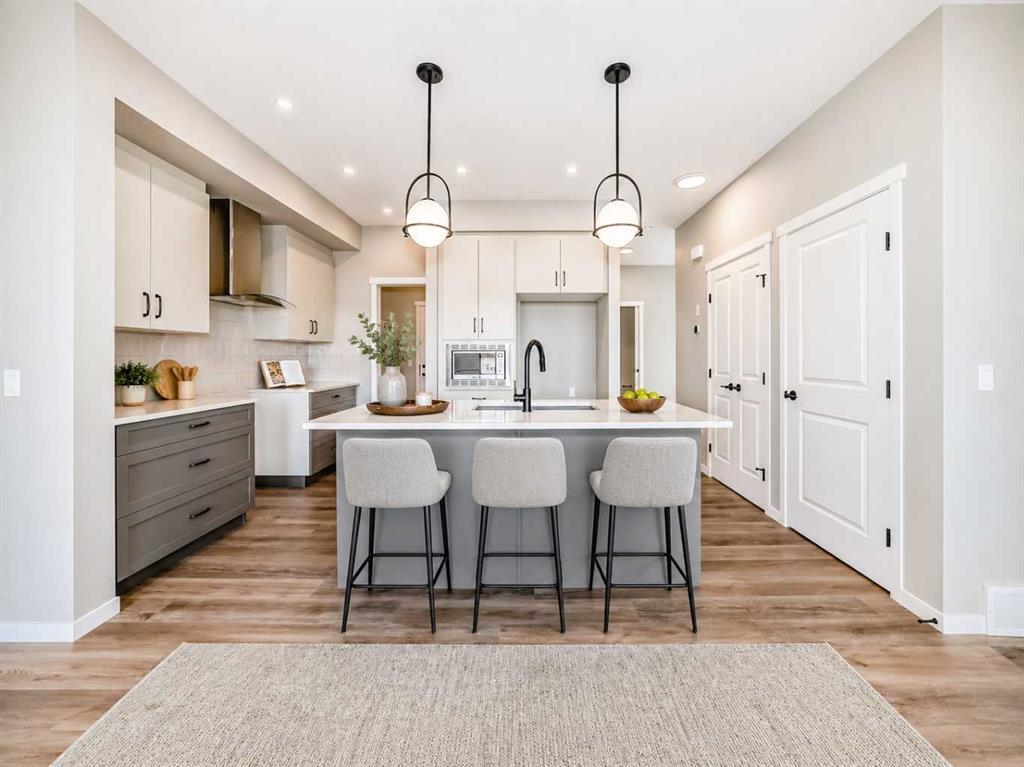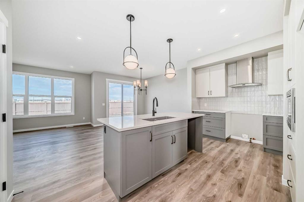 Introducing the Carisa 2 by Hopewell Residential, a beautifully designed home that blends modern style, everyday function, and thoughtful future-ready features in one of southeast Calgary’s most exciting new communities. Located on a quiet street in Rangeview, this home sits on a large lot with a west-facing backyard, giving you the perfect setting for sunny afternoons, evening BBQs, and relaxed outdoor living. An exterior gas line is already in place for your future BBQ setup. Inside, the main floor feels bright, open, and intentionally designed, with durable vinyl plank flooring flowing throughout for a clean, cohesive look. The open-concept layout connects the kitchen, dining area, and extended lifestyle room with ease, creating a space that works beautifully for both everyday living and entertaining. A charming arch detail leads into the front flex room, adding character and giving you a versatile space that can function as a home office, reading room, kids’ play area, or homework zone. The upgraded kitchen is a standout, offering a stylish two-tone cabinet design with grey lowers and white uppers, matte black hardware throughout, quartz countertops, upgraded pendant lights above the island, a built-in microwave, stand-alone hood fan, and a classic white square tile backsplash. A gas line rough-in has also been added for a future gas stove, giving the kitchen even more long-term flexibility. Upstairs, the home continues to deliver with a versatile entertainment room enhanced by an added stairwell window, bringing in even more natural light. The centrally located laundry room adds convenience, while the spacious primary suite offers a large walk-in closet and a polished 4-piece ensuite featuring dual sinks, a stand-alone shower, white cabinetry, white quartz counters, and a white backsplash for a bright, clean finish. Two additional bedrooms complete the upper level, offering great flexibility for family, guests, or additional workspace. This home also includes a 9-foot foundation and a separate side entrance, opening the door to future development or potential suite possibilities (A secondary suite would be subject to approval and permitting by the city/municipality). Located in Calgary’s desirable southeast, Rangeview is more than just a neighbourhood, it’s a community built around connection, sustainability, and a shared love of food and nature. Inspired by Alberta’s rich agricultural heritage, Rangeview is Calgary’s first garden to table community, designed with community gardens, orchards, pathways, green spaces, and future gathering areas that encourage neighbours to connect. Market Square and Harvest Hall are planned to become central hubs for farmers’ markets, local food events, and community programming. You’re also just minutes from the amenities of Seton and Mahogany, including the world’s largest YMCA, South Health Campus, schools, shops, restaurants, and everyday services.