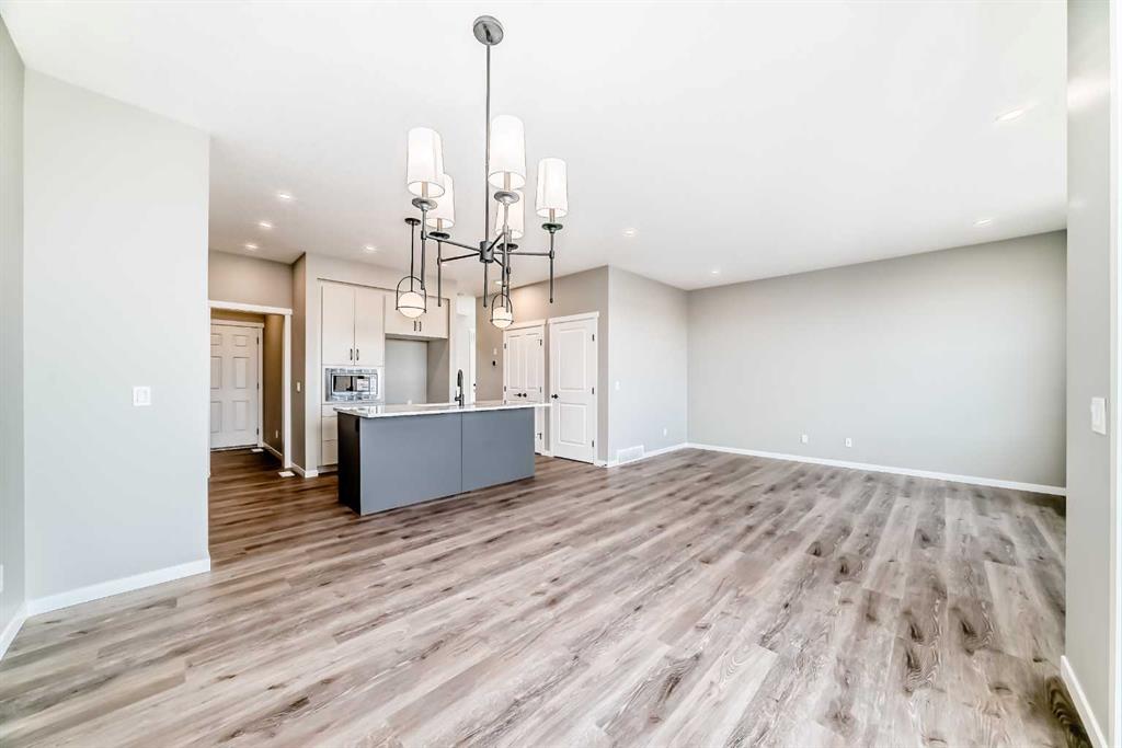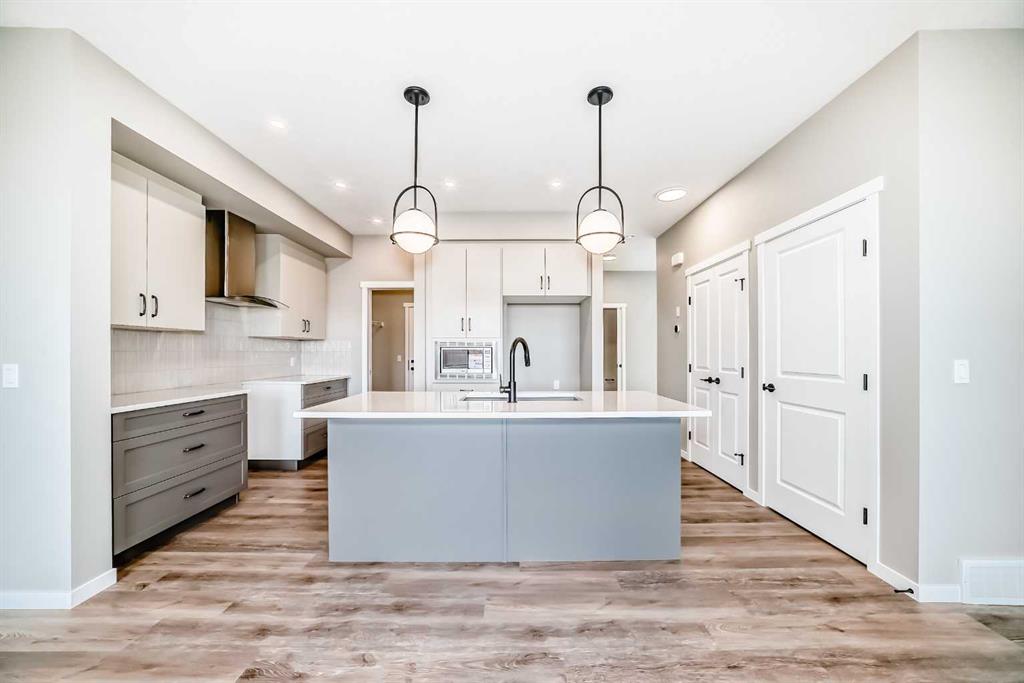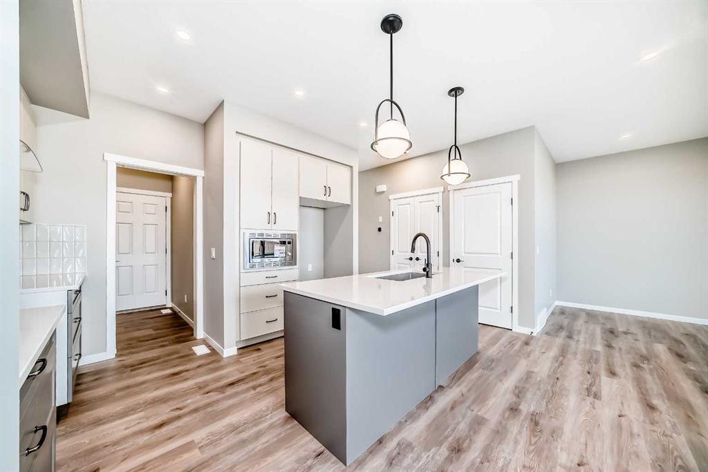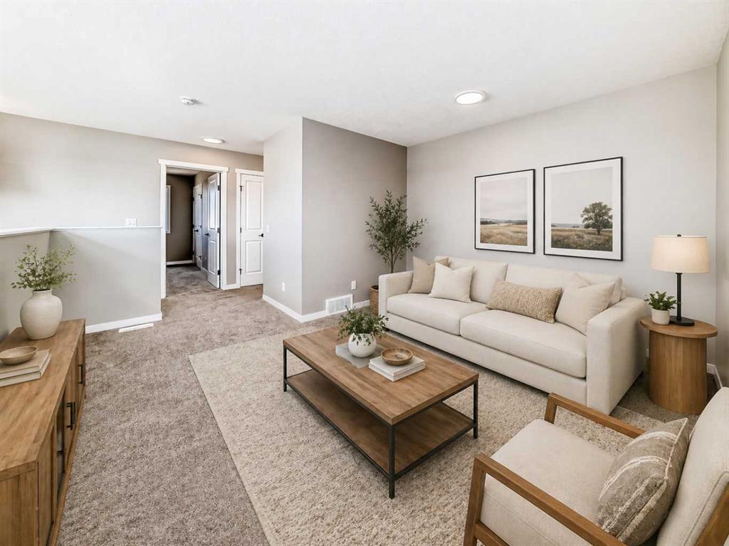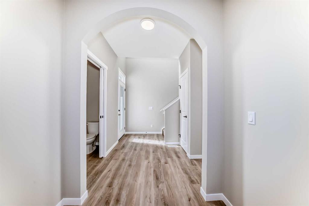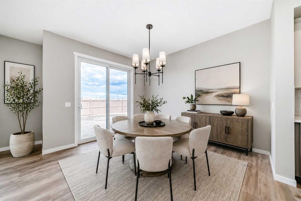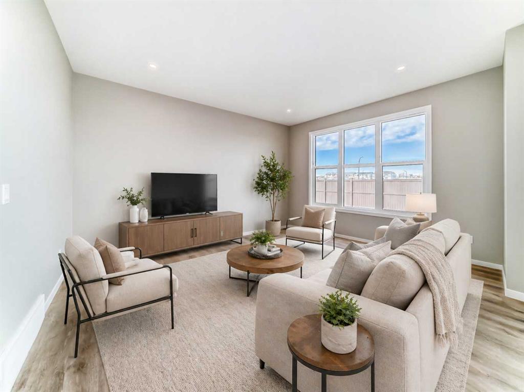 Introducing the Carisa 2 by Hopewell Residential, a beautifully designed home that blends modern style, everyday function, and thoughtful future-ready features in one of southeast Calgary’s most exciting new communities. Located on a quiet street in Rangeview, this home sits on a large lot with a west-facing backyard, giving you the perfect setting for sunny afternoons, evening BBQs, and relaxed outdoor living. An exterior gas line is already in place for your future BBQ setup. Inside, the main floor feels bright, open, and intentionally designed, with durable vinyl plank flooring flowing throughout for a clean, cohesive look. The open-concept layout connects the kitchen, dining area, and extended lifestyle room with ease, creating a space that works beautifully for both everyday living and entertaining. A charming arch detail leads into the front flex room, adding character and giving you a versatile space that can function as a home office, reading room, kids’ play area, or homework zone. The upgraded kitchen is a standout, offering a stylish two-tone cabinet design with grey lowers and white uppers, matte black hardware throughout, quartz countertops, upgraded pendant lights above the island, a built-in microwave, stand-alone hood fan, and a classic white square tile backsplash. A gas line rough-in has also been added for a future gas stove, giving the kitchen even more long-term flexibility. Upstairs, the home continues to deliver with a versatile entertainment room enhanced by an added stairwell window, bringing in even more natural light. The centrally located laundry room adds convenience, while the spacious primary suite offers a large walk-in closet and a polished 4-piece ensuite featuring dual sinks, a stand-alone shower, white cabinetry, white quartz counters, and a white backsplash for a bright, clean finish. Two additional bedrooms complete the upper level, offering great flexibility for family, guests, or additional workspace. This home also includes a 9-foot foundation and a separate side entrance, opening the door to future development or potential suite possibilities (A secondary suite would be subject to approval and permitting by the city/municipality). Located in Calgary’s desirable southeast, Rangeview is more than just a neighbourhood, it’s a community built around connection, sustainability, and a shared love of food and nature. Inspired by Alberta’s rich agricultural heritage, Rangeview is Calgary’s first garden to table community, designed with community gardens, orchards, pathways, green spaces, and future gathering areas that encourage neighbours to connect. Market Square and Harvest Hall are planned to become central hubs for farmers’ markets, local food events, and community programming. You’re also just minutes from the amenities of Seton and Mahogany, including the world’s largest YMCA, South Health Campus, schools, shops, restaurants, and everyday services.