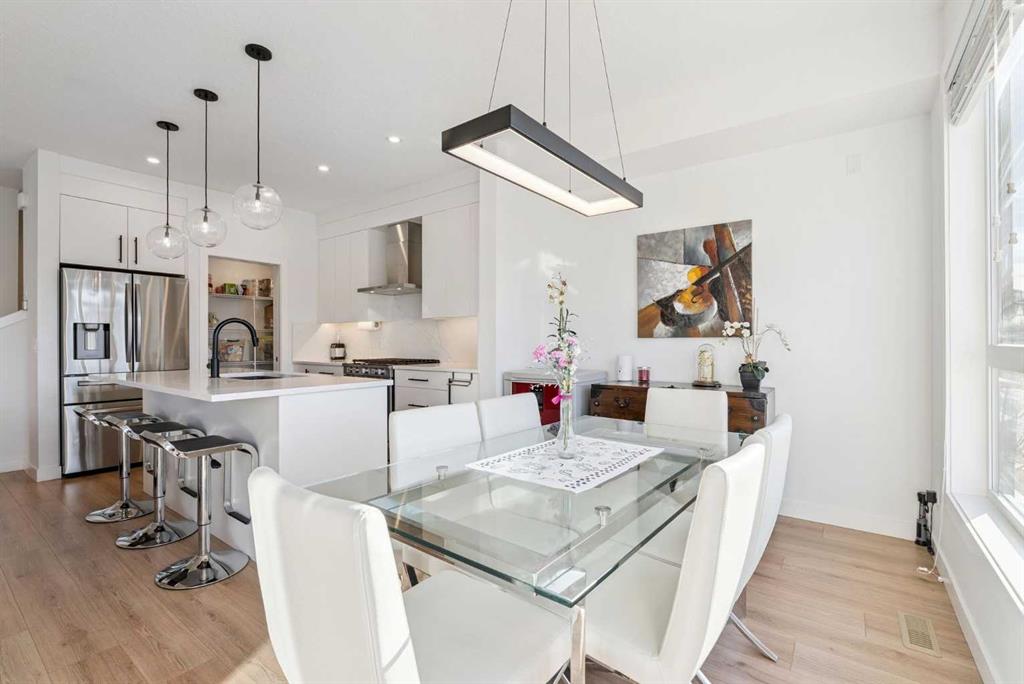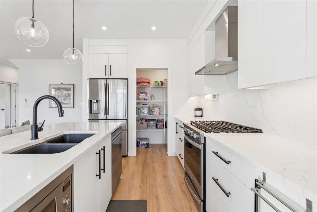 *** OPEN HOUSE May 2 SAT 1:30pm-3:30pm & May 3 SUN 2:00pm-4:00pm. Absolutely the lowest price ever! Priced for a quick sale! This END UNIT luxury townhouse with over 2,400 sqft living space offers total 4 bedrooms, 3.5 bathrooms with fully developed walk-out basement, plus heated double (side-by-side) attached garage. The ARCOLA by Truman, a contemporary community, is more than just a typical townhouse, but it is a luxury lifestyle home where you can enjoy convenience without compromising its style and square footage. As you enter the home, the gorgeous tiled foyer welcomes you with an open-concept, 9ft ceiling, and designer finishes. Luxury vinyl plank flooring throughout all three levels, and no more ugly carpet here. The spacious living room is filled with natural light and provides ample space for relaxing and entertaining. The kitchen is showcasing quartz countertops, premium stainless steel appliances pkg, including a T-shaped chimney and gas stove, generous cabinetry, a spacious corner pantry, and a large central island with a breakfast nook. The dining area is surrounded by loads of windows, and a powder room completes the main level. Off to the balcony for morning coffee with your favorite books or alfresco lunch or evening wines. Upstairs, retreat to a spacious primary bedroom featuring a walk-in closet and a spa-inspired 5-piece ensuite with dual sinks and a deep soaker tub on a gorgeous tiled floor. Step out to a dedicated balcony from your bedroom to enjoy the mountain view and fresh breeze. Two more bedrooms are big enough for kids or adults, each with its own walk-in closet, and sharing a 4pc bathroom. There is a convenient upper-level laundry room with shelves. Fully developed WALK-OUT basement expands your living space with a 9 ft ceiling and a huge family room for a home theater, home office, and/or home gym. The 4th bedroom and another 4pc bathroom are perfect for overnight guests, teenage children, or to rent out for additional income. The heated double garage can fit two cars and still provides additional storage space for all your seasonal gear. For more comfortable living, value-added features are garburator, ceiling fan, and air conditioner. The layout of this home was one of the top sellers, and it does not come to the market very often. Not to mention - just a few minutes’ drive to the top-rated schools, Westside Rec Centre, parks, playgrounds, grocery shops, restaurants, cafes, major roads, and public transit to offer the ultimate balance of lifestyle and accessibility. Don't miss this golden opportunity. Book your showing today