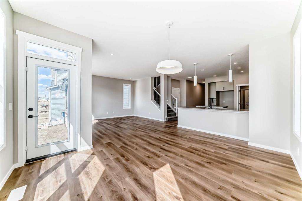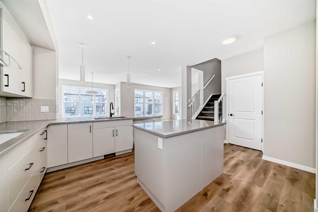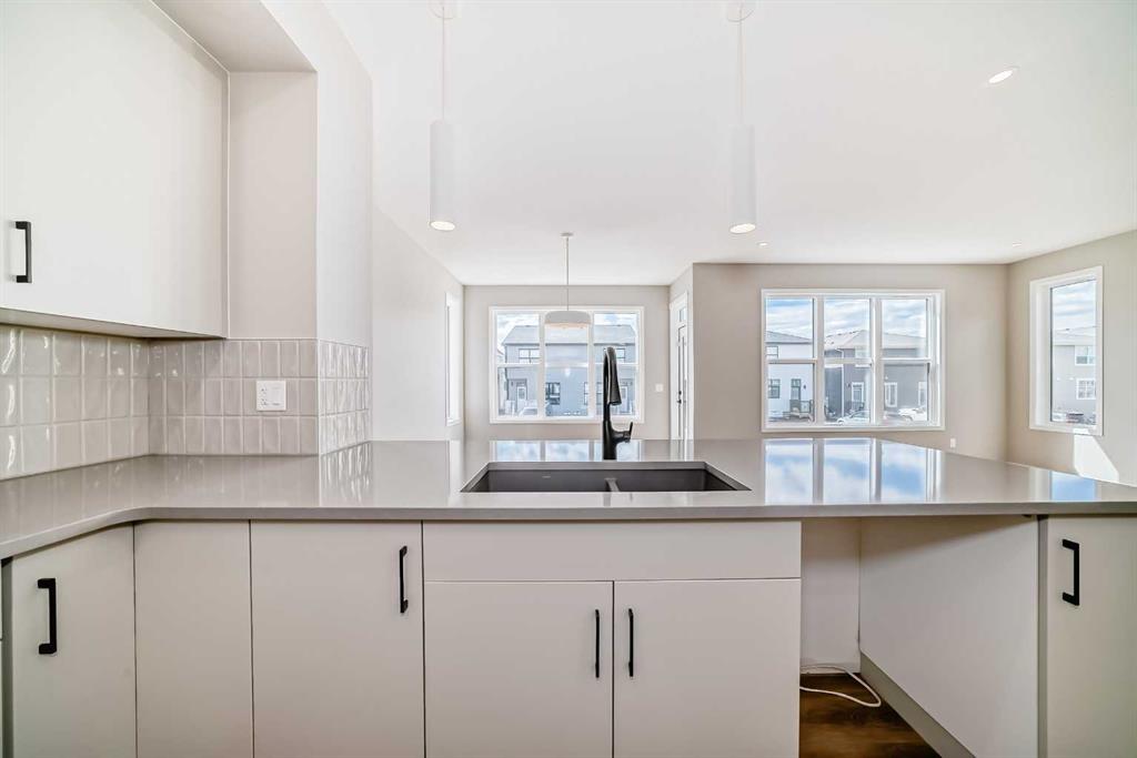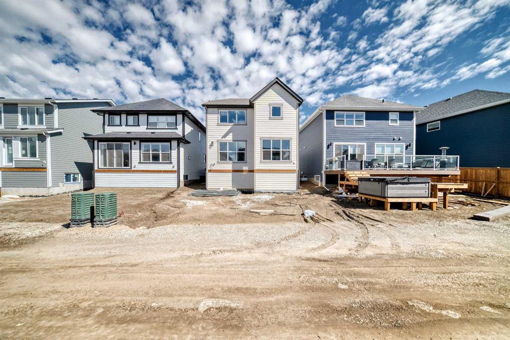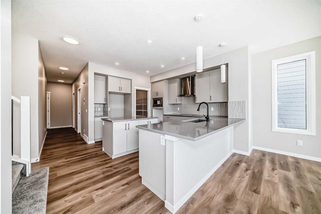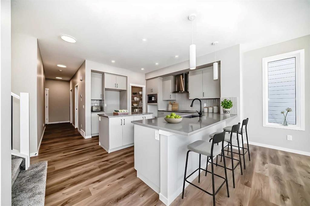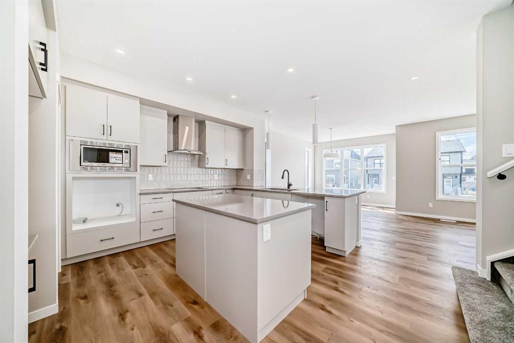 Step into the Castella by Hopewell Residential, a thoughtfully designed 3 bedroom home that blends everyday function, timeless finishes, and bright, comfortable living spaces in all the right ways. With vinyl plank flooring throughout the main floor, upgraded black railing, black hardware, and a clean modern palette, this home offers a stylish look without feeling overdone. The main floor is designed for real life, with a versatile front flex room that works beautifully as a home office, reading area, playroom, or homework zone. From there, the home opens into a bright and inviting layout filled with natural light, thanks to added windows in both the lifestyle room and dining area. The south facing backyard brings even more sunshine into the home, creating a warm and welcoming feel throughout the day. At the heart of the home, the upgraded kitchen offers both style and function with classic white cabinetry, grey quartz countertops, vertically stacked hammered subway tile, black hardware, and a standout chimney hood fan wrapped in tile. The appliance package includes a countertop stove, built-in oven, built-in microwave, and a layout designed for everyday convenience. Peninsula seating provides a casual spot for breakfast or conversation, while the separate prep island adds extra workspace and flexibility. The dining area offers plenty of room to gather, while the lifestyle room is bright, open, and comfortable, with added pot lights and extra windows that help make the entire main floor feel airy and inviting. The upgraded railing continues upstairs, adding a polished finish to the home’s overall design. Upstairs, the Castella floor plan continues to impress with a central bonus room that creates separation between the primary suite and the secondary bedrooms. The spacious primary bedroom is complete with a walk-in closet and a well appointed ensuite featuring a centre tub with dual sinks flanking each side, creating a functional and elevated layout with a spa inspired feel. Two additional bedrooms provide excellent space for kids, guests, or a growing family, while upper floor laundry adds everyday convenience exactly where you need it. Additional features include durable Hardie Board siding, a side entrance, added windows in the unfinished basement, and a sunshine basement that offers excellent potential for future development. The separate side entrance also provides future suite potential (A secondary suite would be subject to approval & permitting by the city/municipality). Located in Mahogany, one of Calgary’s most sought-after lake communities, this home is surrounded by a lifestyle that is hard to match. Residents enjoy access to Mahogany’s 4-season lake, beaches, pathways, parks, playgrounds, wetlands, and vibrant community amenities. With nearby schools, shopping, restaurants, and everyday conveniences, Mahogany offers the perfect blend of outdoor living, family-friendly amenities, and urban convenience.