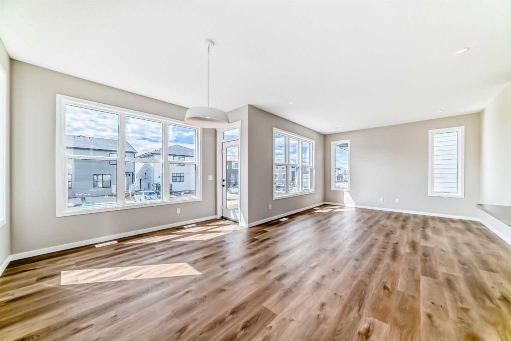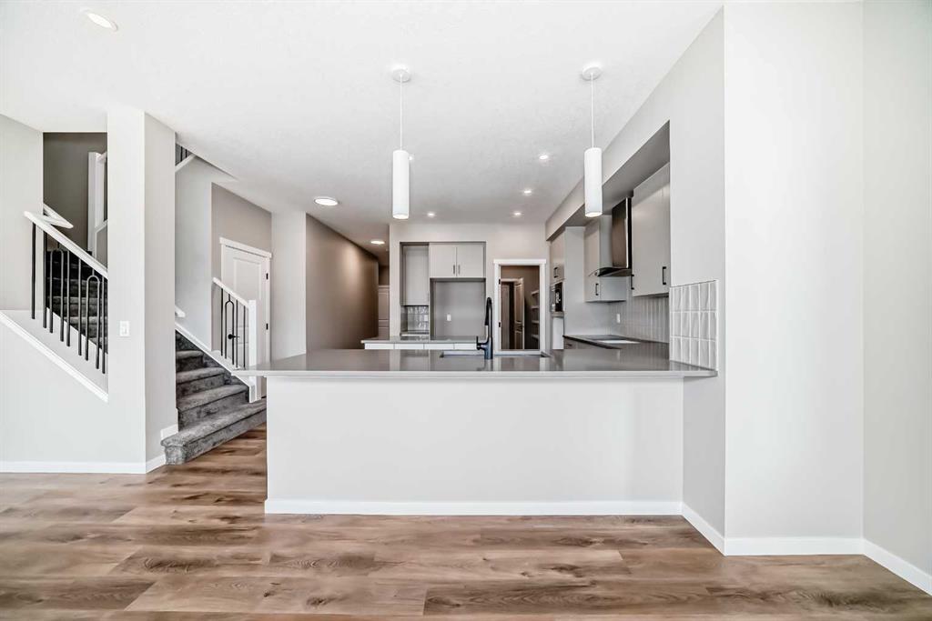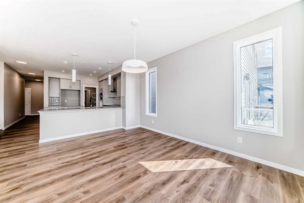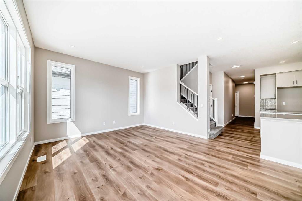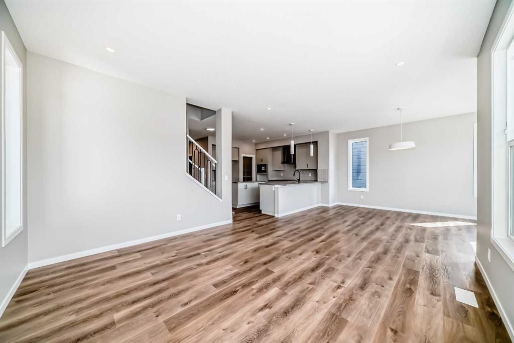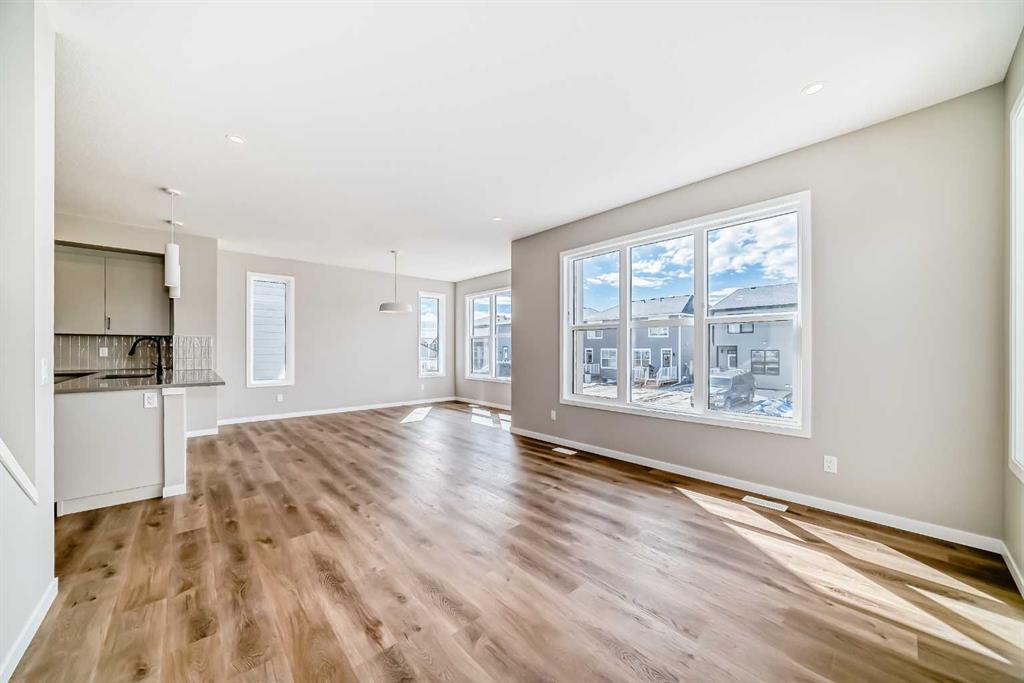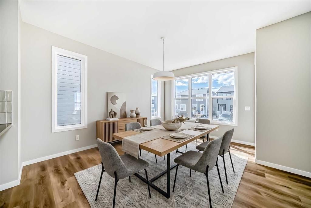 Step into the Castella by Hopewell Residential, a thoughtfully designed 3 bedroom home that blends everyday function, timeless finishes, and bright, comfortable living spaces in all the right ways. With vinyl plank flooring throughout the main floor, upgraded black railing, black hardware, and a clean modern palette, this home offers a stylish look without feeling overdone. The main floor is designed for real life, with a versatile front flex room that works beautifully as a home office, reading area, playroom, or homework zone. From there, the home opens into a bright and inviting layout filled with natural light, thanks to added windows in both the lifestyle room and dining area. The south facing backyard brings even more sunshine into the home, creating a warm and welcoming feel throughout the day. At the heart of the home, the upgraded kitchen offers both style and function with classic white cabinetry, grey quartz countertops, vertically stacked hammered subway tile, black hardware, and a standout chimney hood fan wrapped in tile. The appliance package includes a countertop stove, built-in oven, built-in microwave, and a layout designed for everyday convenience. Peninsula seating provides a casual spot for breakfast or conversation, while the separate prep island adds extra workspace and flexibility. The dining area offers plenty of room to gather, while the lifestyle room is bright, open, and comfortable, with added pot lights and extra windows that help make the entire main floor feel airy and inviting. The upgraded railing continues upstairs, adding a polished finish to the home’s overall design. Upstairs, the Castella floor plan continues to impress with a central bonus room that creates separation between the primary suite and the secondary bedrooms. The spacious primary bedroom is complete with a walk-in closet and a well appointed ensuite featuring a centre tub with dual sinks flanking each side, creating a functional and elevated layout with a spa inspired feel. Two additional bedrooms provide excellent space for kids, guests, or a growing family, while upper floor laundry adds everyday convenience exactly where you need it. Additional features include durable Hardie Board siding, a side entrance, added windows in the unfinished basement, and a sunshine basement that offers excellent potential for future development. The separate side entrance also provides future suite potential (A secondary suite would be subject to approval & permitting by the city/municipality). Located in Mahogany, one of Calgary’s most sought-after lake communities, this home is surrounded by a lifestyle that is hard to match. Residents enjoy access to Mahogany’s 4-season lake, beaches, pathways, parks, playgrounds, wetlands, and vibrant community amenities. With nearby schools, shopping, restaurants, and everyday conveniences, Mahogany offers the perfect blend of outdoor living, family-friendly amenities, and urban convenience.