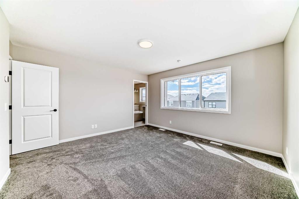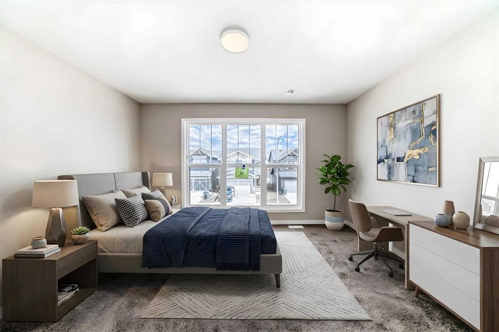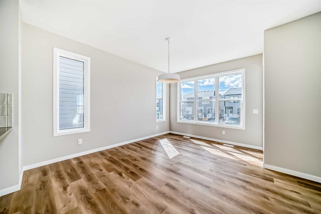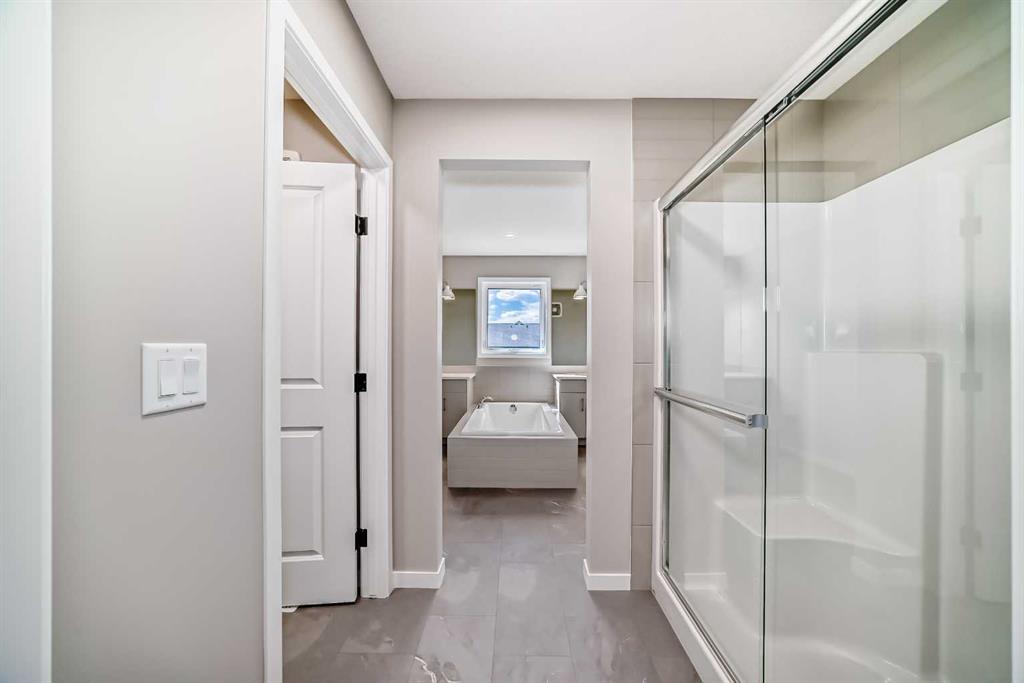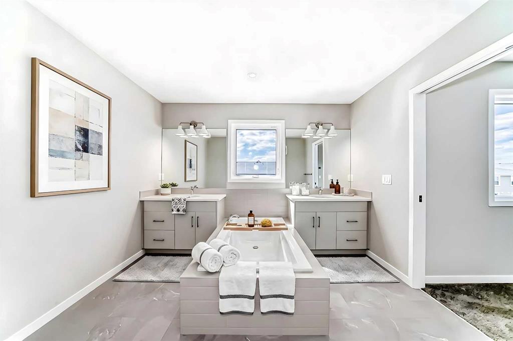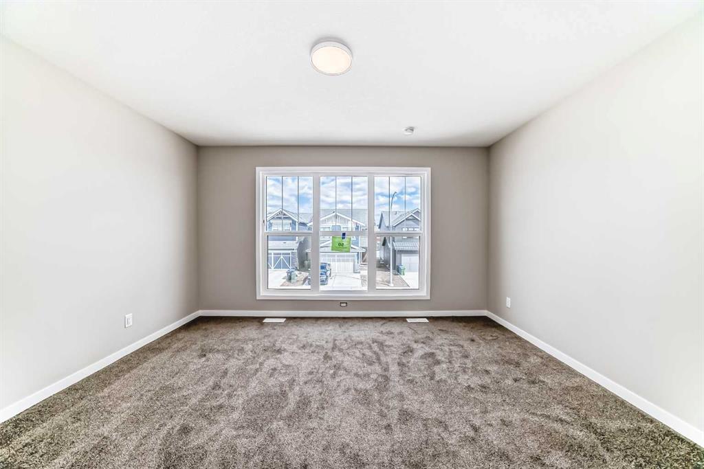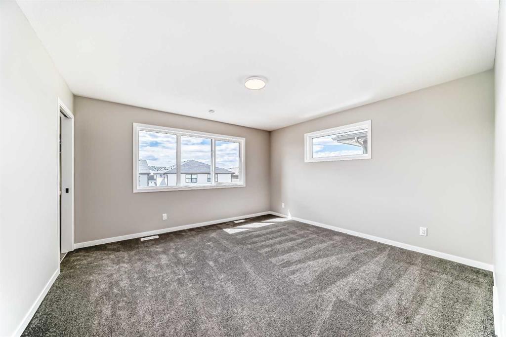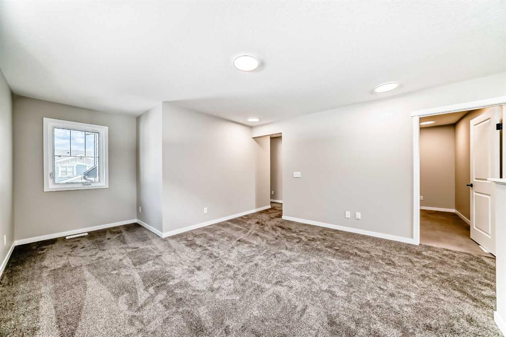 Step into the Castella by Hopewell Residential, a thoughtfully designed 3 bedroom home that blends everyday function, timeless finishes, and bright, comfortable living spaces in all the right ways. With vinyl plank flooring throughout the main floor, upgraded black railing, black hardware, and a clean modern palette, this home offers a stylish look without feeling overdone. The main floor is designed for real life, with a versatile front flex room that works beautifully as a home office, reading area, playroom, or homework zone. From there, the home opens into a bright and inviting layout filled with natural light, thanks to added windows in both the lifestyle room and dining area. The south facing backyard brings even more sunshine into the home, creating a warm and welcoming feel throughout the day. At the heart of the home, the upgraded kitchen offers both style and function with classic white cabinetry, grey quartz countertops, vertically stacked hammered subway tile, black hardware, and a standout chimney hood fan wrapped in tile. The appliance package includes a countertop stove, built-in oven, built-in microwave, and a layout designed for everyday convenience. Peninsula seating provides a casual spot for breakfast or conversation, while the separate prep island adds extra workspace and flexibility. The dining area offers plenty of room to gather, while the lifestyle room is bright, open, and comfortable, with added pot lights and extra windows that help make the entire main floor feel airy and inviting. The upgraded railing continues upstairs, adding a polished finish to the home’s overall design. Upstairs, the Castella floor plan continues to impress with a central bonus room that creates separation between the primary suite and the secondary bedrooms. The spacious primary bedroom is complete with a walk-in closet and a well appointed ensuite featuring a centre tub with dual sinks flanking each side, creating a functional and elevated layout with a spa inspired feel. Two additional bedrooms provide excellent space for kids, guests, or a growing family, while upper floor laundry adds everyday convenience exactly where you need it. Additional features include durable Hardie Board siding, a side entrance, added windows in the unfinished basement, and a sunshine basement that offers excellent potential for future development. The separate side entrance also provides future suite potential (A secondary suite would be subject to approval & permitting by the city/municipality). Located in Mahogany, one of Calgary’s most sought-after lake communities, this home is surrounded by a lifestyle that is hard to match. Residents enjoy access to Mahogany’s 4-season lake, beaches, pathways, parks, playgrounds, wetlands, and vibrant community amenities. With nearby schools, shopping, restaurants, and everyday conveniences, Mahogany offers the perfect blend of outdoor living, family-friendly amenities, and urban convenience.