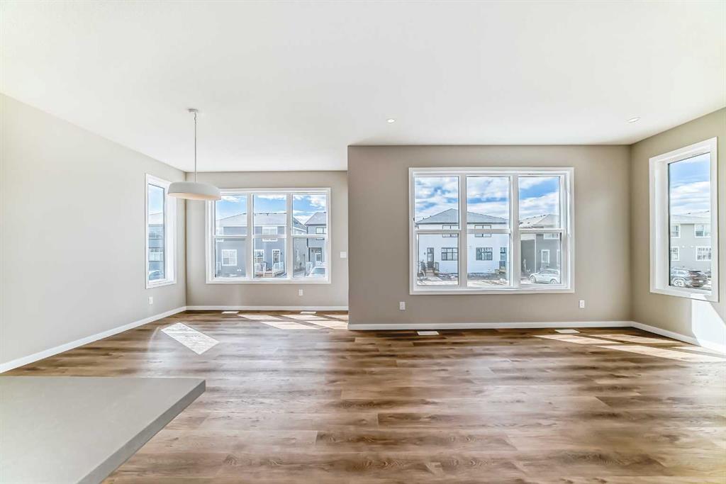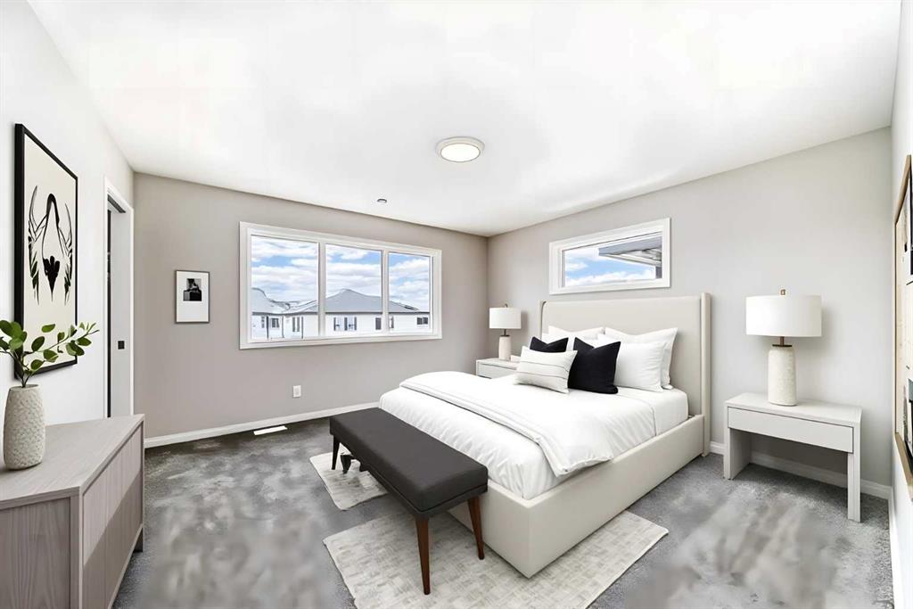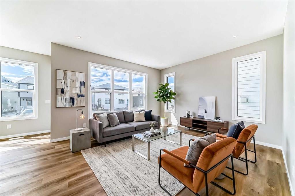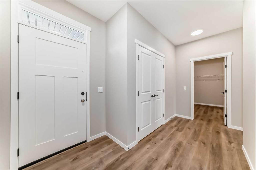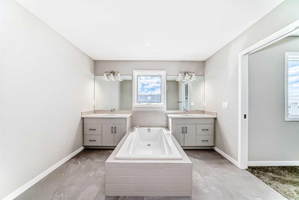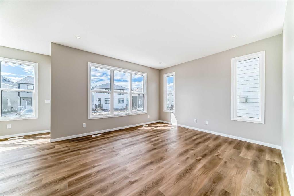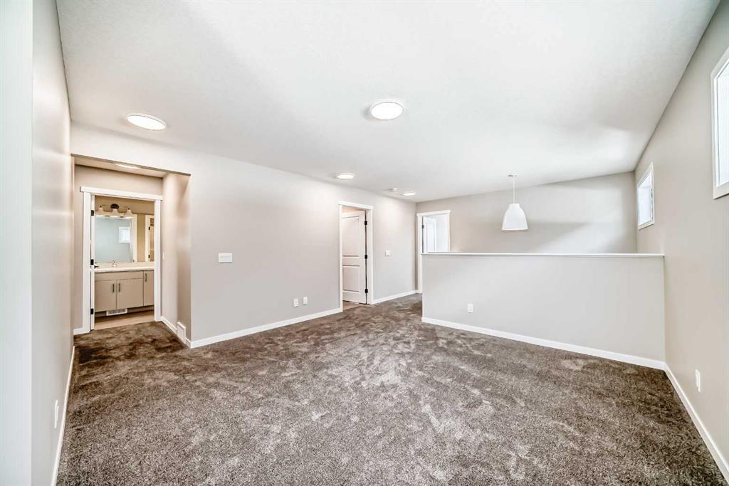 Step into the Castella by Hopewell Residential, a thoughtfully designed 3 bedroom home that blends everyday function, timeless finishes, and bright, comfortable living spaces in all the right ways. With vinyl plank flooring throughout the main floor, upgraded black railing, black hardware, and a clean modern palette, this home offers a stylish look without feeling overdone. The main floor is designed for real life, with a versatile front flex room that works beautifully as a home office, reading area, playroom, or homework zone. From there, the home opens into a bright and inviting layout filled with natural light, thanks to added windows in both the lifestyle room and dining area. The south facing backyard brings even more sunshine into the home, creating a warm and welcoming feel throughout the day. At the heart of the home, the upgraded kitchen offers both style and function with classic white cabinetry, grey quartz countertops, vertically stacked hammered subway tile, black hardware, and a standout chimney hood fan wrapped in tile. The appliance package includes a countertop stove, built-in oven, built-in microwave, and a layout designed for everyday convenience. Peninsula seating provides a casual spot for breakfast or conversation, while the separate prep island adds extra workspace and flexibility. The dining area offers plenty of room to gather, while the lifestyle room is bright, open, and comfortable, with added pot lights and extra windows that help make the entire main floor feel airy and inviting. The upgraded railing continues upstairs, adding a polished finish to the home’s overall design. Upstairs, the Castella floor plan continues to impress with a central bonus room that creates separation between the primary suite and the secondary bedrooms. The spacious primary bedroom is complete with a walk-in closet and a well appointed ensuite featuring a centre tub with dual sinks flanking each side, creating a functional and elevated layout with a spa inspired feel. Two additional bedrooms provide excellent space for kids, guests, or a growing family, while upper floor laundry adds everyday convenience exactly where you need it. Additional features include durable Hardie Board siding, a side entrance, added windows in the unfinished basement, and a sunshine basement that offers excellent potential for future development. The separate side entrance also provides future suite potential (A secondary suite would be subject to approval & permitting by the city/municipality). Located in Mahogany, one of Calgary’s most sought-after lake communities, this home is surrounded by a lifestyle that is hard to match. Residents enjoy access to Mahogany’s 4-season lake, beaches, pathways, parks, playgrounds, wetlands, and vibrant community amenities. With nearby schools, shopping, restaurants, and everyday conveniences, Mahogany offers the perfect blend of outdoor living, family-friendly amenities, and urban convenience.