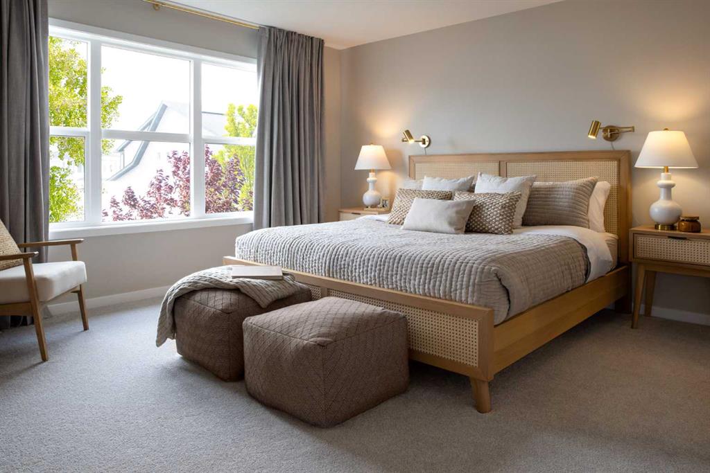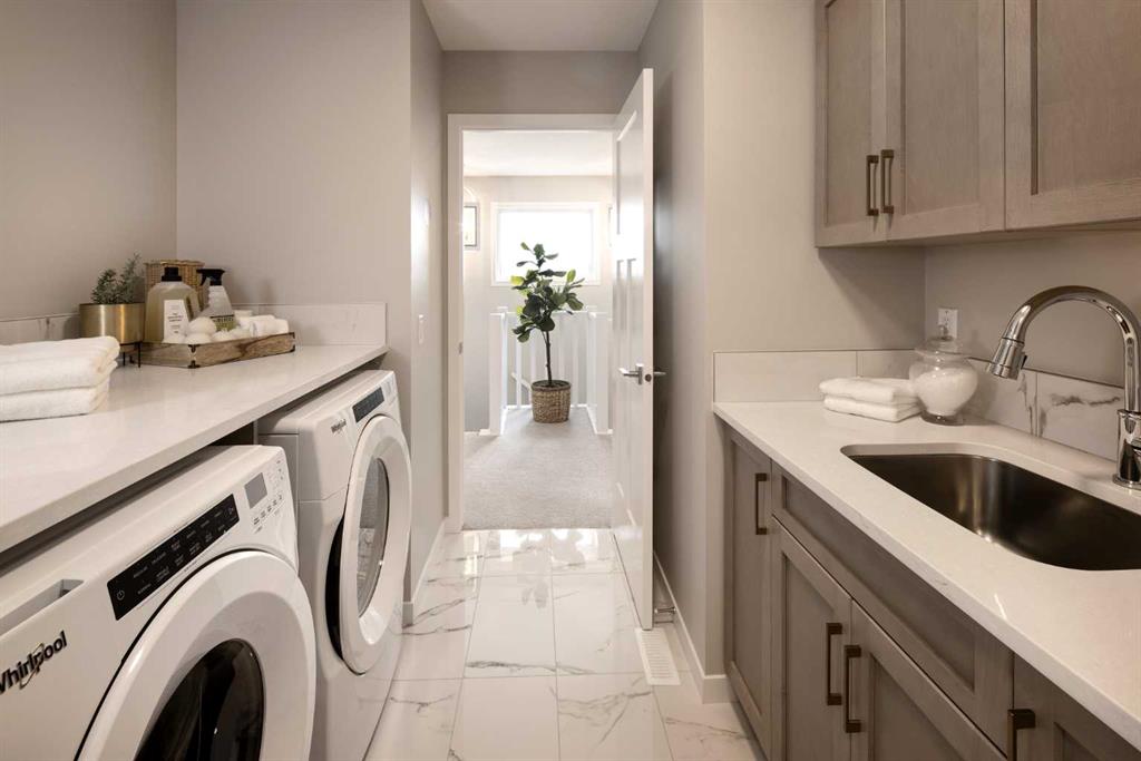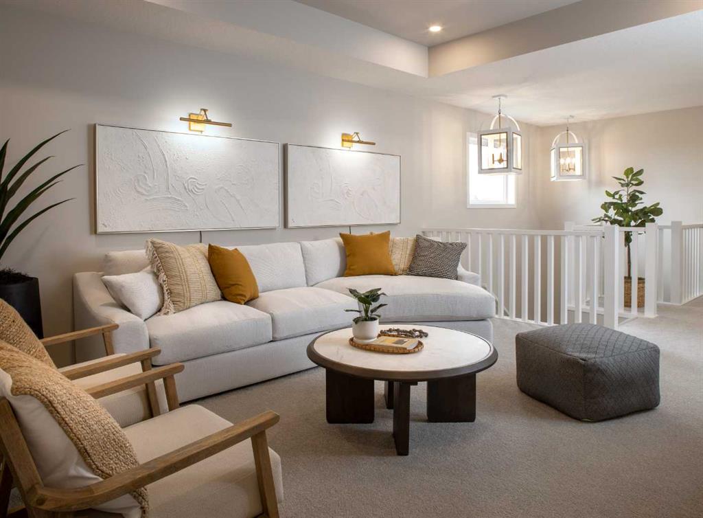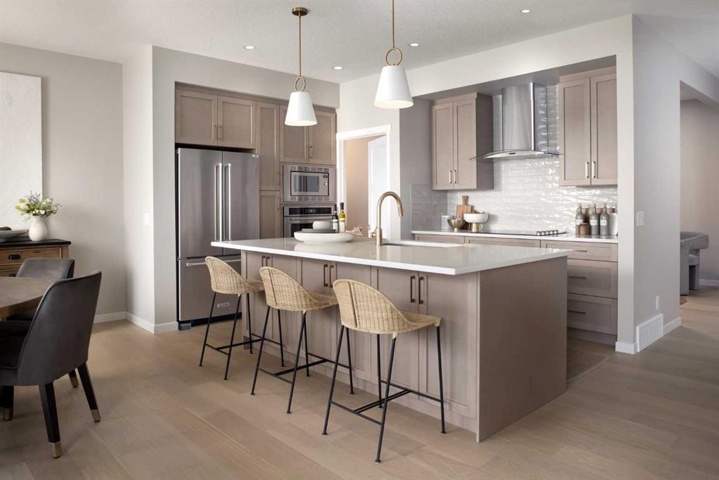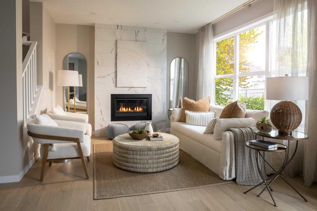 Welcome to The Lina by Hopewell Residential, a beautifully designed 4-bedroom home where elevated finishes, thoughtful function, and everyday comfort come together in one truly impressive package. From the moment you step inside, this home makes an impact with rich vinyl plank flooring, champagne gold hardware, designer lighting, and warm cabinetry that creates a refined yet welcoming feel throughout. At the front of the home, a versatile flex room offers the perfect space for a home office, reading lounge, kids’ playroom, or quiet morning coffee spot. Added pot lights elevate the space and create a warm, polished feel. As you move into the heart of the home, the upgraded kitchen layout immediately stands out. Featuring stainless steel appliances, a built-in microwave, quartz countertops, timeless subway tile, gas line rough-in for a future gas range, and a statement chimney hood fan, this kitchen blends style and function beautifully. The rear of the home is designed to feel bright, open, and connected, with an impressive wall of windows that fills the main floor with natural light. Pot lights in the kitchen add to the bright, elevated feel, while the spacious dining area easily accommodates family dinners and larger gatherings. Sliding French patio doors extend the living space outdoors to the south-facing backyard, giving you a sunny outdoor space for summer evenings, weekend barbecues, and future backyard plans. The living room is anchored by a striking gas fireplace with mantel, Carrara marble-style tile surround, and media wiring above, creating the perfect focal point for cozy nights in, holiday décor, or everyday family living. A side entrance adds valuable flexibility for future basement development options. Upstairs, upgraded railing along the stairs, upper hall, and entertainment room creates an open, elevated feel as you arrive on the second level. The stunning central entertainment room is thoughtfully positioned to create separation between the primary retreat and the secondary bedrooms. With added windows, a tray ceiling, and plenty of room to gather, this space feels bright, comfortable, and beautifully finished. The oversized primary suite is filled with natural light and feels like a true retreat. The luxurious 5-piece ensuite features a freestanding tub centered between dual vanities, marble-style tile, a standalone shower, and elevated finishes that bring a spa-inspired feel to your daily routine. The generous walk-in closet connects directly to the laundry room, adding a level of convenience that makes everyday living easier. On the opposite side of the entertainment room, three spacious bedrooms provide plenty of room for kids, guests, or growing families, ensuring everyone has their own comfortable space. All this located in the desirable Lake community of Mahogany. **Photos are from the show home/previous builds to demonstrate quality of construction & finishes and may not be an exact representation of this home**