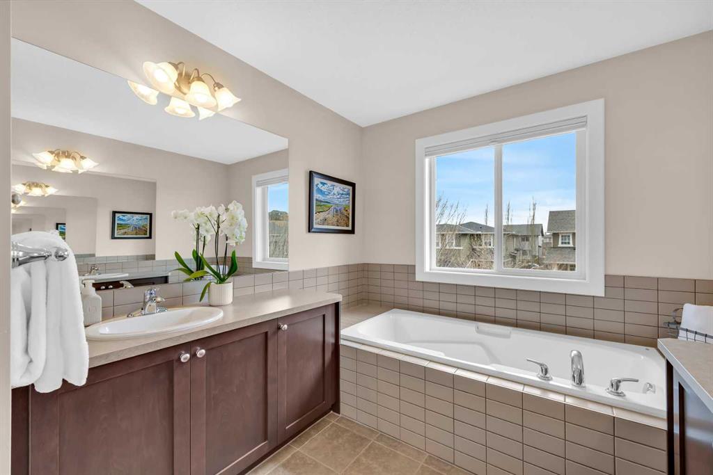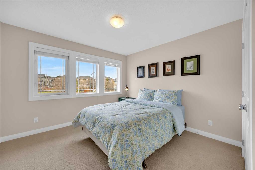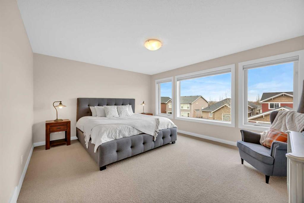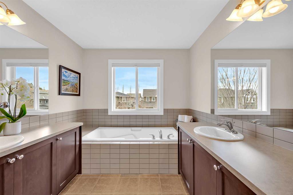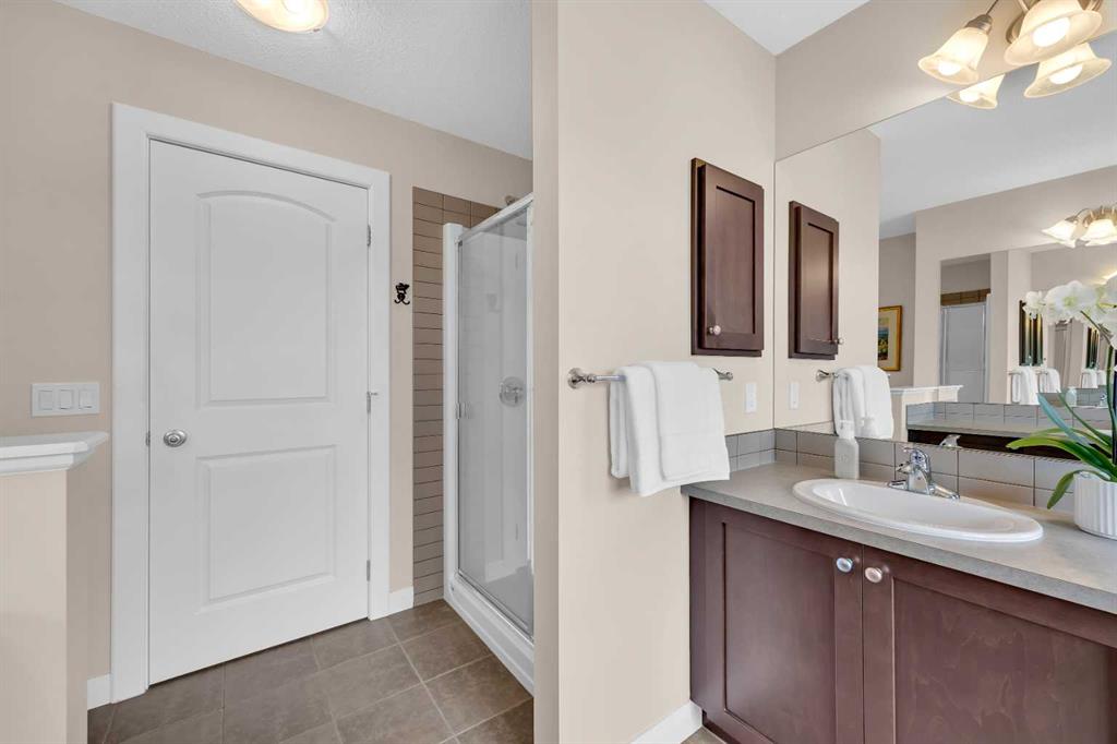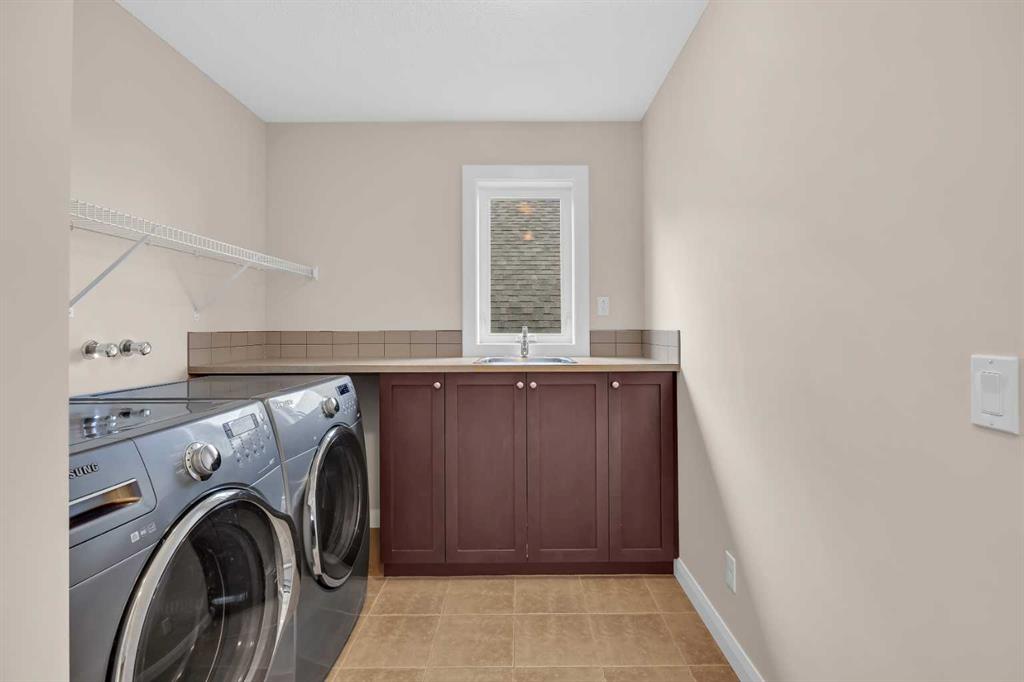 Upstairs, the expansive primary retreat offers a raised sleeping area, Hunter Douglas blackout blinds with top-down/bottom-up functionality, a spacious walk-in closet, and a luxurious 5-piece ensuite. Two additional generously sized bedrooms—both with park views—are serviced by a 4-piece bathroom. The upper-level laundry room is exceptionally well-equipped with cabinetry, counter space, shelving, and a sink.