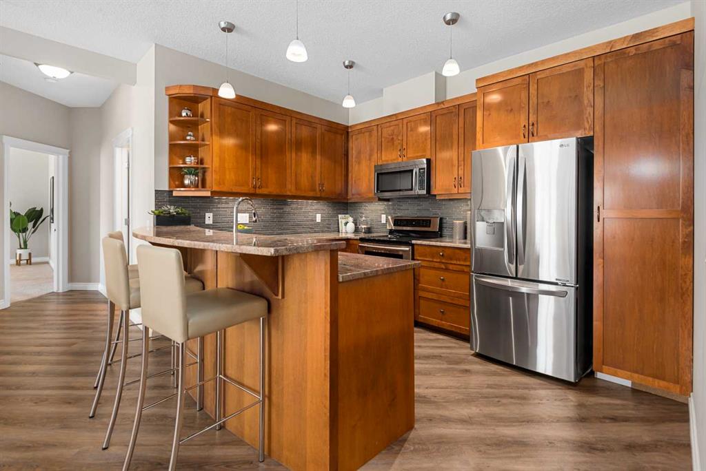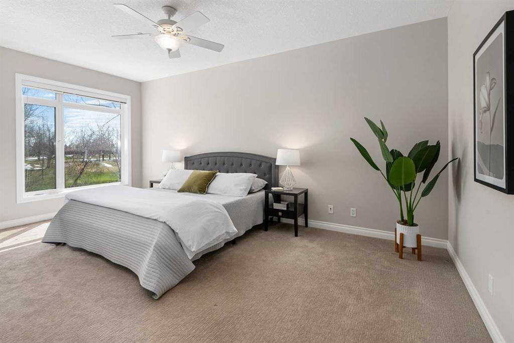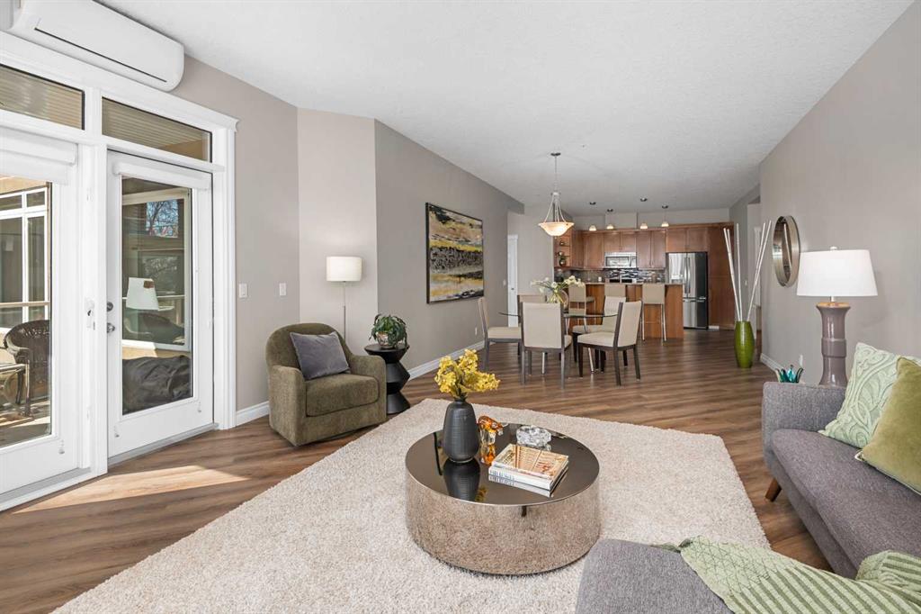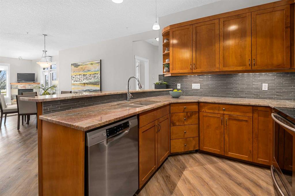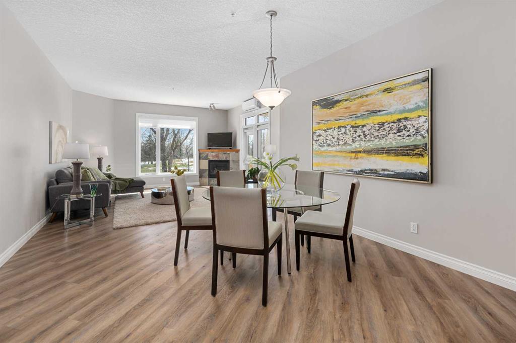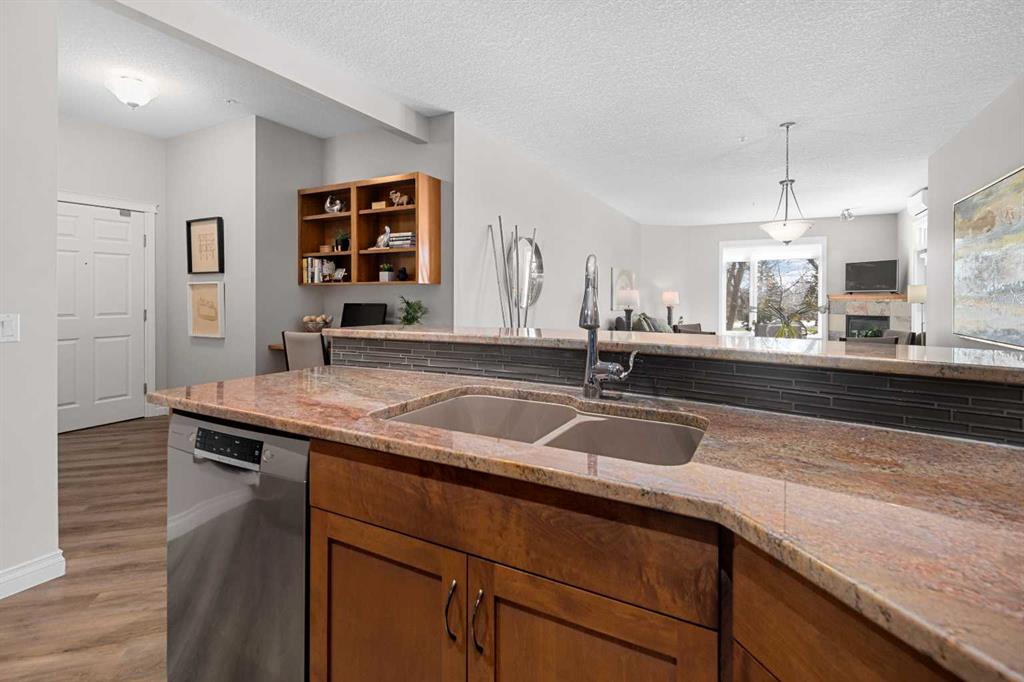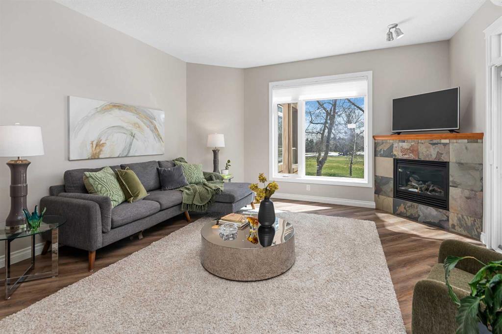 Welcome to Copperwood II—where refined living meets an exceptional natural setting. This immaculate, fully updated 1,340 sq. ft. residence offers a rare opportunity to enjoy style, comfort, and a truly unmatched location backing directly onto the tranquil Shaganappi Golf Course. What truly sets this home apart is its thoughtfully designed layout with no wasted space, allowing every square foot to be both functional and elegant. Expansive windows showcase beautiful, private views while filling the home with natural light, enhanced by 9-foot ceilings, Hunter Douglas window coverings, and fresh, modern paint throughout. The interior has been tastefully upgraded to reflect both quality and sophistication. Highlights include new luxury vinyl plank flooring (2022), a refaced fireplace, and custom California Closets. A dedicated office space features built-in cabinetry, ideal for today’s work-from-home lifestyle. The kitchen is both stylish and practical, offering light granite countertops, a newer backsplash, and stainless steel appliances—all updated within the past five years. Both bathrooms have been refreshed with matching contemporary plumbing fixtures for a cohesive finish. Comfort is prioritized year-round with in-floor heating, a powerful 2-ton A/C unit, and a convenient BBQ gas line for outdoor enjoyment. The home also includes an oversized titled underground parking stall in an ideal location near the elevator, along with a generous 4' x 10' private storage unit. Copperwood II is a well-managed, financially strong, and exceptionally quiet complex known for its quality of living. Residents enjoy a full range of amenities, including secure bike storage, a car wash bay, a fully equipped fitness centre, a woodshop, and a guest suite. Condo fees remain very reasonable, supported by a proactive and reliable board. The location is truly second to none—offering the peace and privacy of a golf course setting while being just minutes from downtown, grocery stores, the LRT, major roadways, and an extensive network of walking and biking paths. In the winter months, step outside to enjoy cross-country skiing or snowshoeing right from your doorstep.